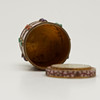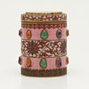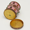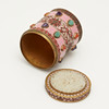 Zylinderförmige Dose aus Messing mit floral-ornamentalem Cloisonné-Dekor, mit Amethyst, Türkis und Feueropal besetzt, Deckel mit durchbrochenem Jadebesatz verziert, H.10cm, D.7,5cm.