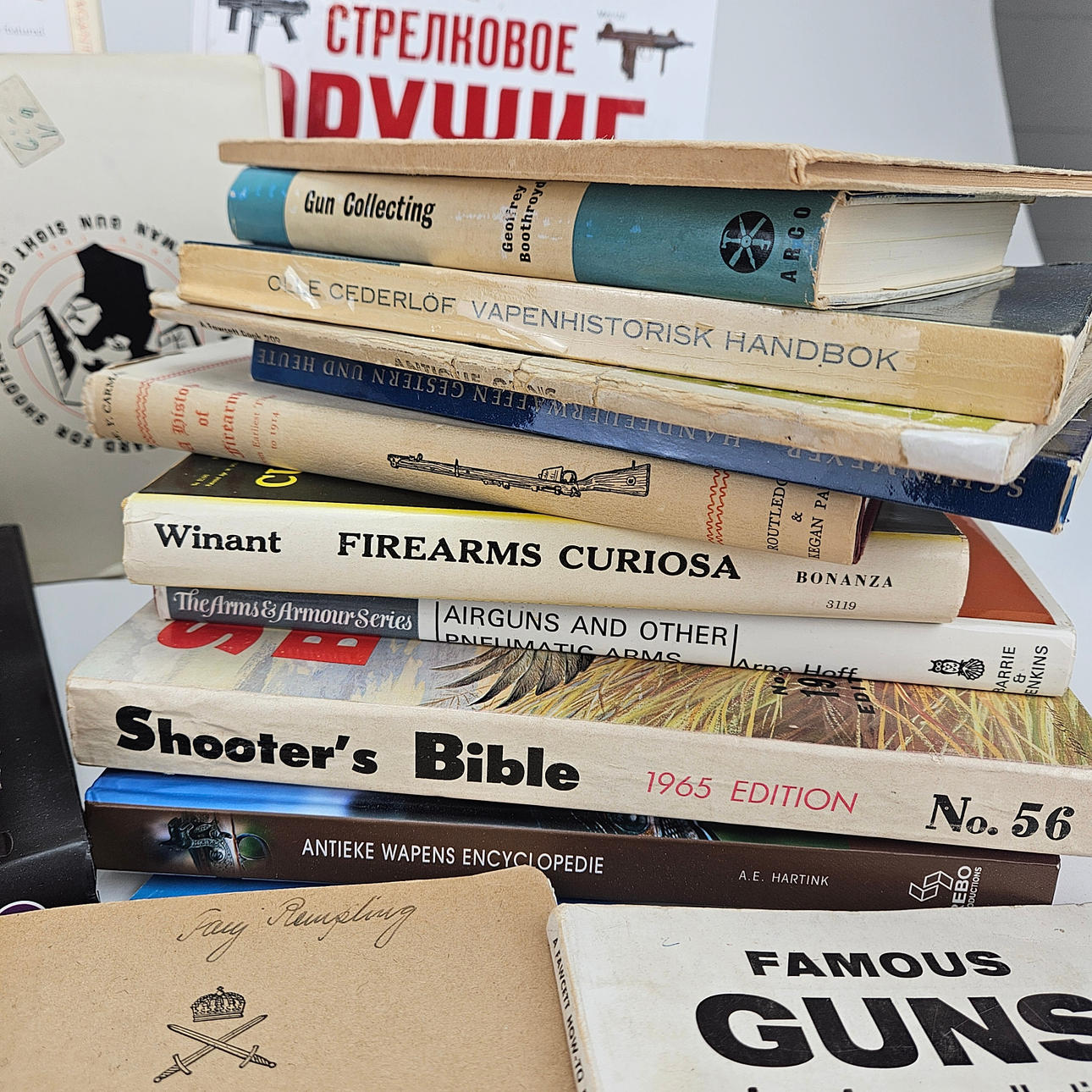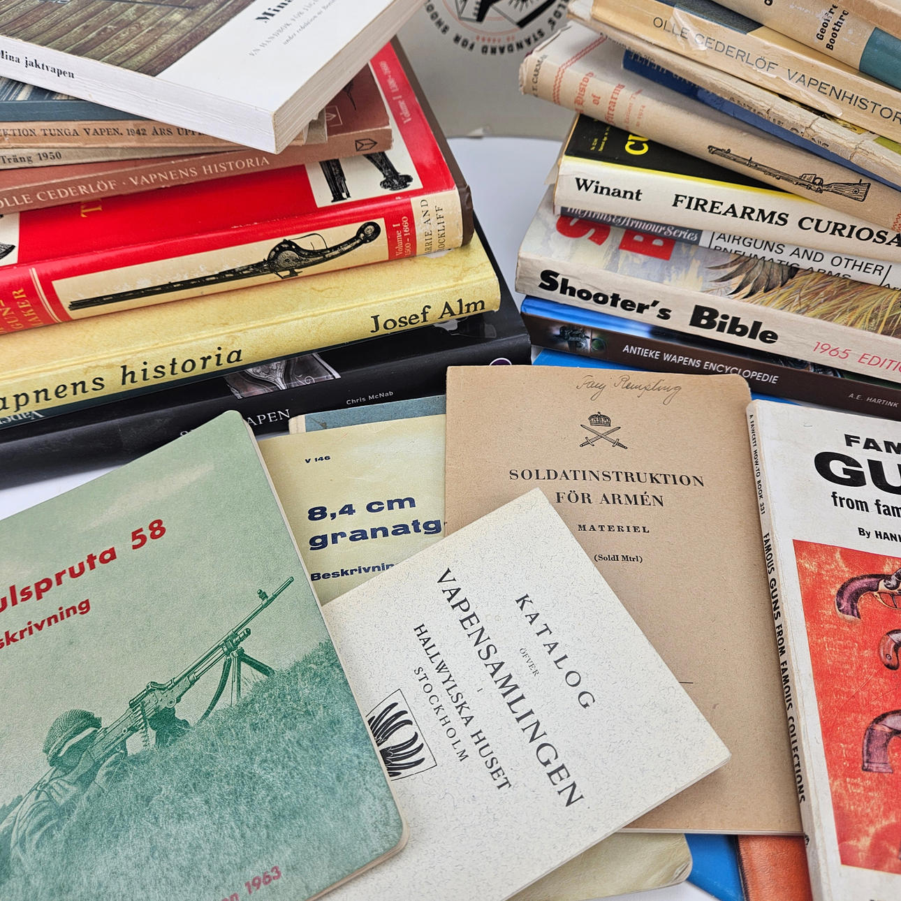 Unter anderem Das illustrierte Waffenverzeichnis, Anleitungen für Soldaten, Feuerwaffen, Die Kunst des Waffenmachers, Firearms Curiosa, britische und amerikanische Steinschlösser.