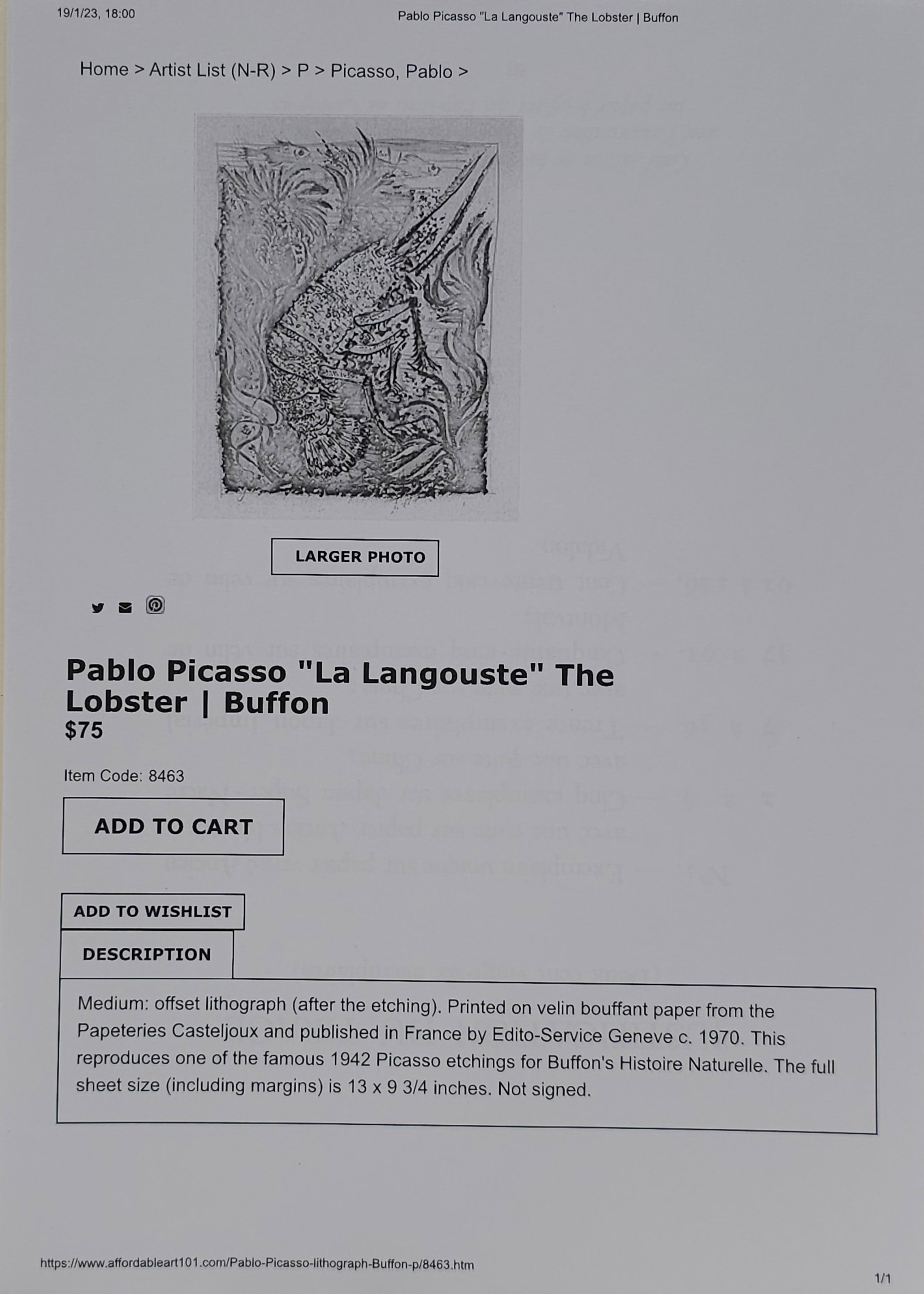 3817734. PABLO PICASSO. „DIE LANGUSTE“. OFFSETLITHOGRAFIE AUF PAPIER.