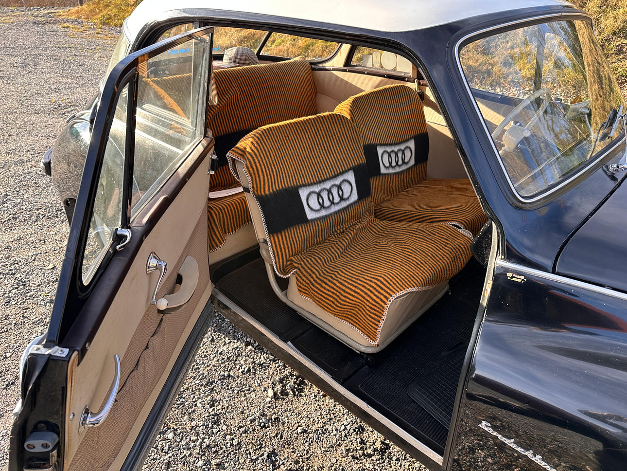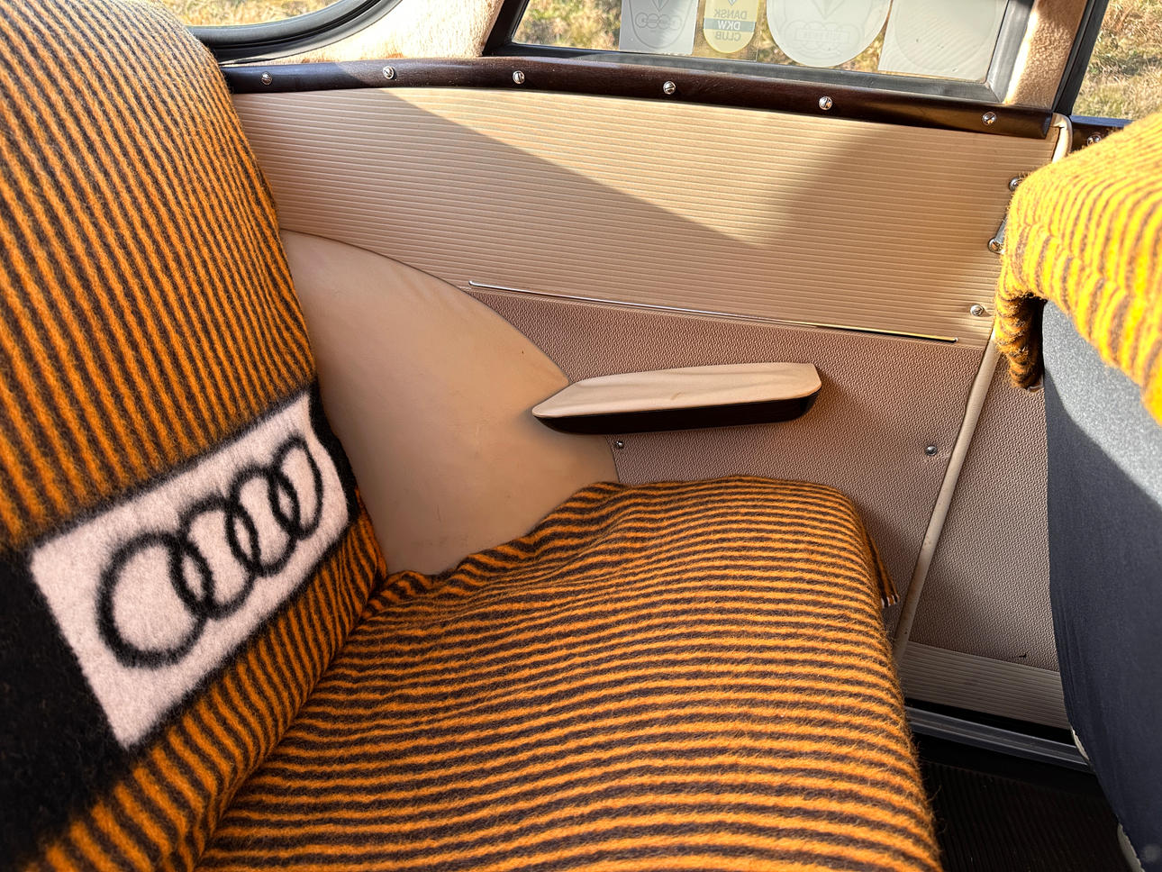 Polsterung: Hellbraune Stoffpolsterung, mit feinen DKW-Decken zum Schutz der Polster.