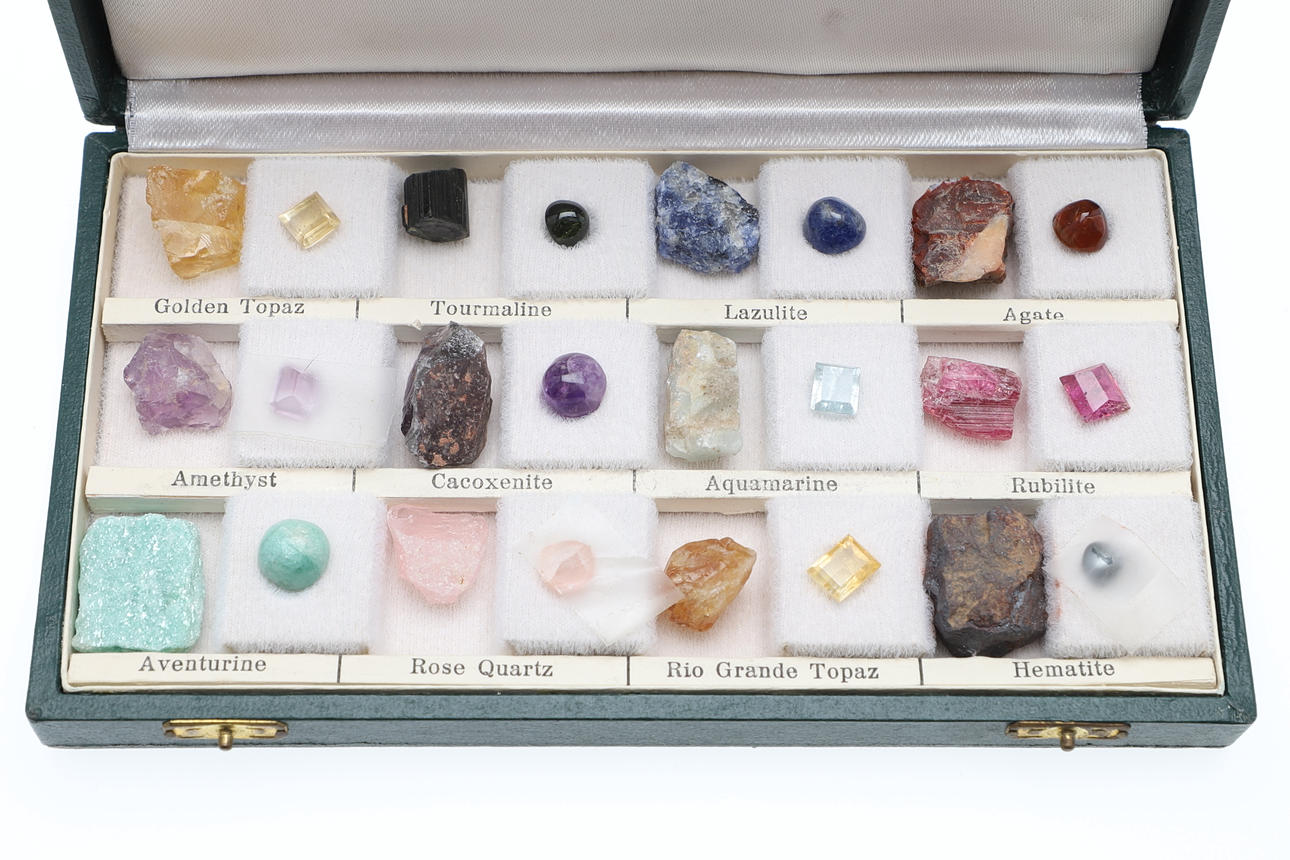 Steine zur Auswahl: Amethyst, Goldtopas, Hämatit, Achat, Aquamarin, Amazonit, Granat, Smaragd. Gehäuse ca. 10,5x14,5 & 16x9 cm.