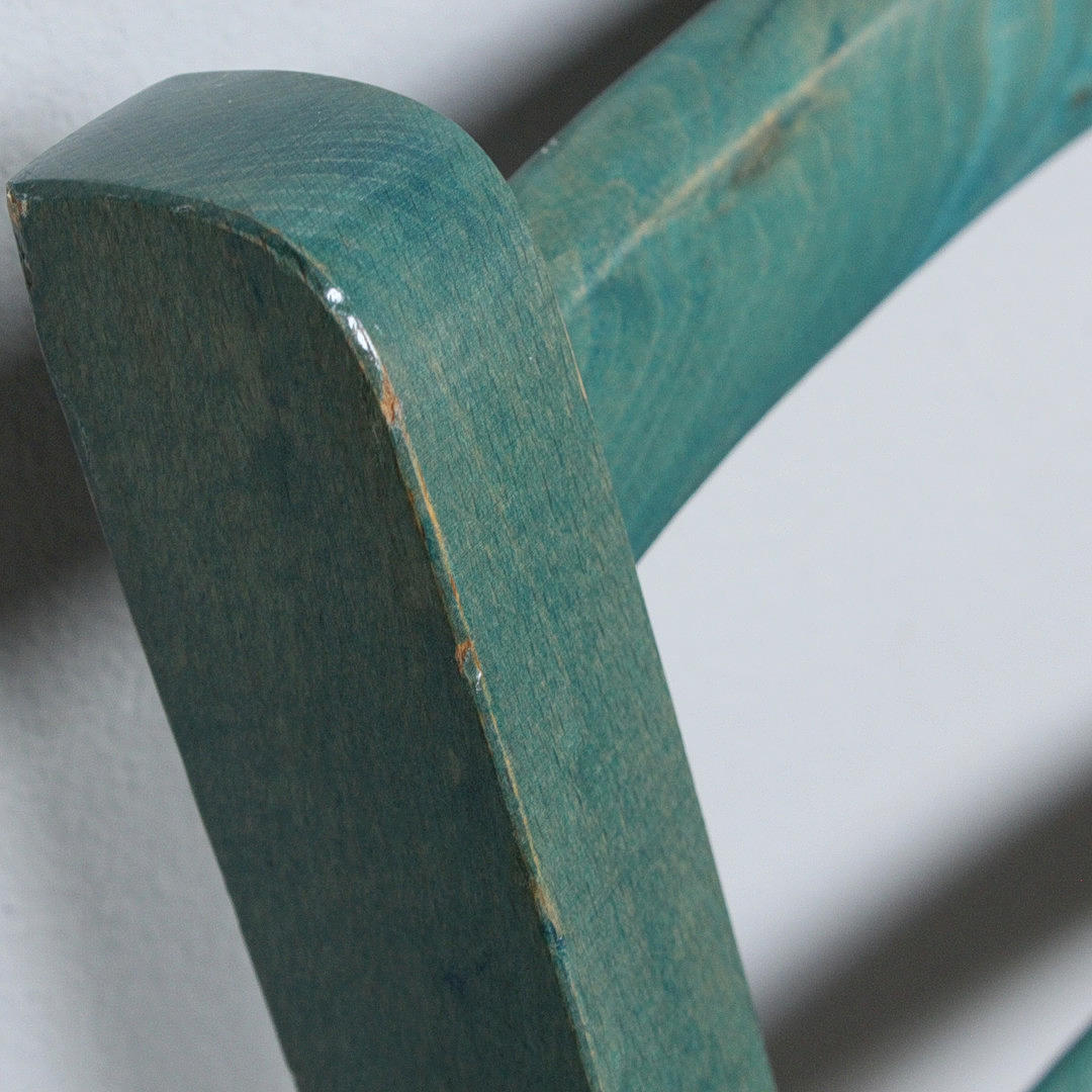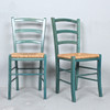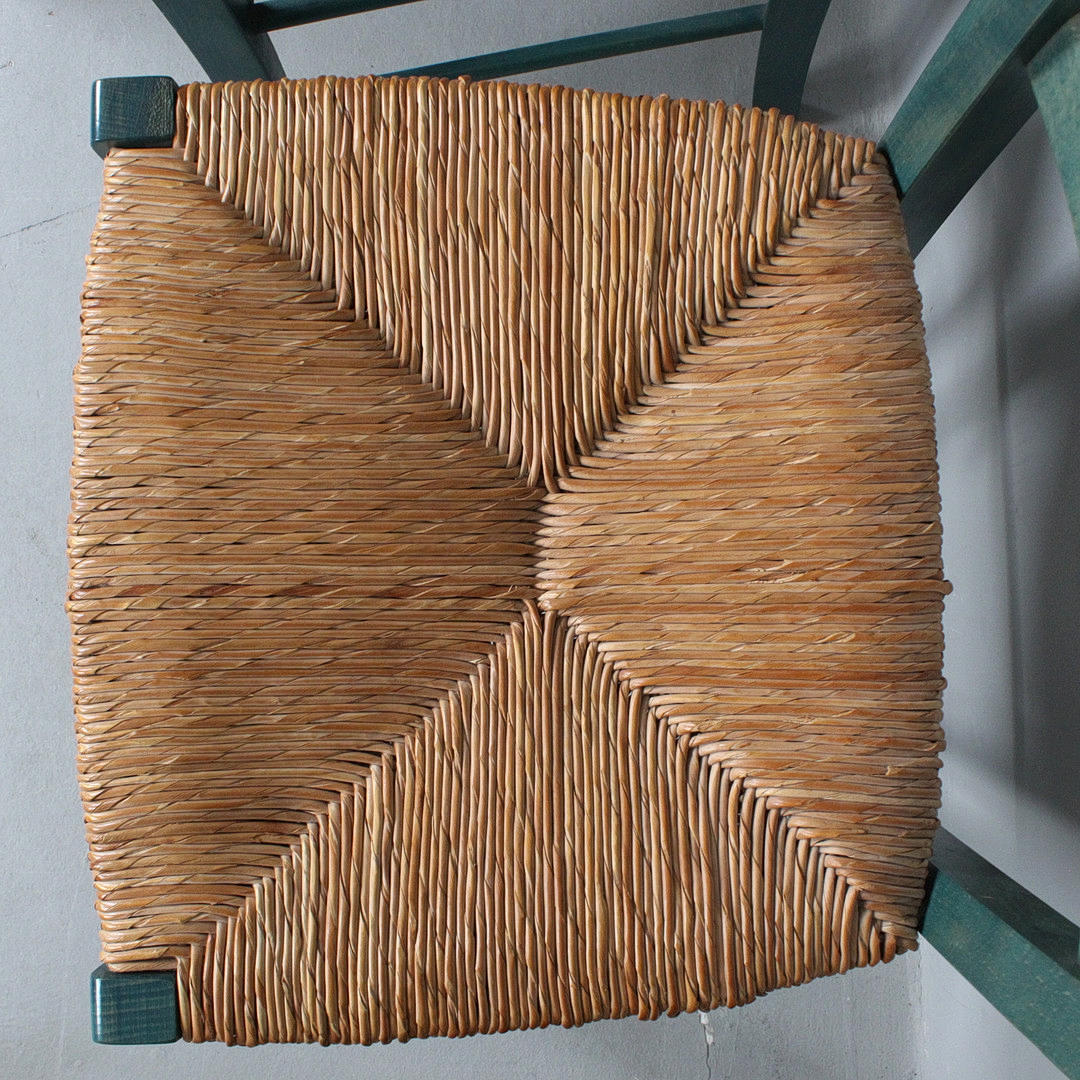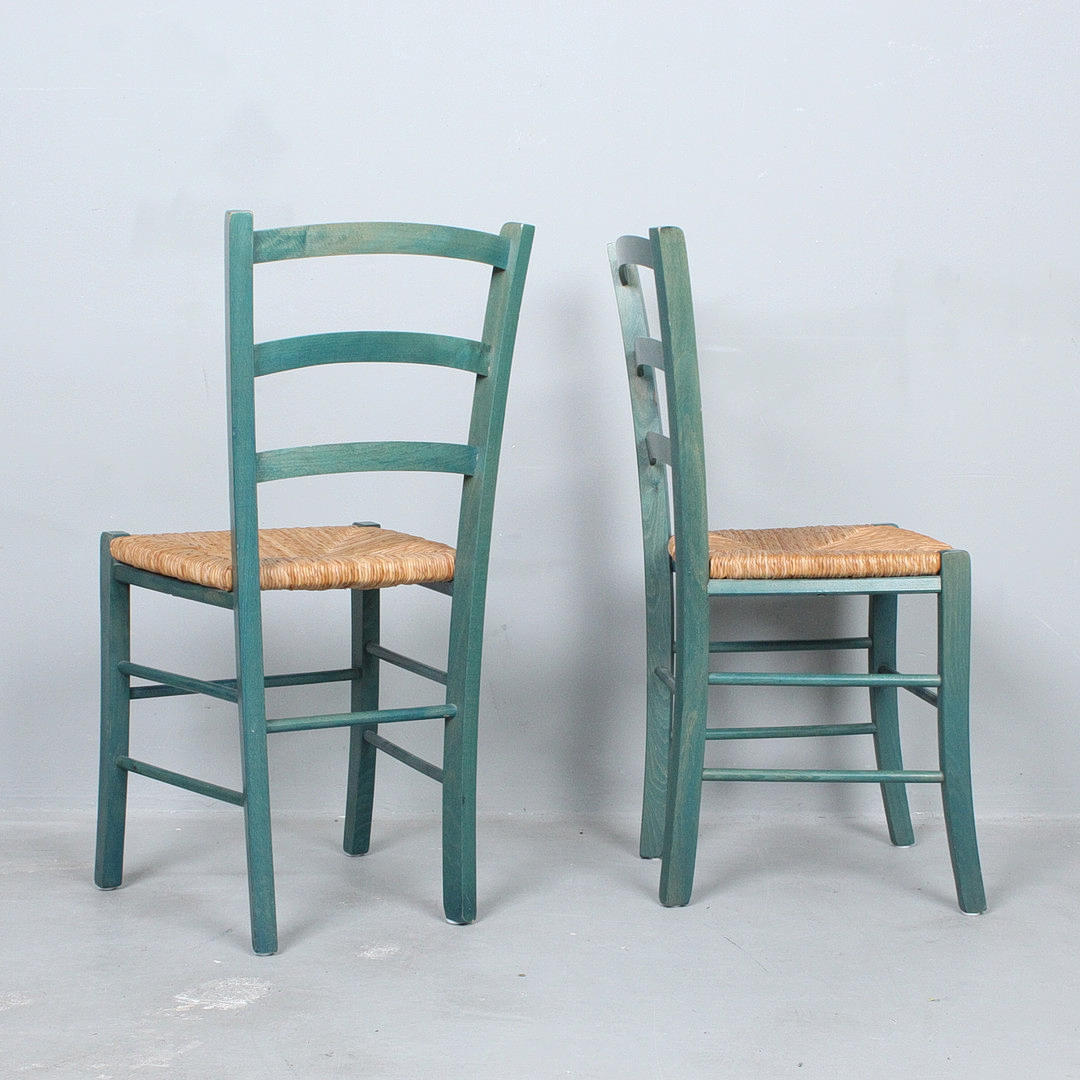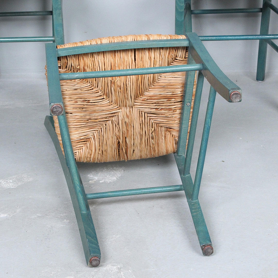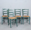 Vier Stühle / Esszimmerstühle, Konstruktion aus grün lackiertem Holz, Sitzfläche aus Geflecht,