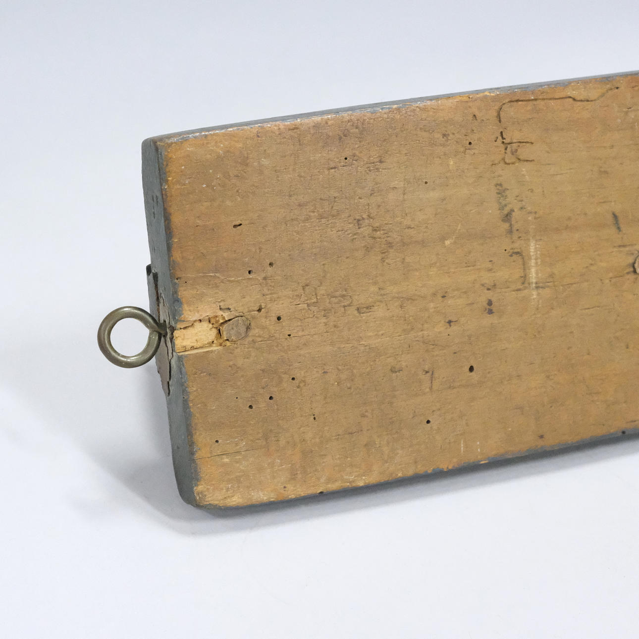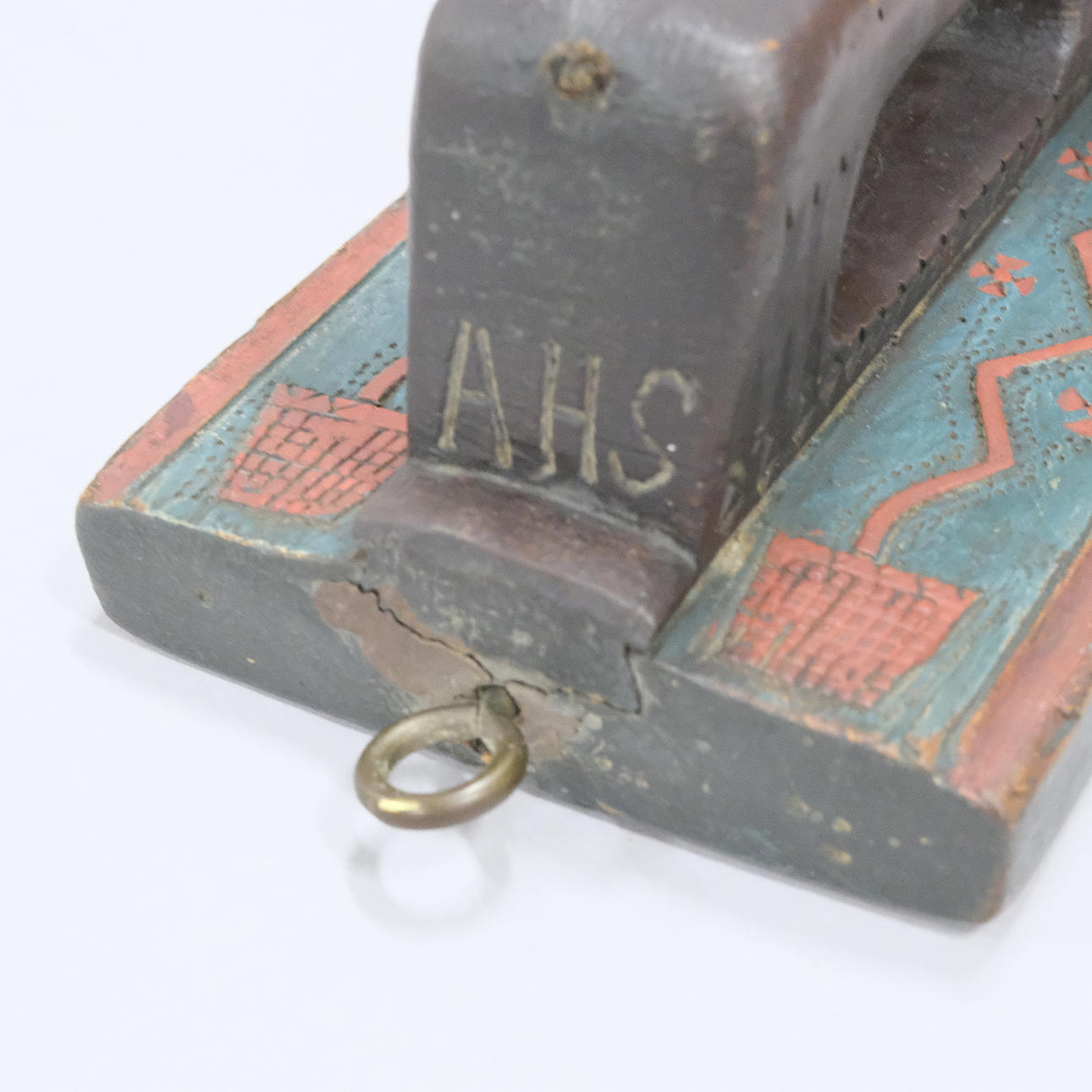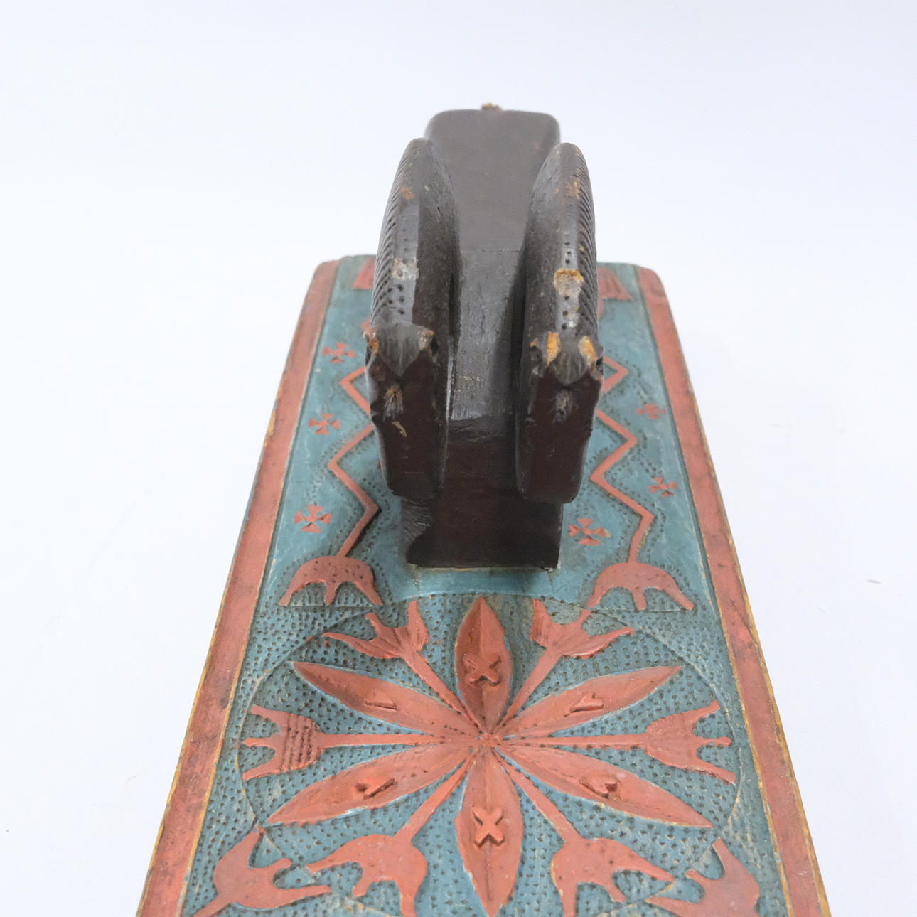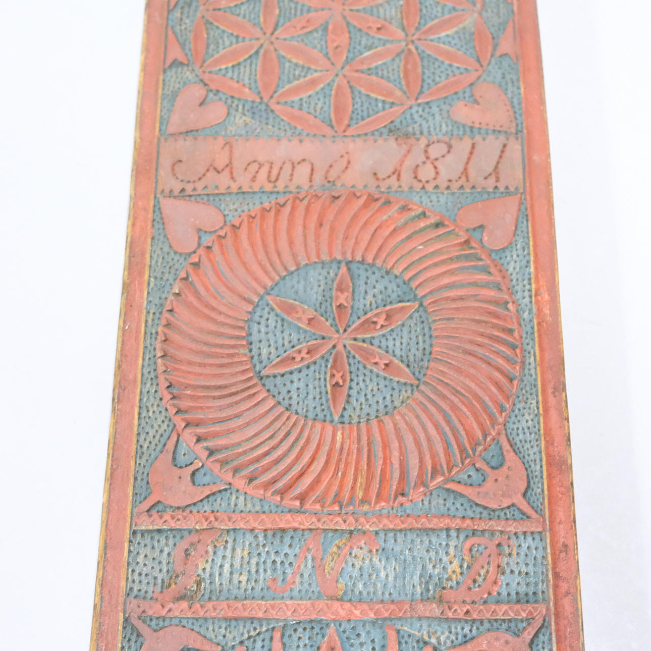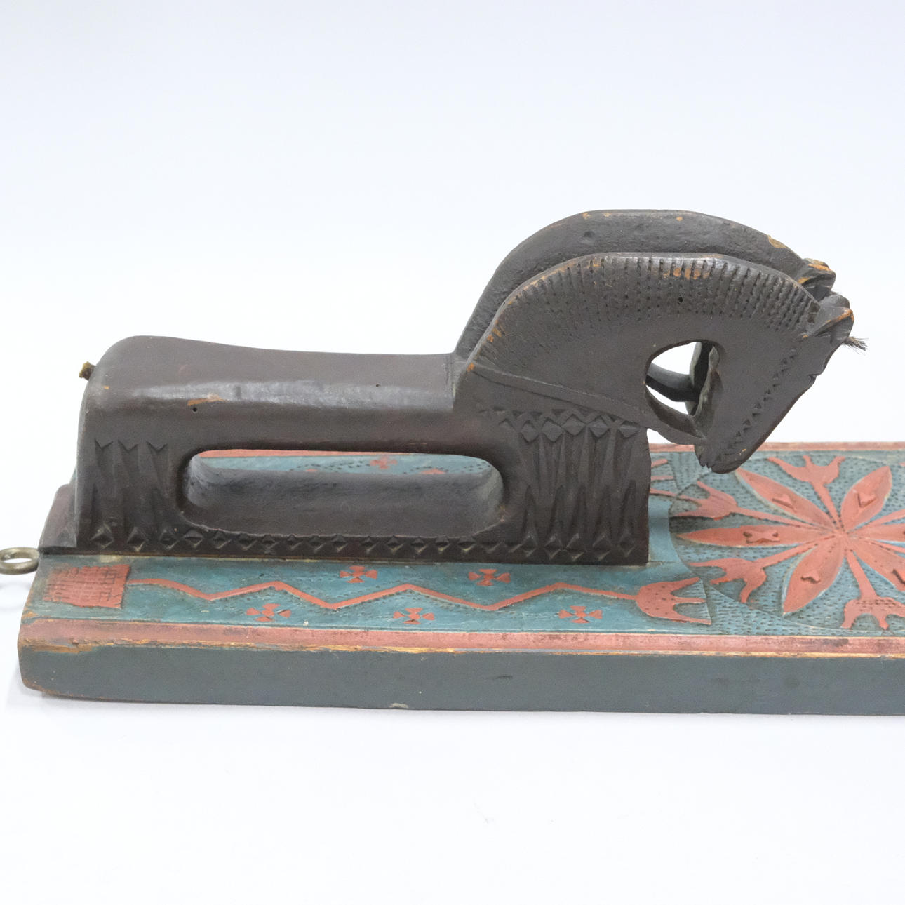 Geschnitztes und bemaltes Holz, mit stilisierten Pflanzenornamenten und Griffen in Form eines Pferdepaares mit Pony und Schwanz aus Rosshaar, geschnitzter Text „Anno 1811", „JND“ und „AHS“, Länge 61 cm.