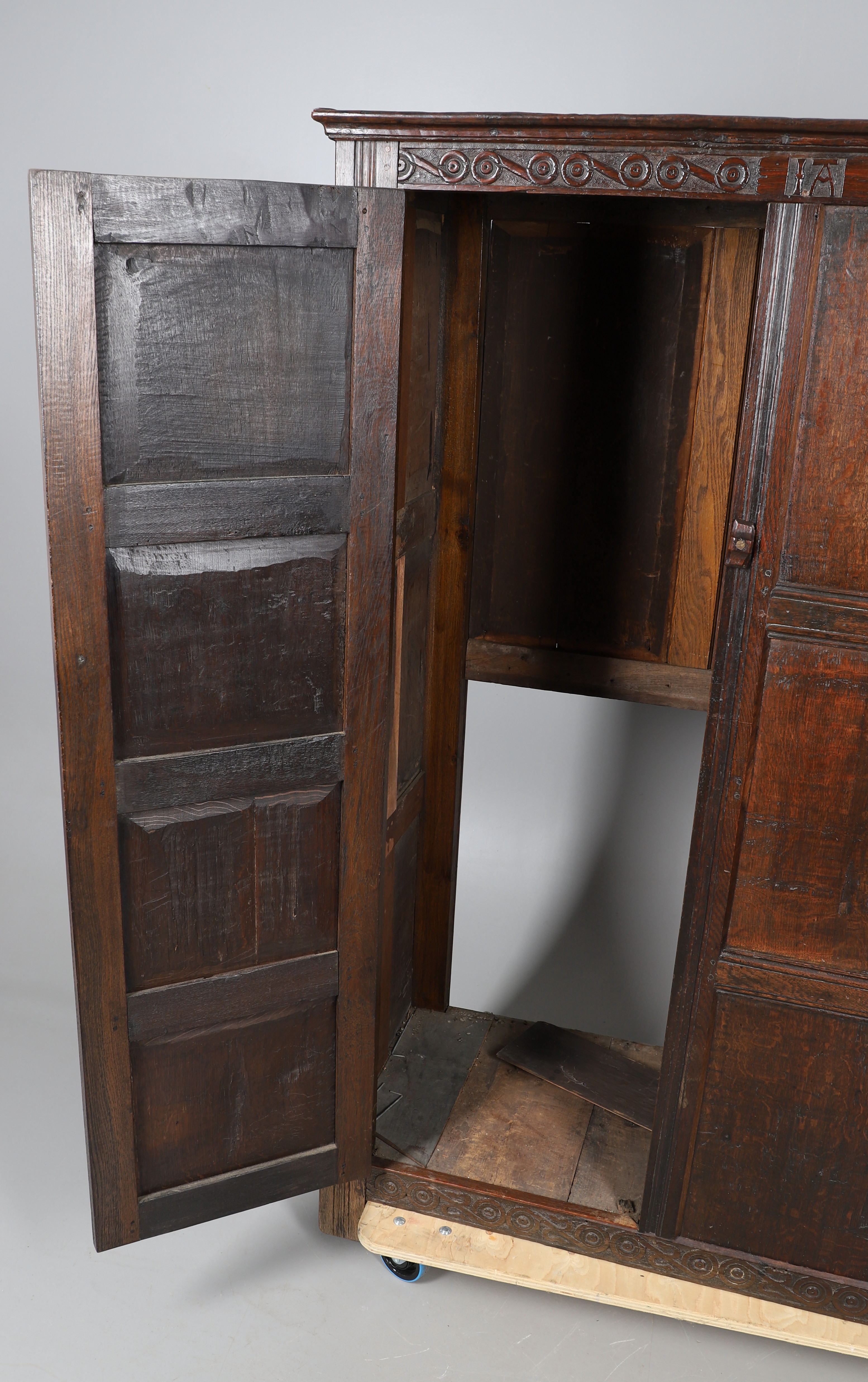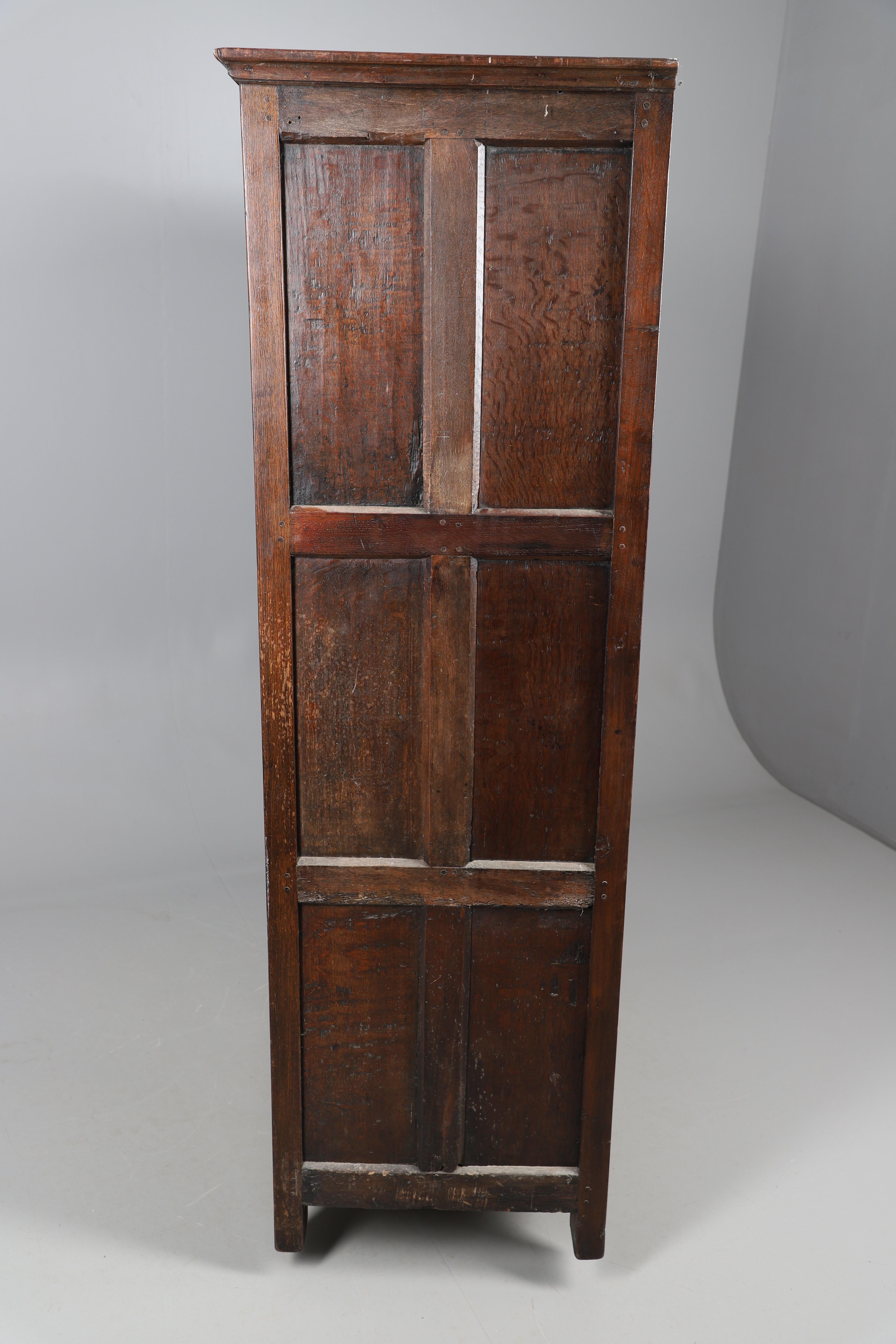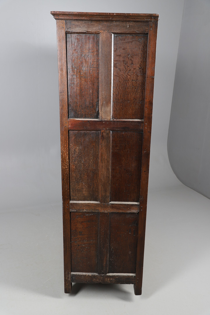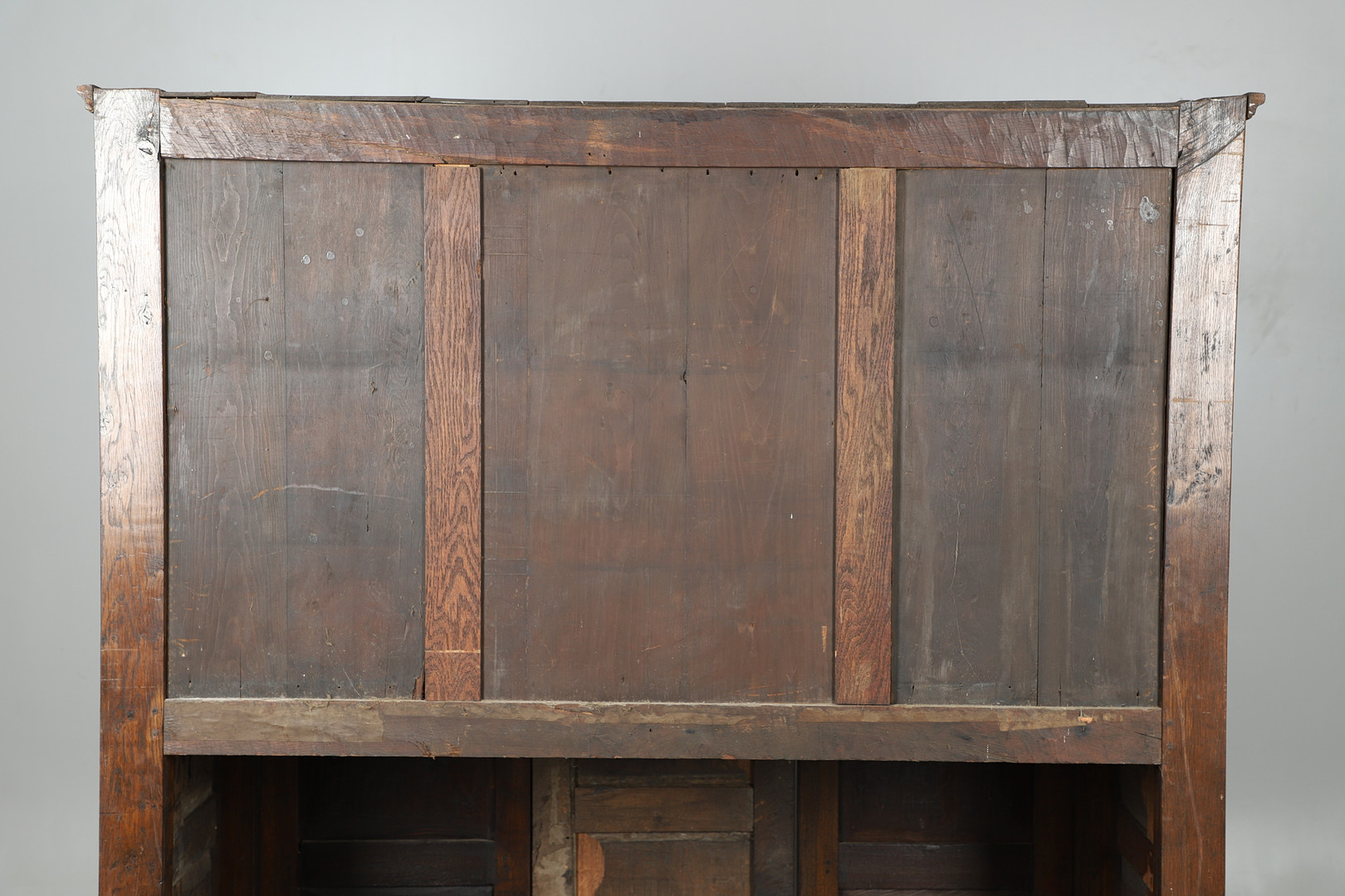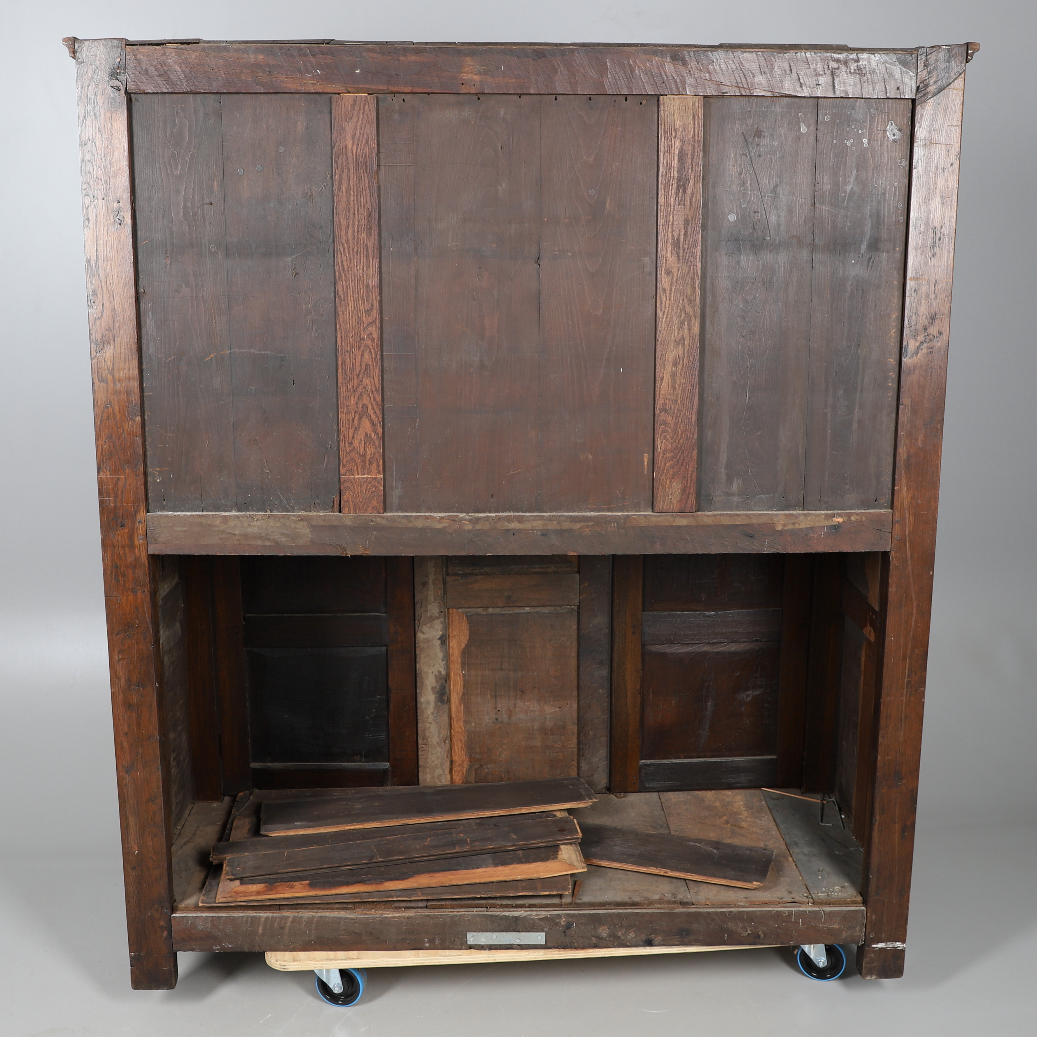 3834534. GROSSER ANTIKER, GETÄFELTER EICHENSCHRANK.