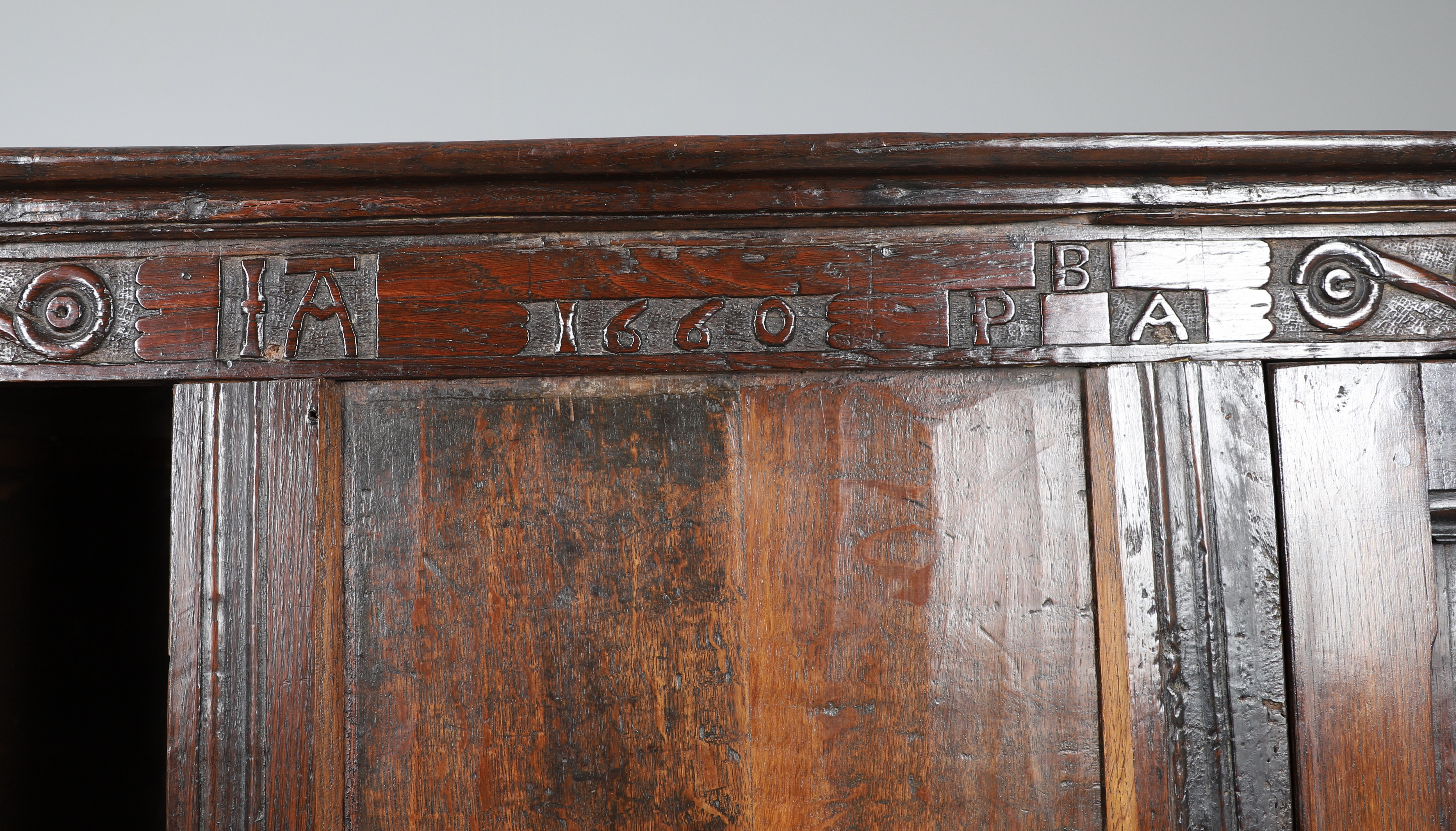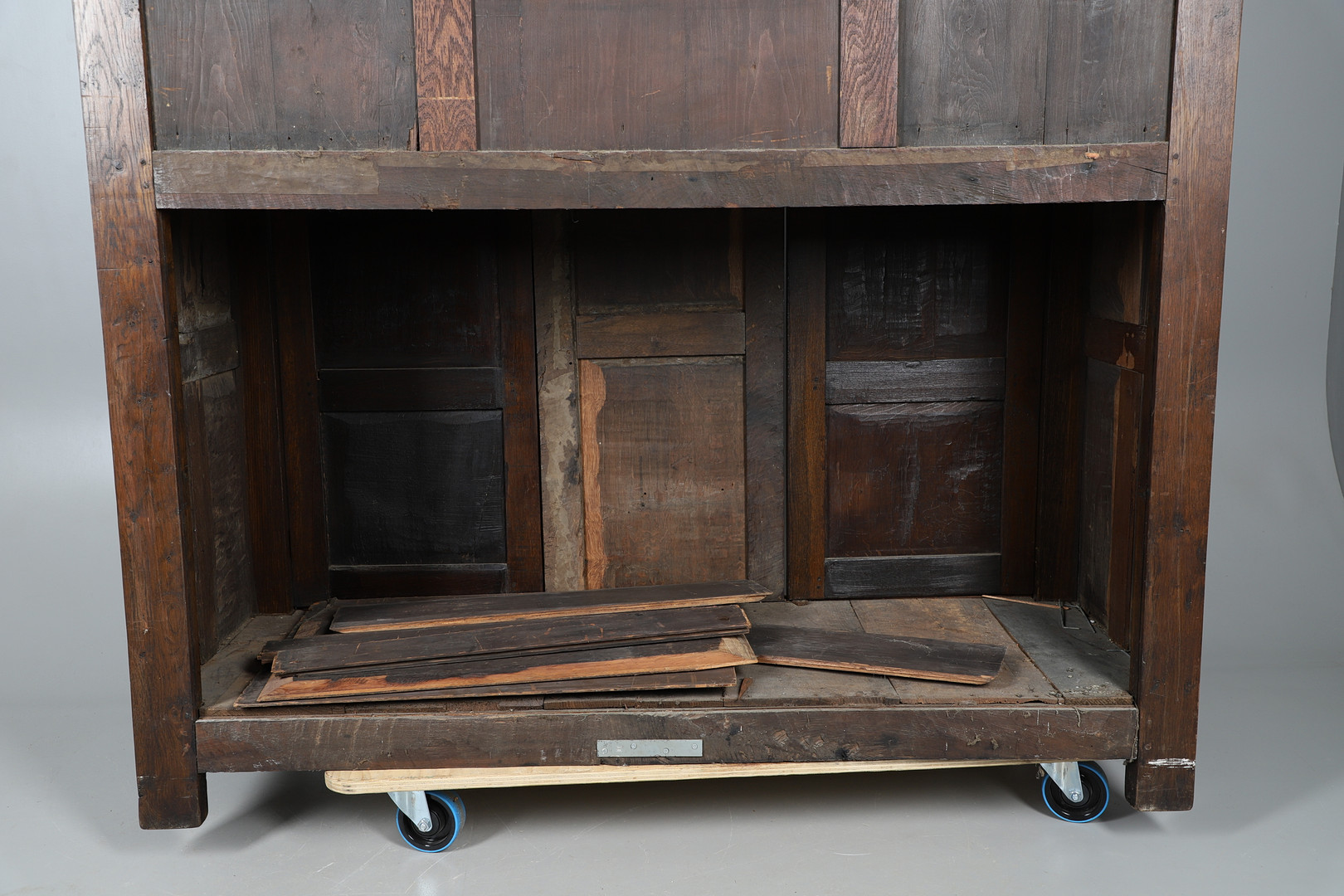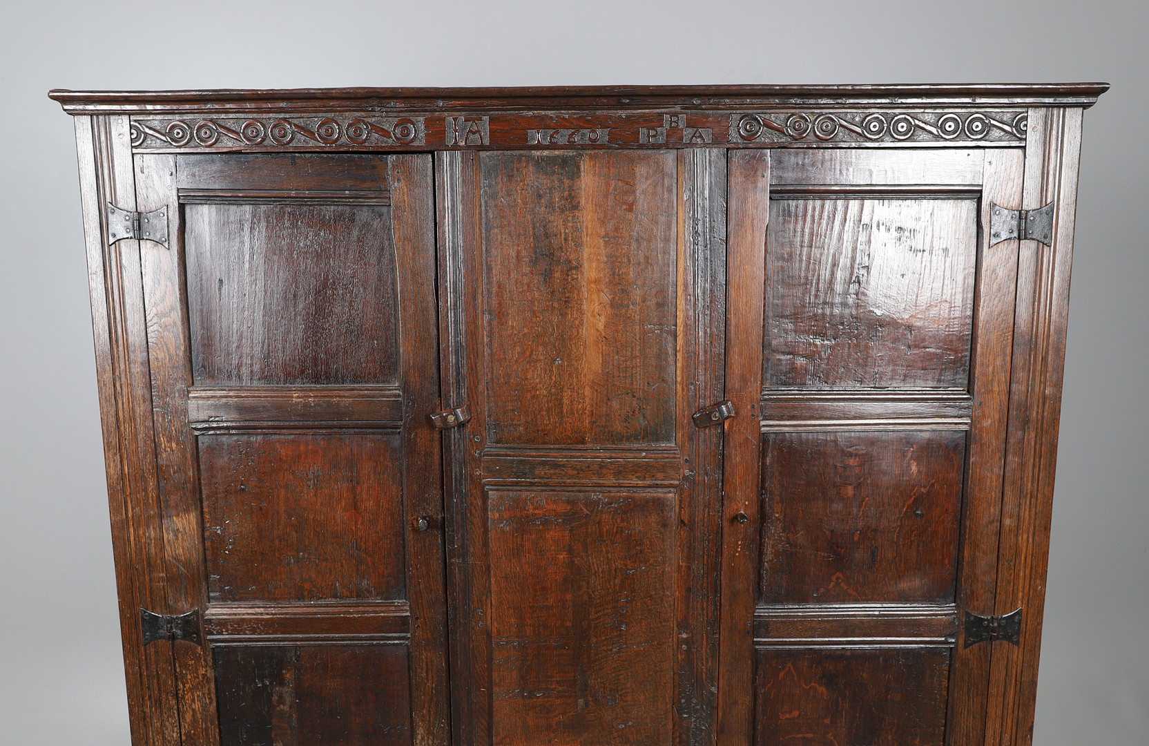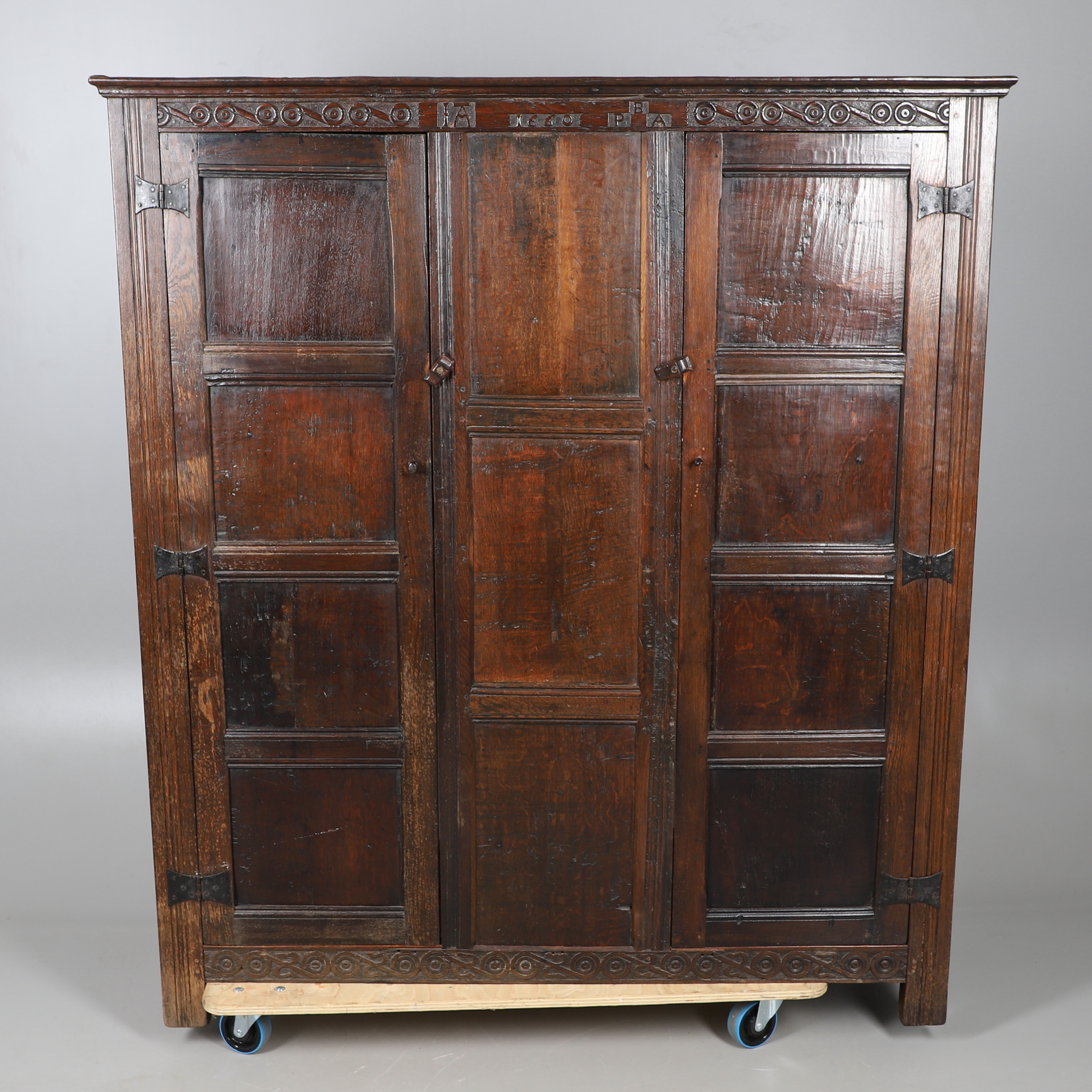 3834534. GROSSER ANTIKER, GETÄFELTER EICHENSCHRANK.
