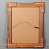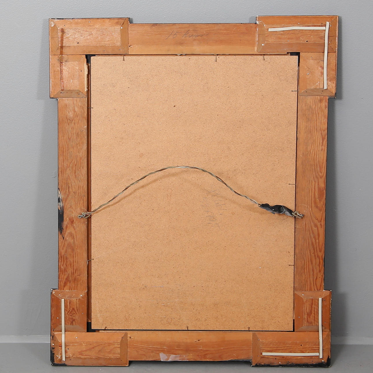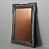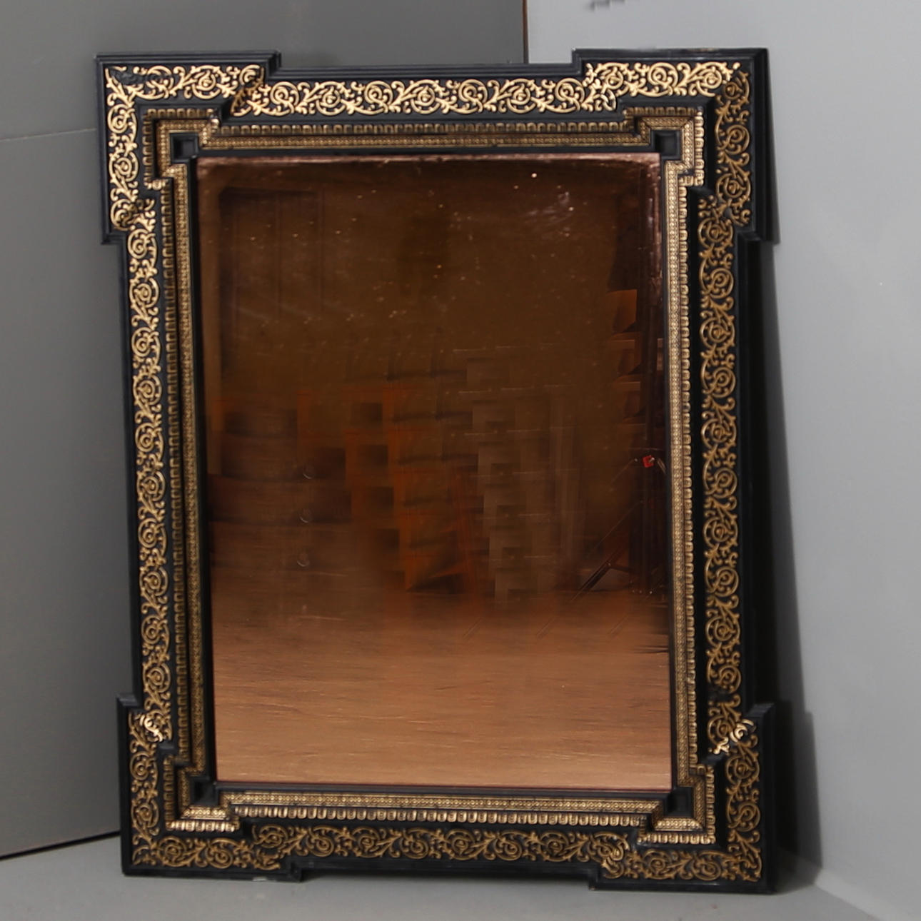 Spiegel in schwarzem Bilderrahmen mit Golddekor und bronzefarben getöntem Spiegelglas.