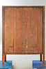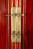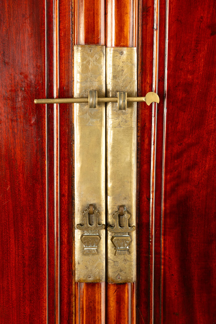 Holz, rotbraun gefasst. Messingapplikation. Rechteckiger Korpus mit 4 Flügeltüren und einem Türriegel. Griff in Form eines Blumenkorbes. Innen 4 Schubladen. HxBxT: ca. 183 x 127 x 64 cm.