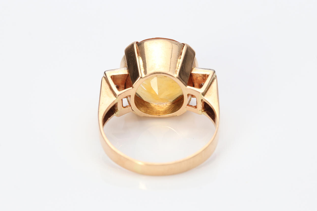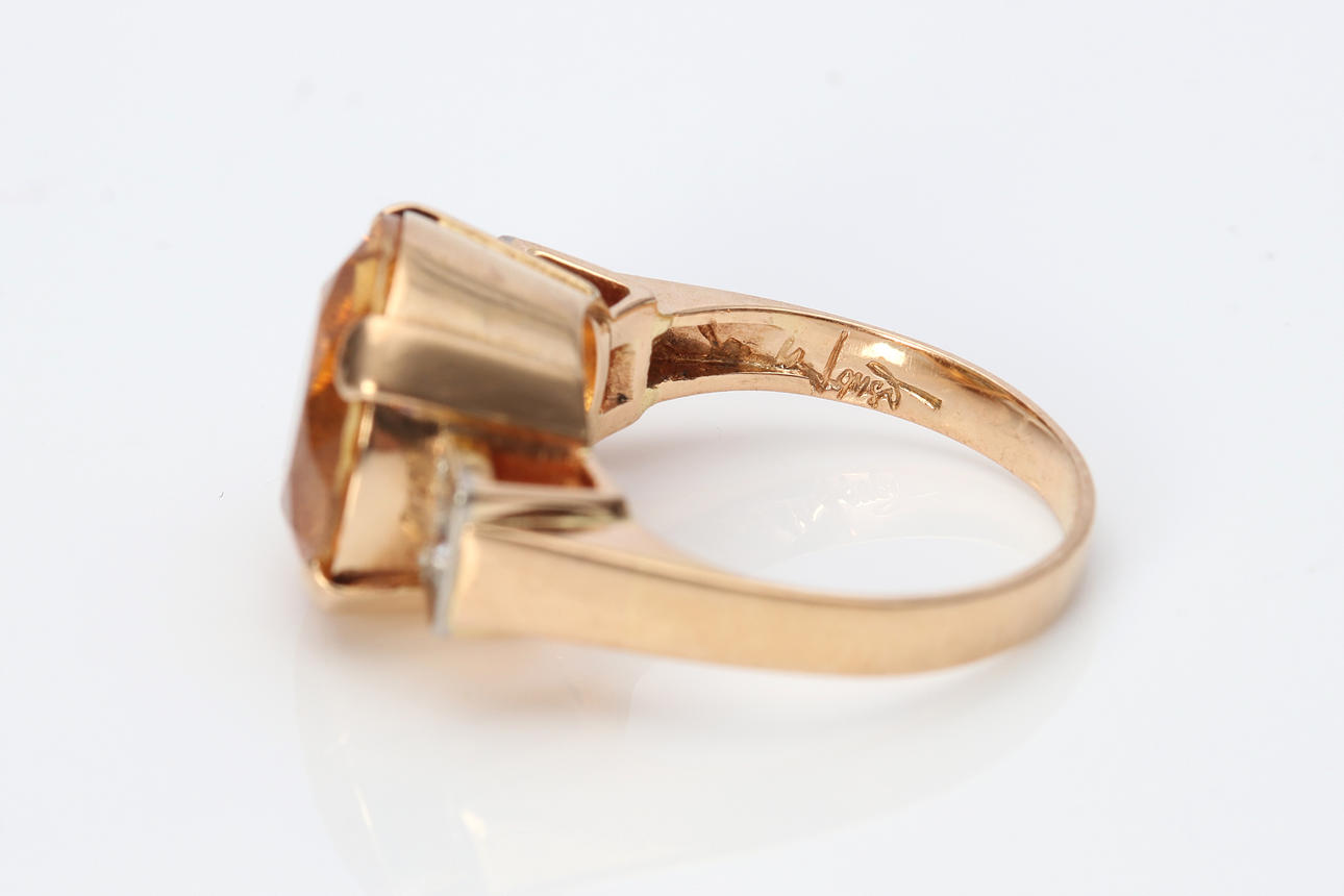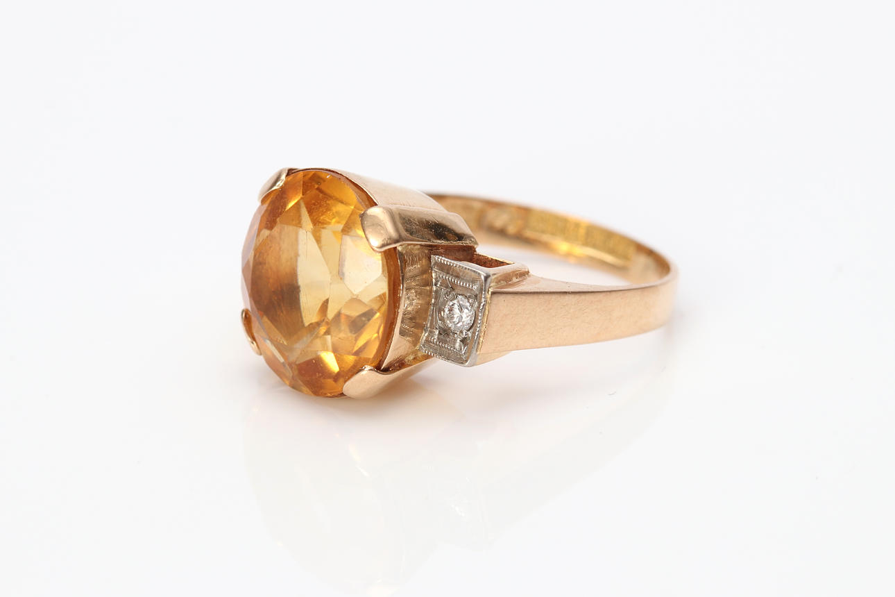 Goldring 18 Karat mit einem facettierten Citrin ca. 12 mm und kleineren Diamanten, Göteborg 1963, Größe ca. 16,5 mm, Gesamtgewicht 5,9 g.