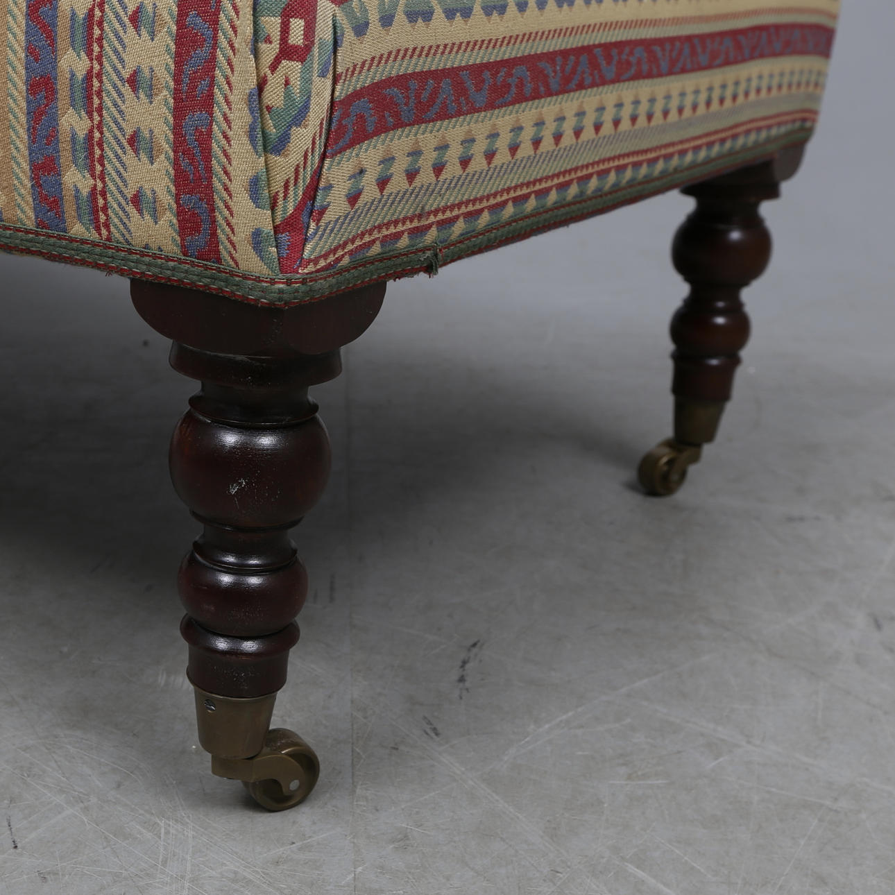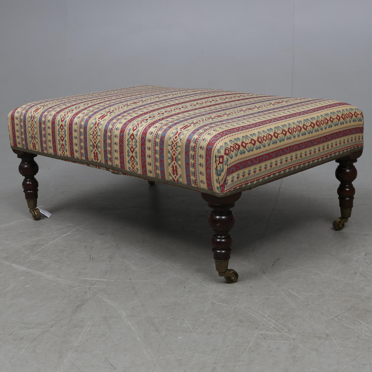 Fester Polstersitz, Polsterung polychrom, 4 Beine mit Rollen, ca. Länge 100, Breite 65, Höhe 40 cm.