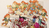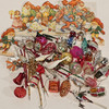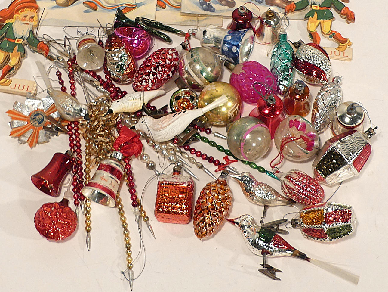 Fünf Papierstreifen. Kegel, Vögel, Glocken usw., insgesamt etwa 40 Stück. siehe Bilder.