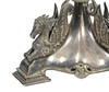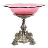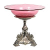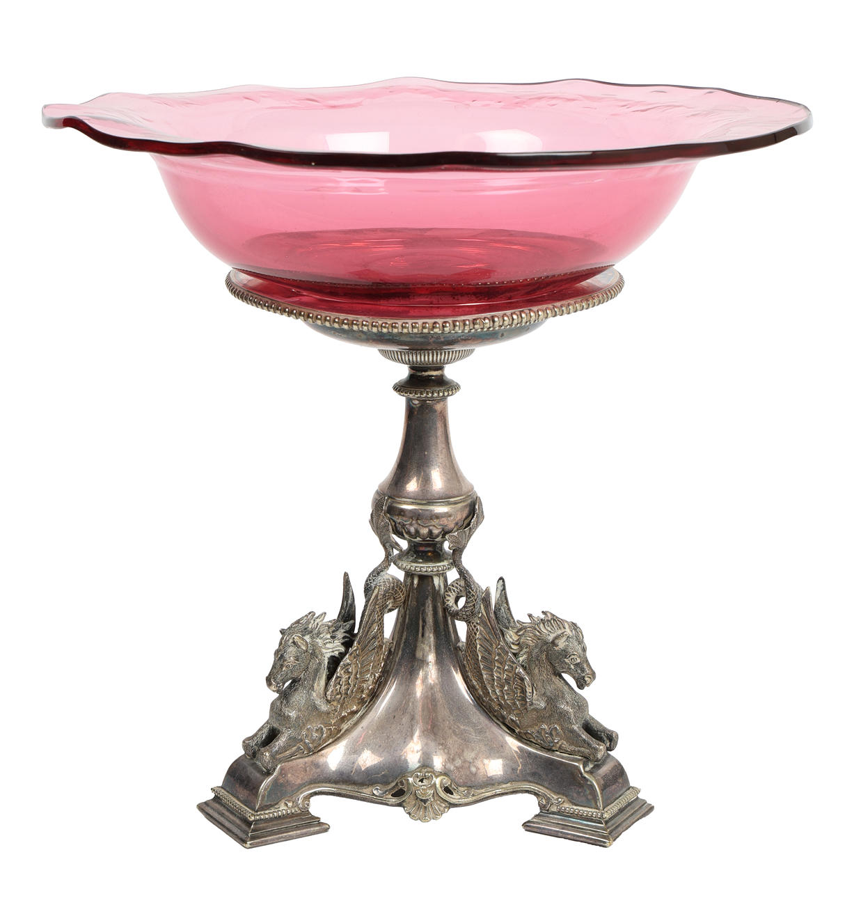 Die flache Glasschale mit Rüschenrand auf einem versilberten Boden mit drei Stützen in Form von Pegasus, die Schale hat einen Durchmesser von 25 cm und eine Höhe von 23 cm.