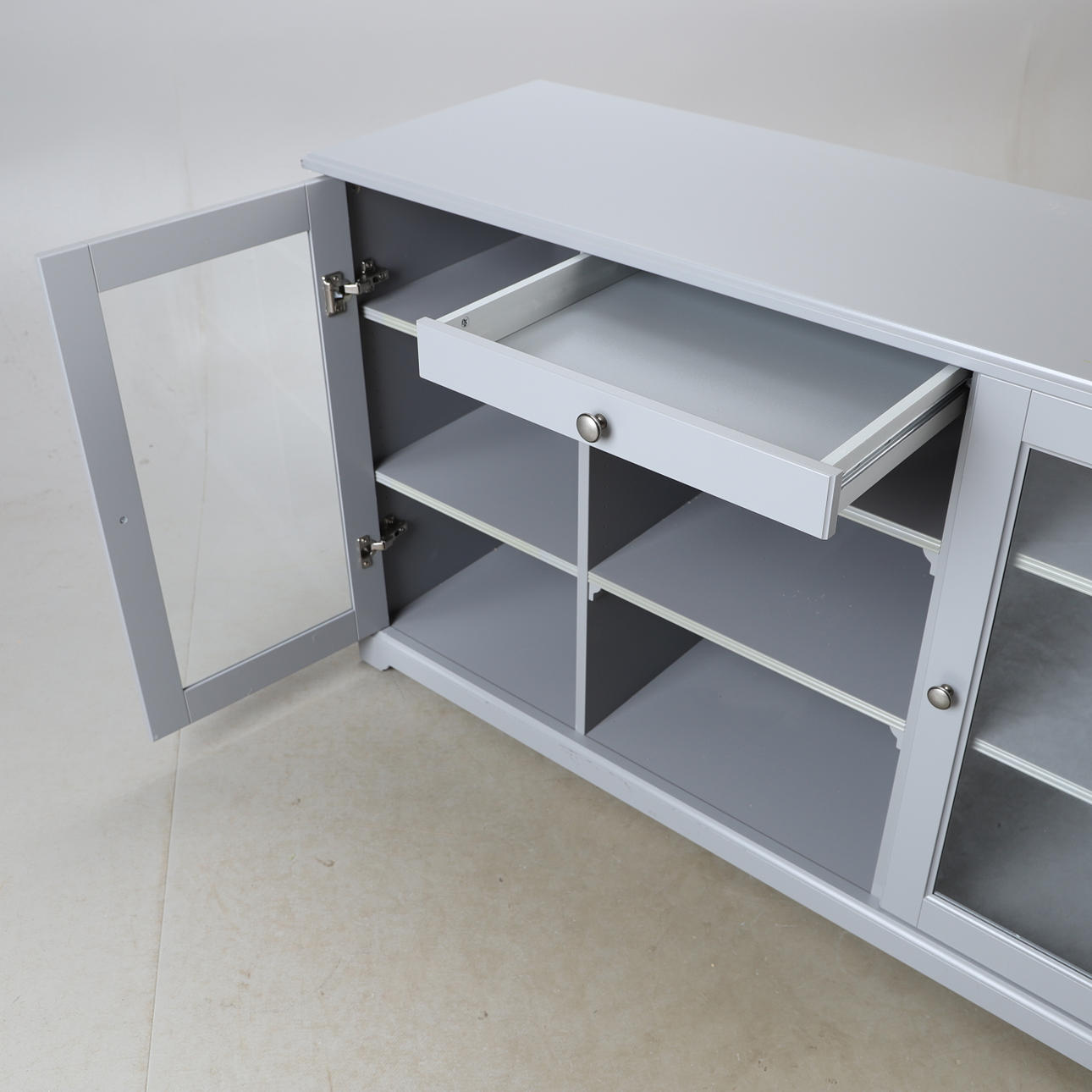Ein Sideboard, „Liatorp“, grau gestrichen, Ikea.
