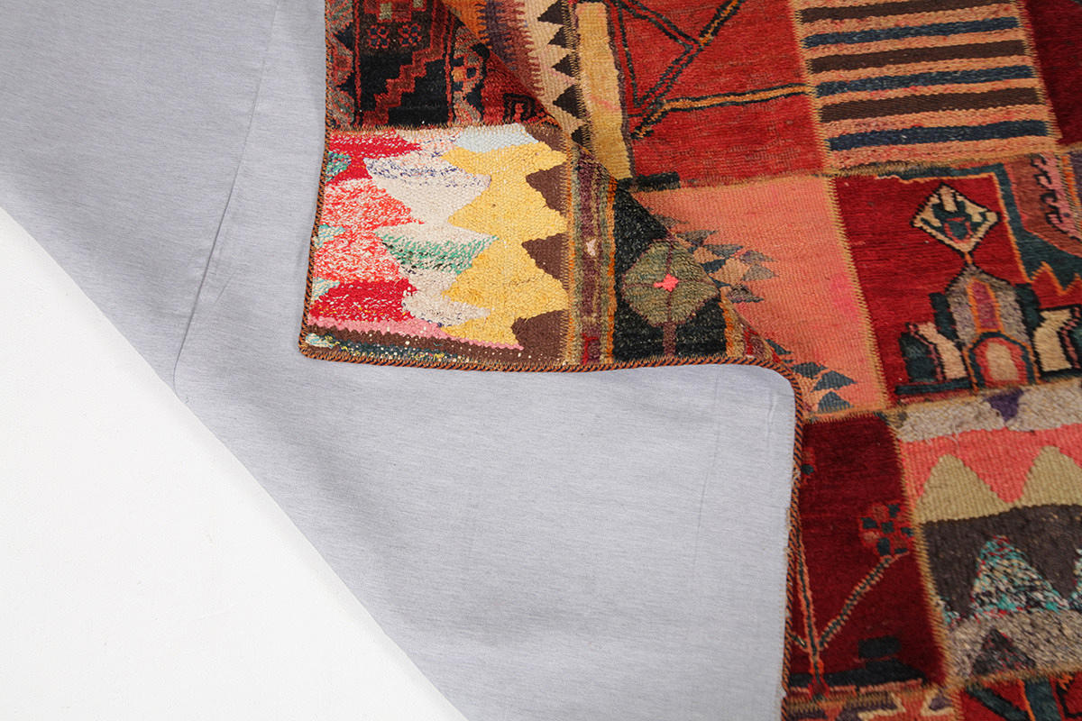 Zusammengefügte Fragmente altpersischer handgeknüpfter Teppiche und handgewebter Kelims, gefüttert.
