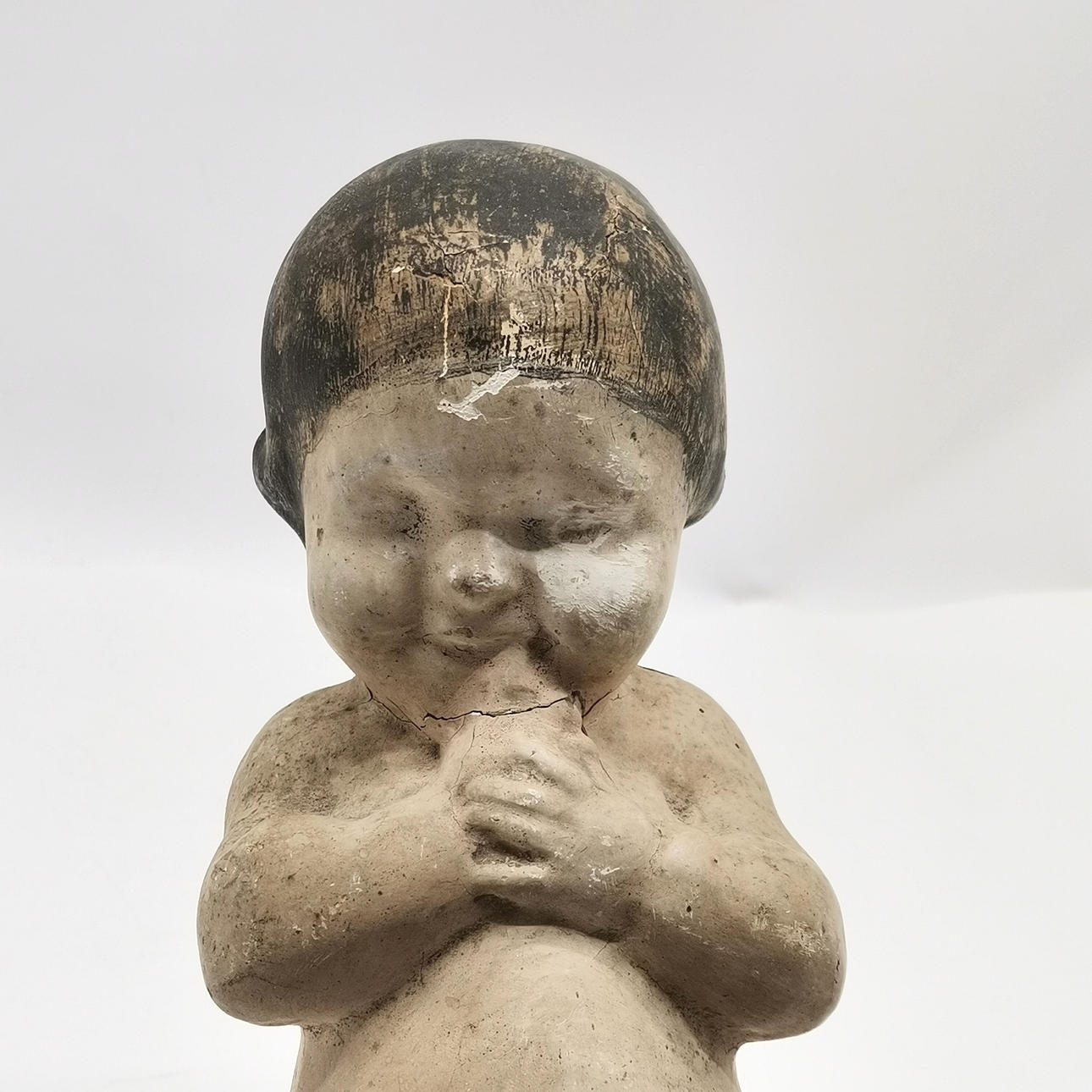 Antiquitätenfigur eines 35 cm hohen Kindes in einem Geschäft aus Pappmaché.
