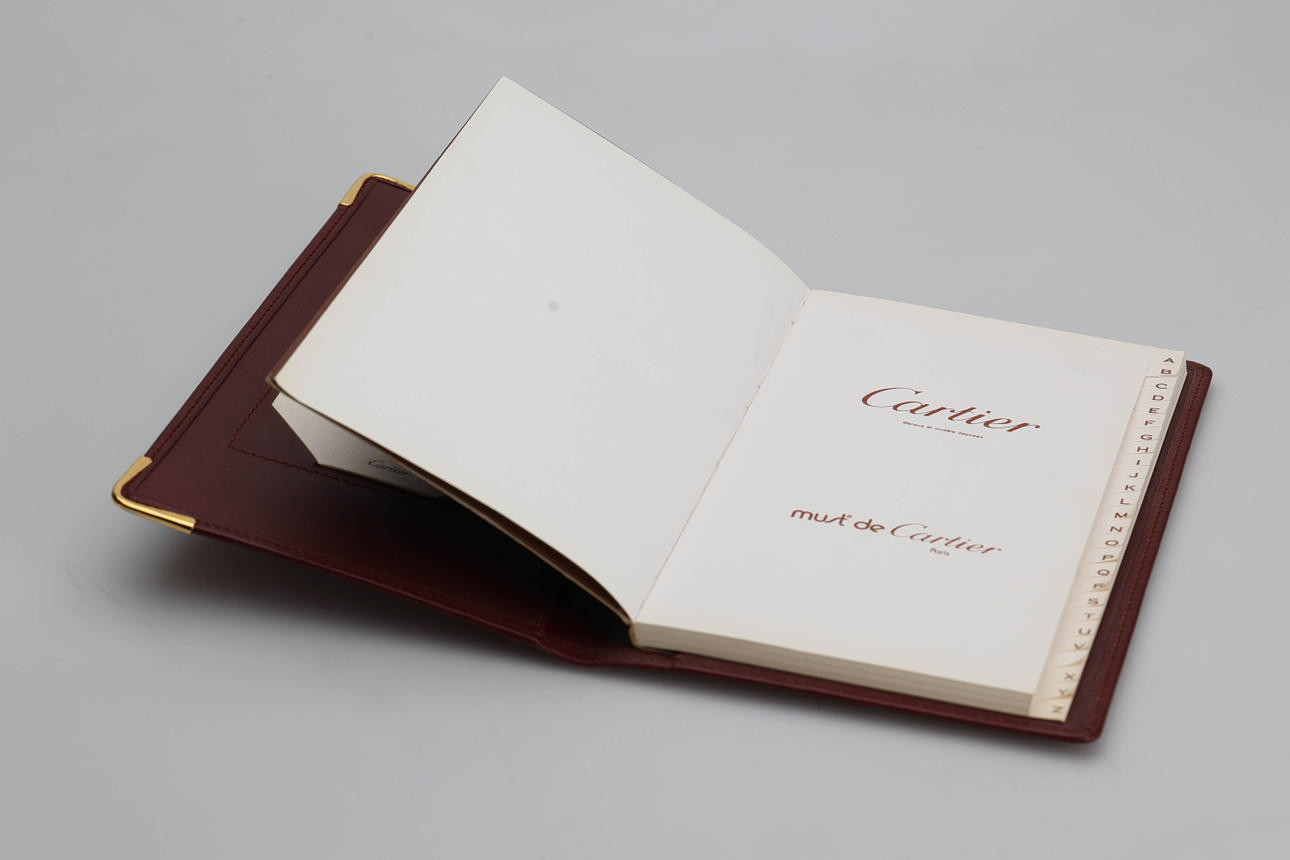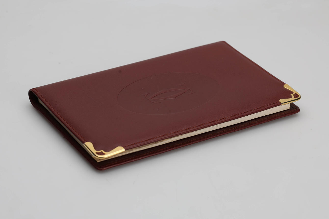 Telefonbuch, mit Aufzeichnungen, Ledereinband mit Details aus goldfarbenem Metall. Marke: Cartier Paris.