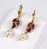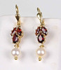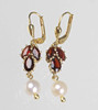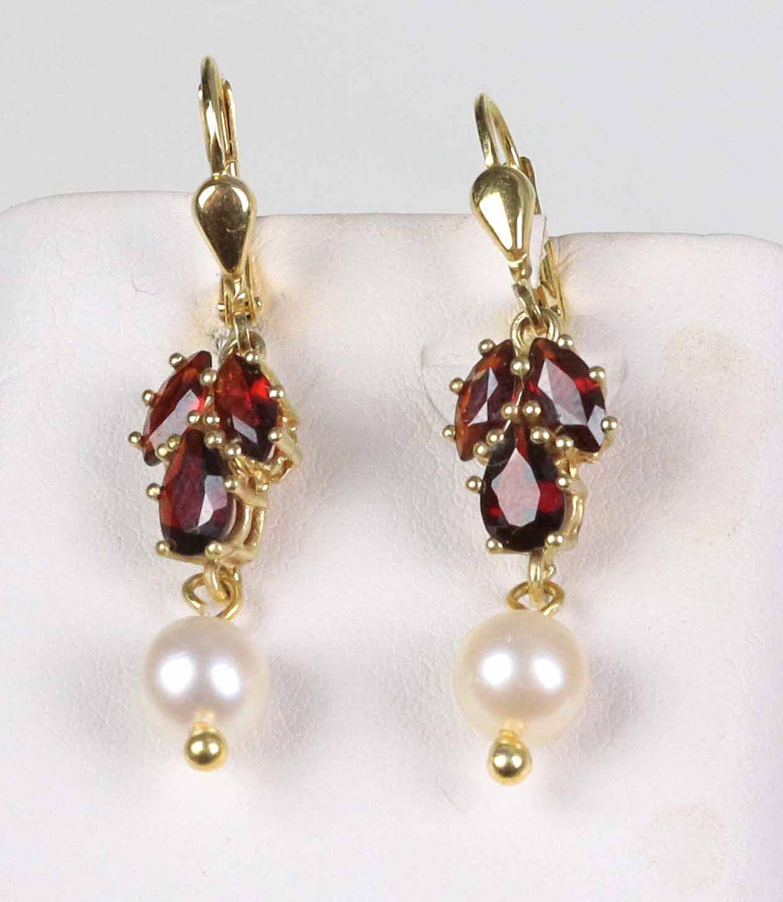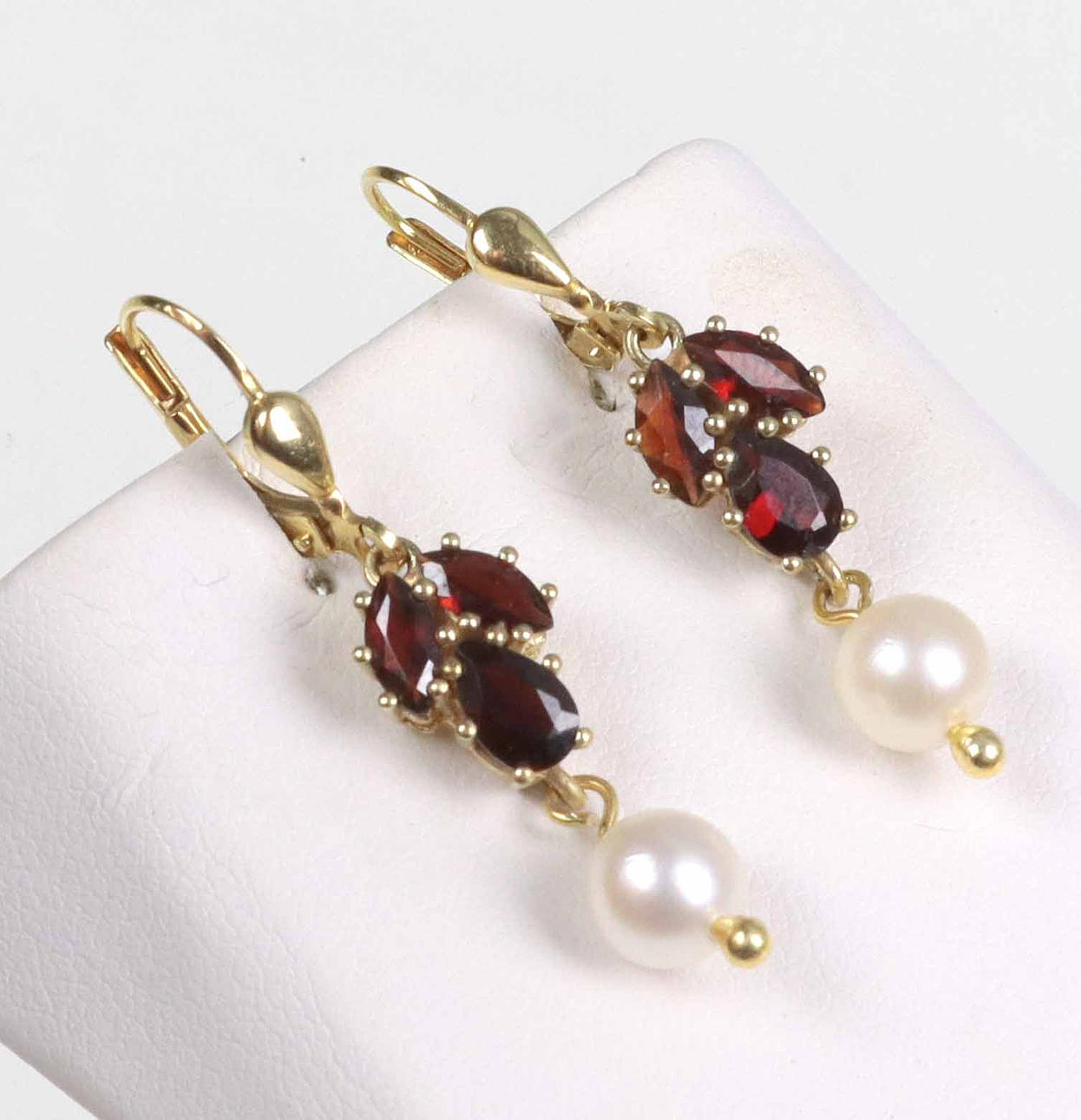 Granat Perl Ohrringe, Gelbgold 333. Klappohrbügel sind punziert Gelbgold 333 (8 Karat). Daran sind je 3 Granate von 6,5 x 2,5 mm im Navettenschliff sowie eine echte weiße Akoya Zuchtperle von 5,5 mm Ø mit herrlichem Lüster und Glanz abgehangen.