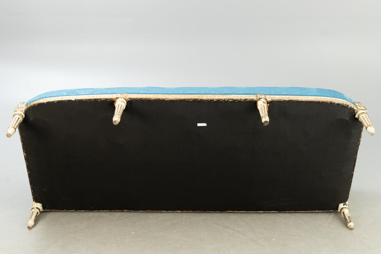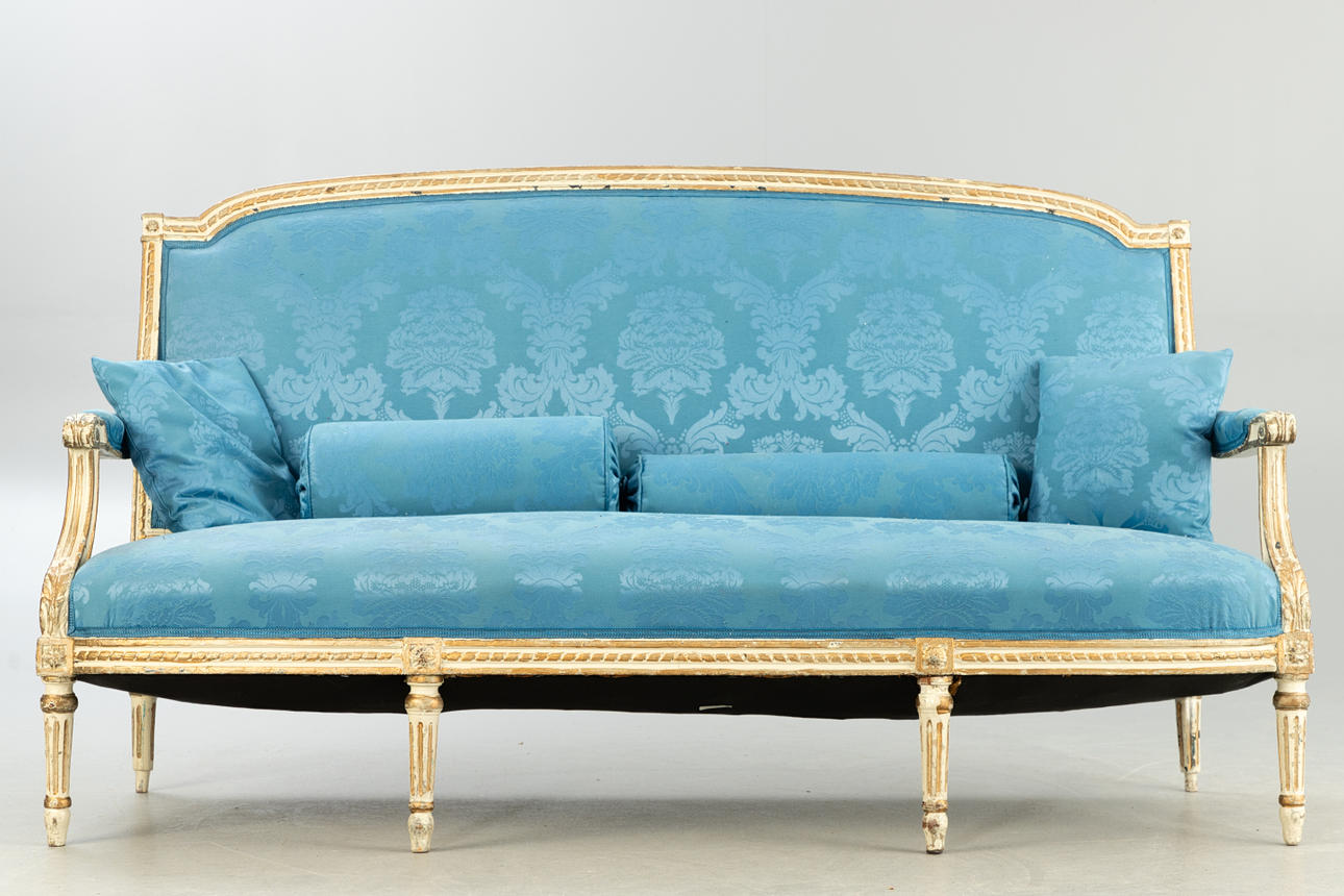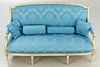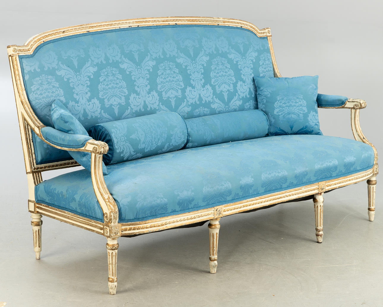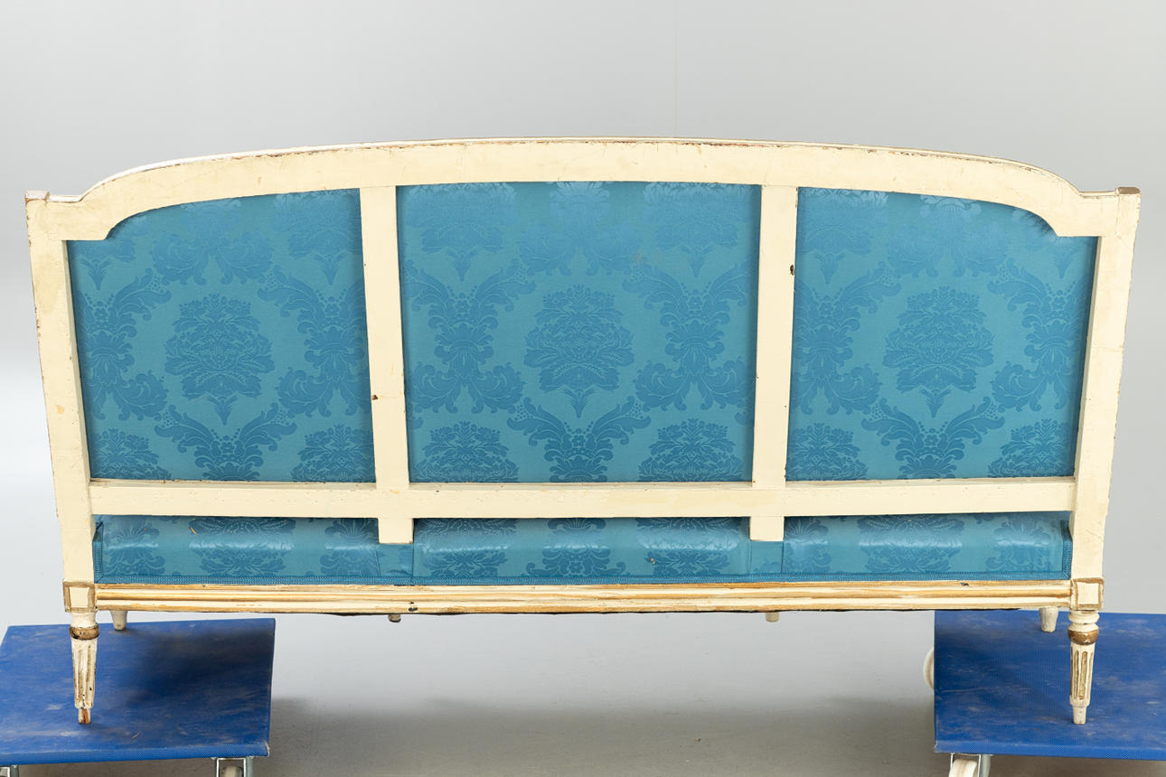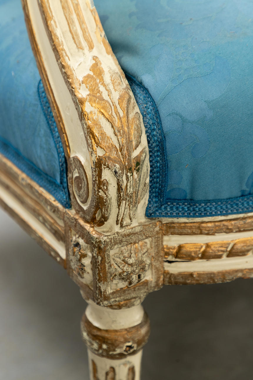 Holz, antikweiß gefaßt mit verschiedenen Schnittdekoren. Der hohe Rücken, sowie die Sitzfläche mit blauem sog. Damast Stoff in blau, auf konischen, kannelierten Beinen. Akanthusblätter auf den eingezogenen Armstützen.
