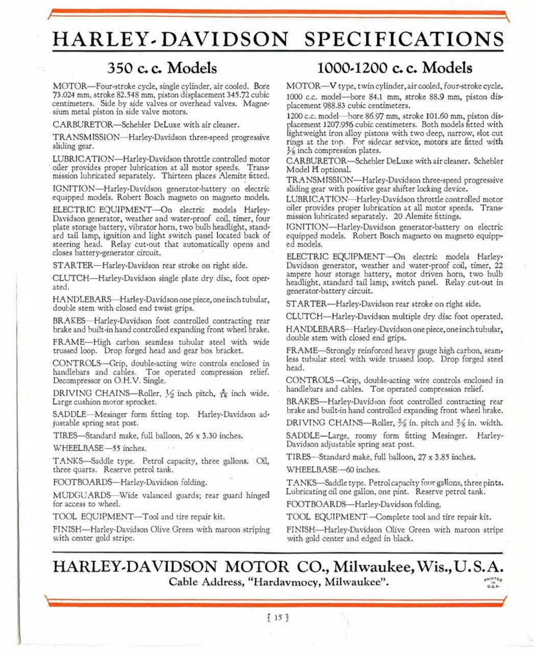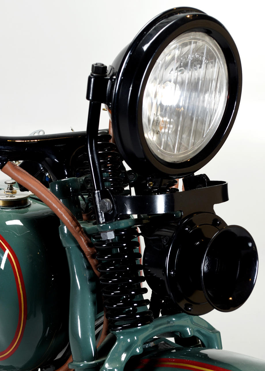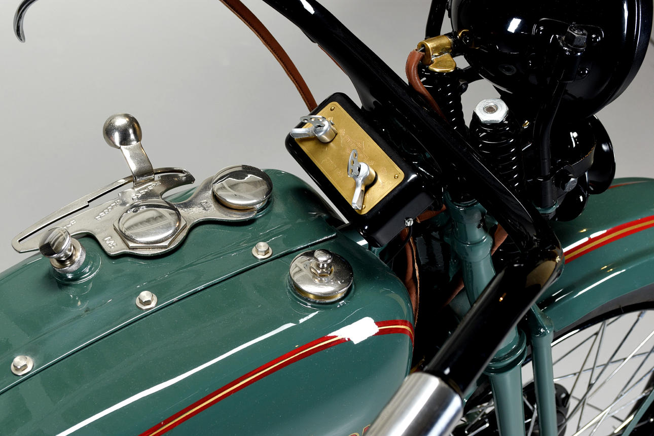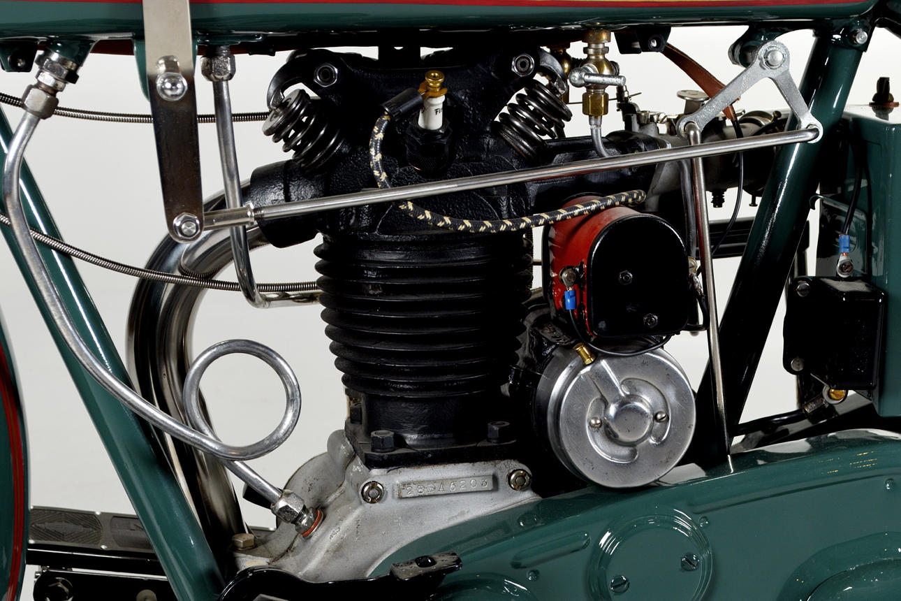 1-Zylinder, 21,1 Kubikzoll/346 cm³, OHV, Einkanal-Absperrhahn, Schebler-Vergaser, Batterie/Spule, Generator, 3-Gang-Schaltgetriebe, Kickstart, Springer-Vorderradgabel, Trommelbremse vorne, Bremsgurt hinten, Ledersattel, 26-Zoll-Felgen, Front- und Rücklichter, Signalhorn, Werkzeugsatz und Gepäckträger.