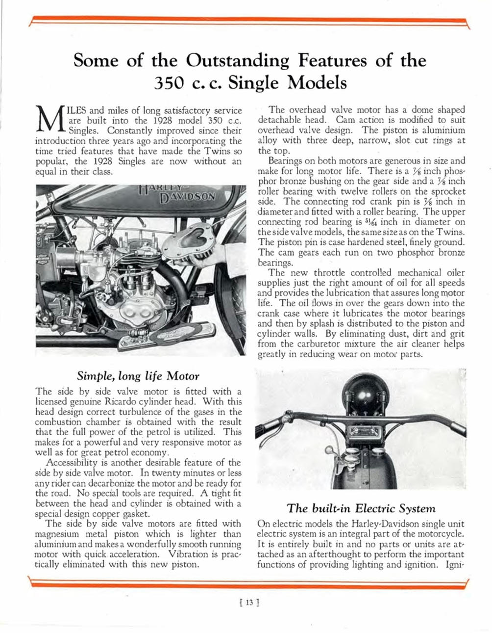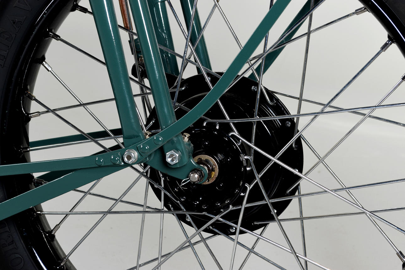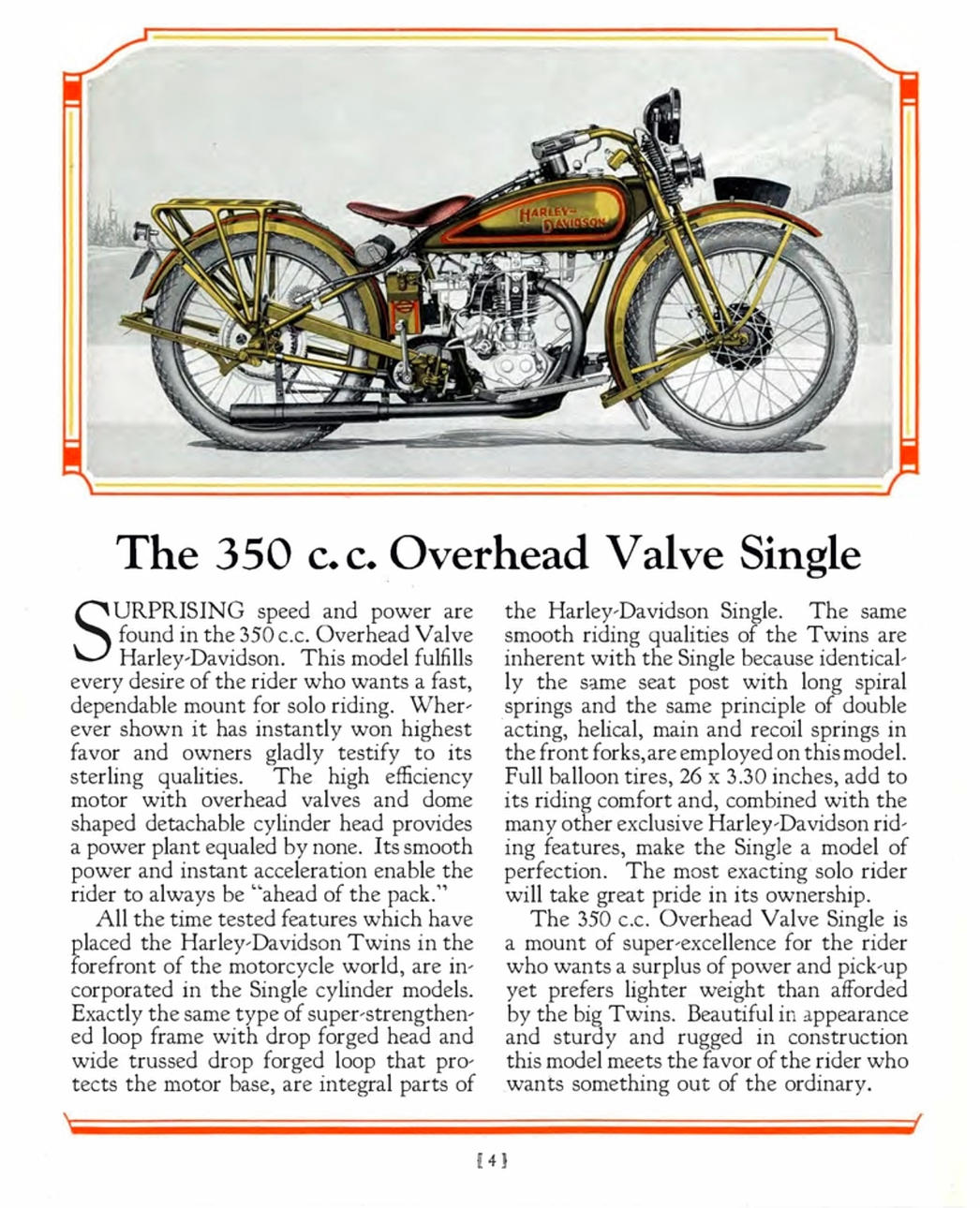 1-Zylinder, 21,1 Kubikzoll/346 cm³, OHV, Einkanal-Absperrhahn, Schebler-Vergaser, Batterie/Spule, Generator, 3-Gang-Schaltgetriebe, Kickstart, Springer-Vorderradgabel, Trommelbremse vorne, Bremsgurt hinten, Ledersattel, 26-Zoll-Felgen, Front- und Rücklichter, Signalhorn, Werkzeugsatz und Gepäckträger.