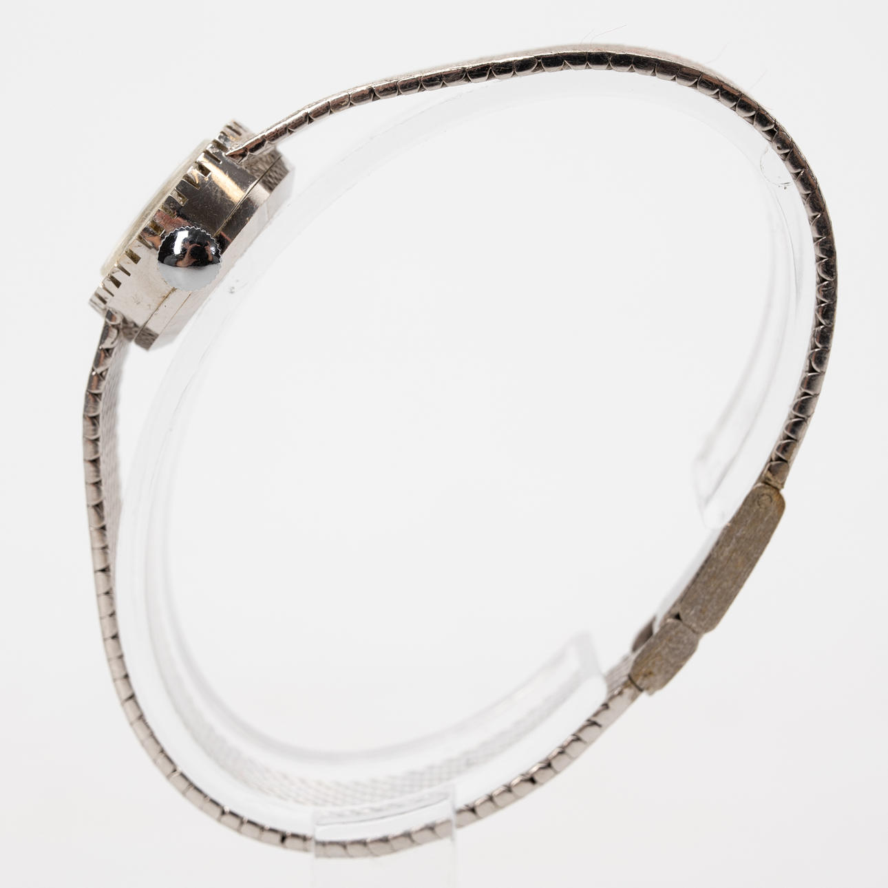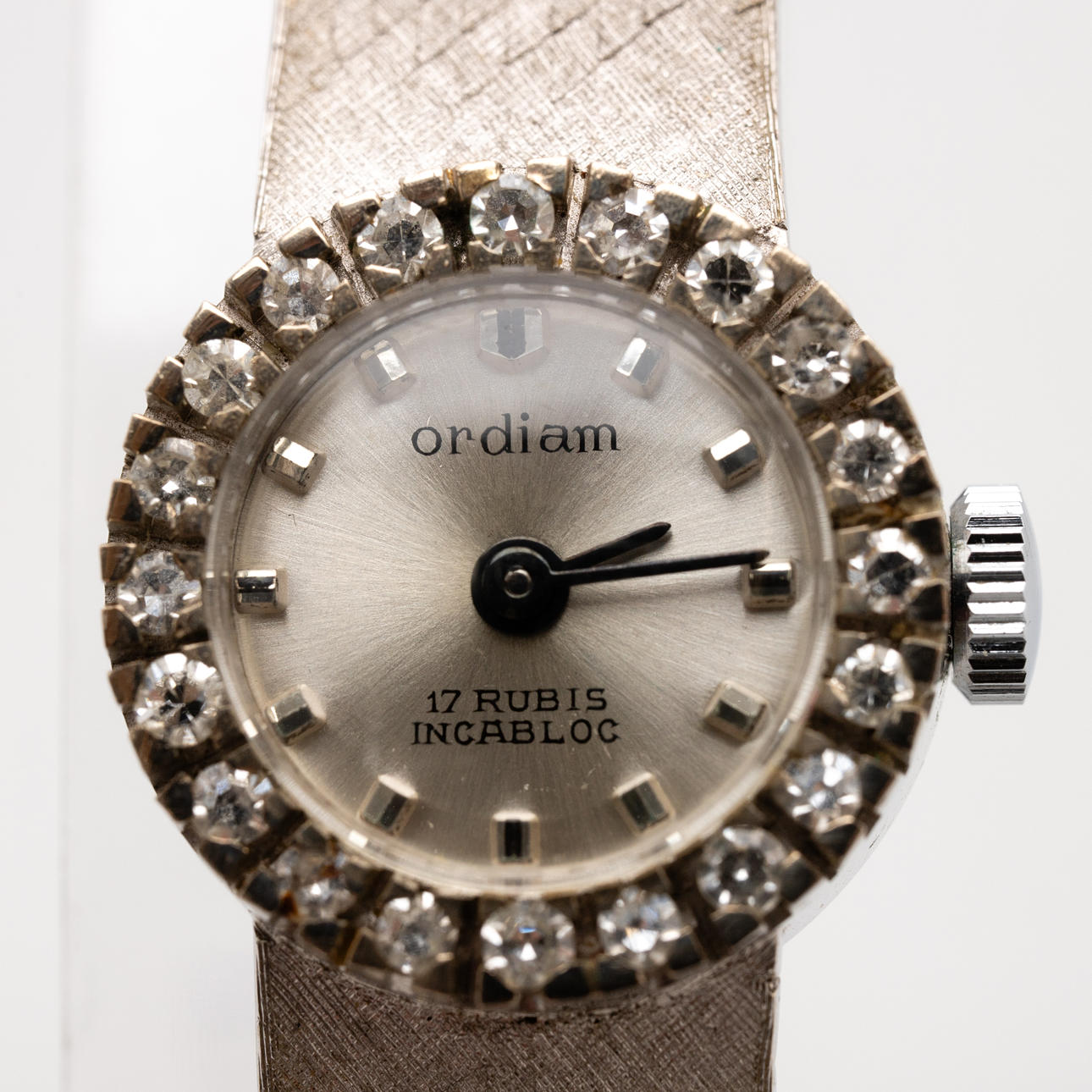 Armbanduhr von Ordiam, Handaufzug, gefertigt aus 585er Weißgold, Gehäuse mit Diamanten besetzt, Zifferblatt mit Minuten- und Stunden Zeiger, Maße ca. Gehäuse ∅ 17 mm, Länge 18 cm. Gewicht ca. 29,5 Gramm. Zum Zeitpunkt der Begutachtung lief die Uhr, Stockhoms Auktionsverk garantiert nicht für die Funktionalität.