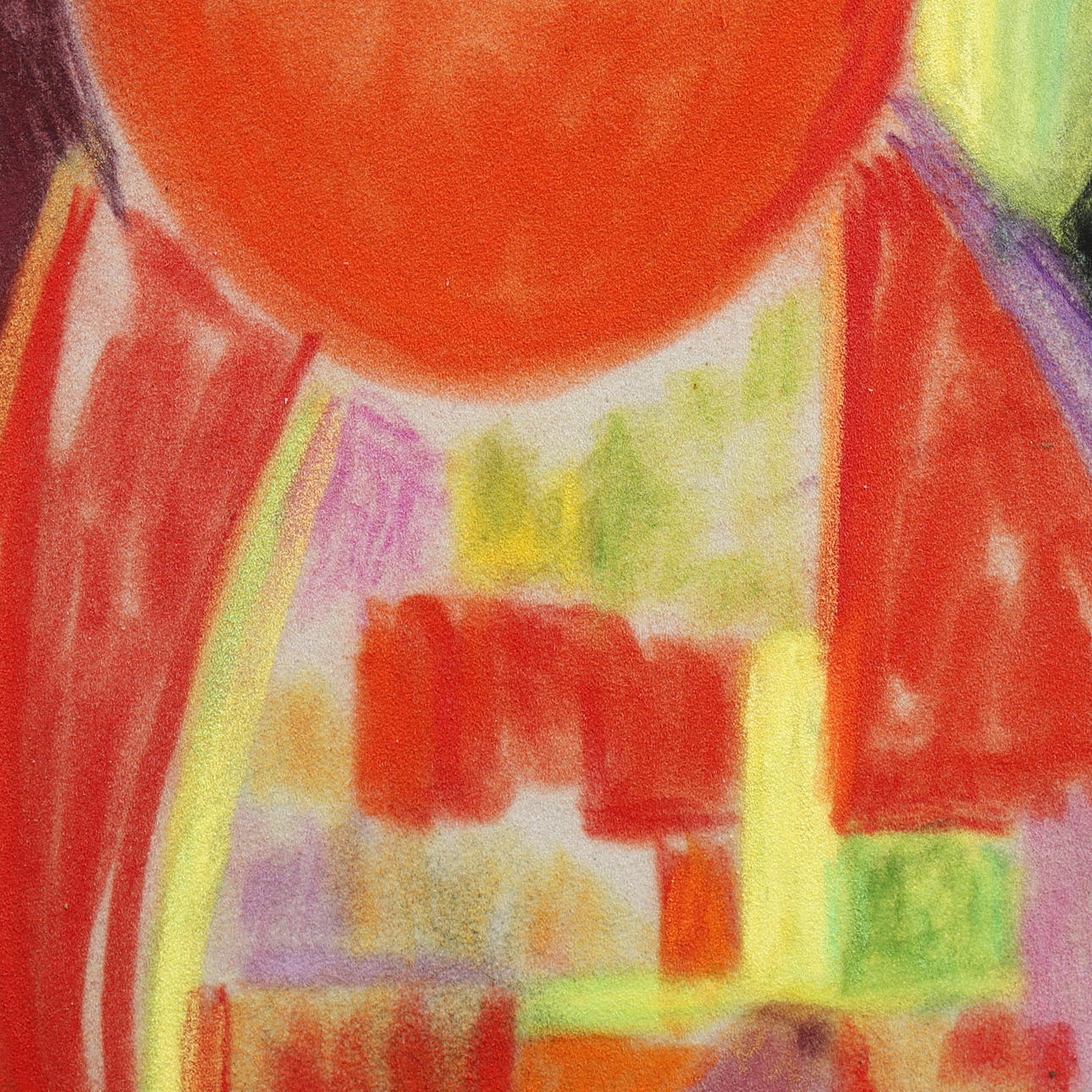 Intensive Farben auf einer extrem faserigen, filzähnlichen Oberfläche. Professionell neu gerahmt mit übertragener Widmung auf Etikett à verso „Till Käthie den 190 juni 1963 Musik TVH“.