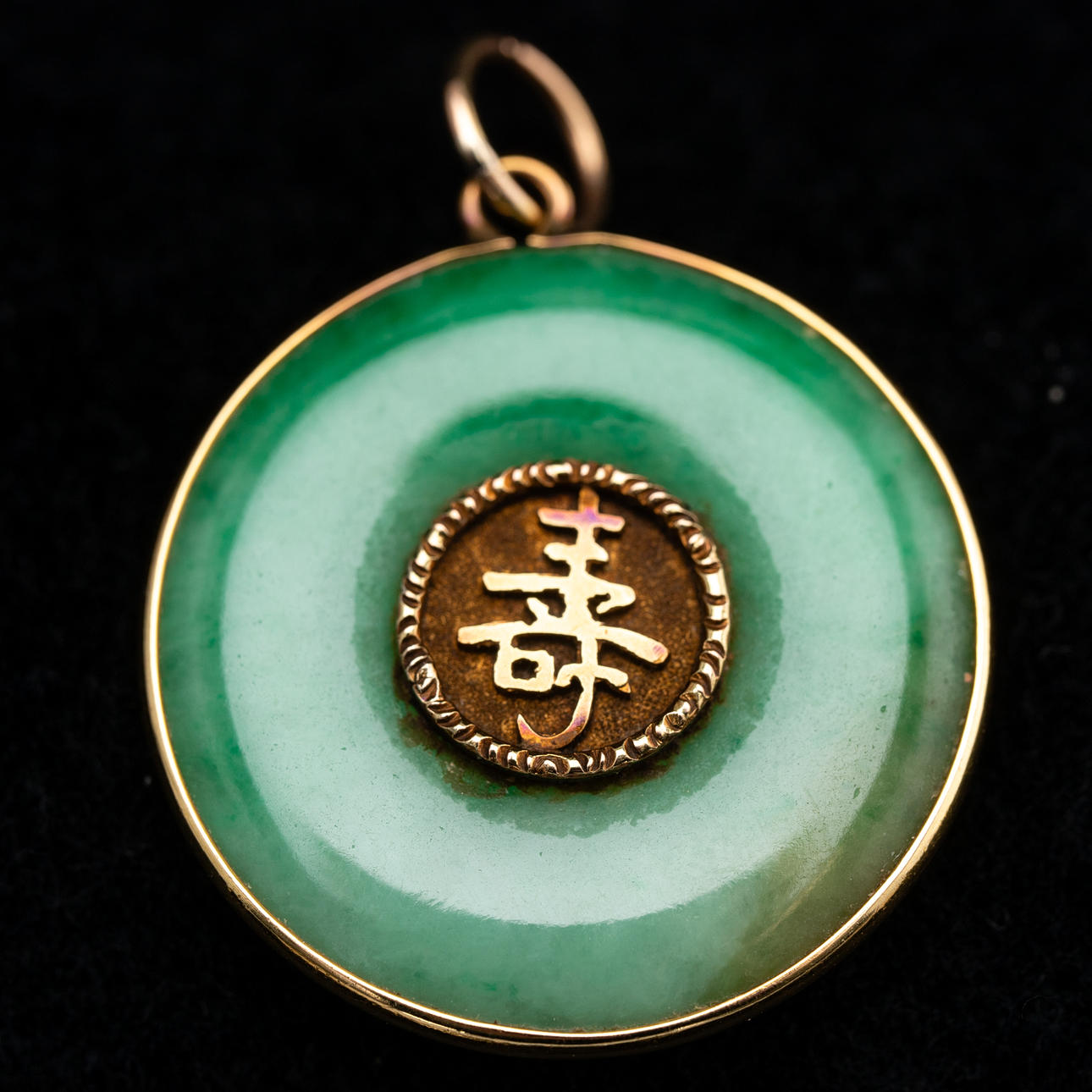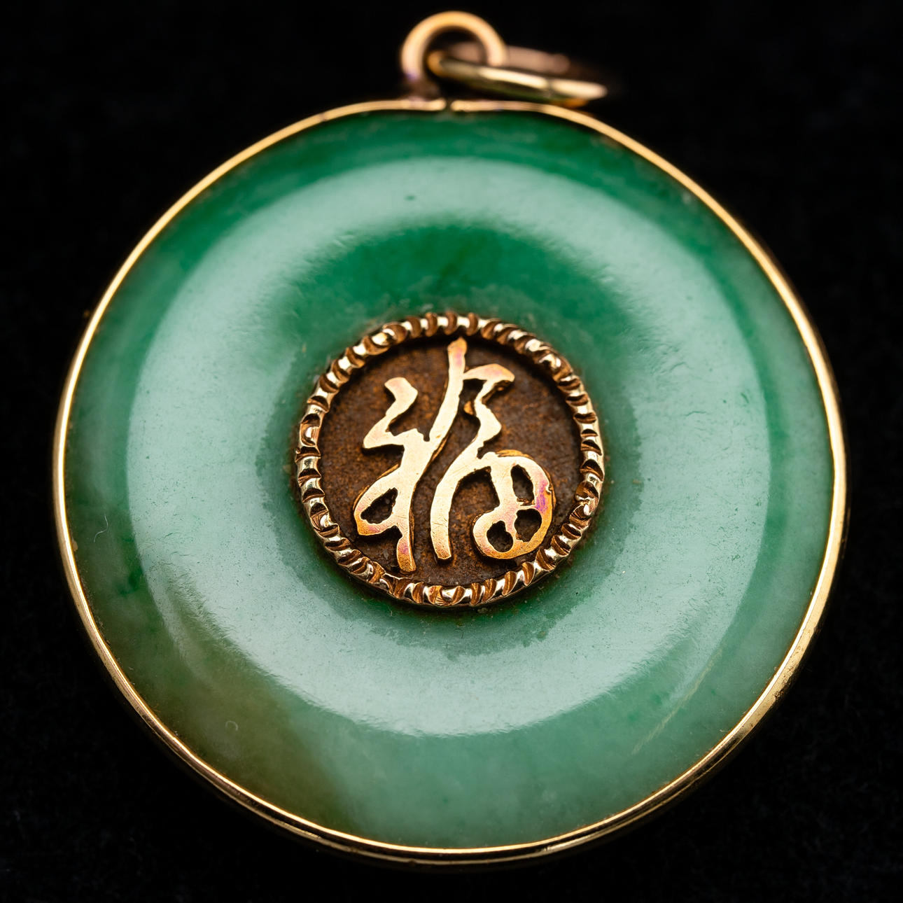 Jade und 14 Kt. / 585er Gold. Medaillon mit Schriftzeichen ''Fu'' und ''Shou''. Dm.: ca. 2,5 cm, ca. 6 g.