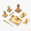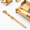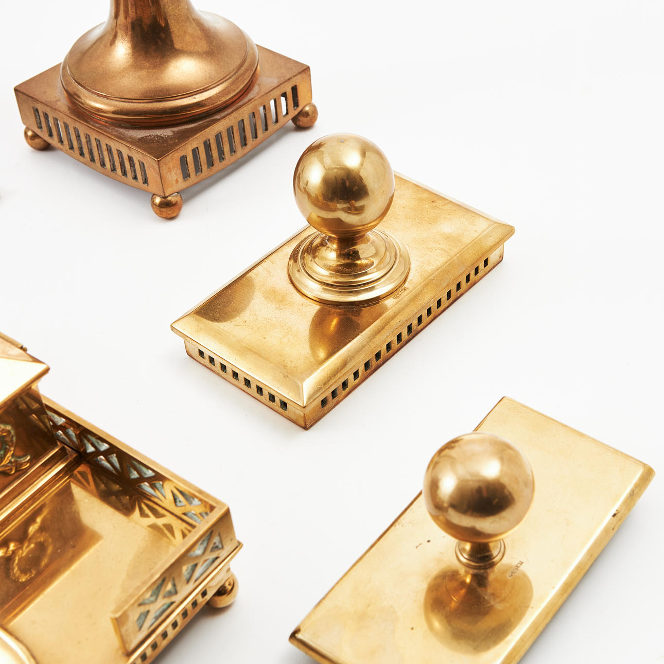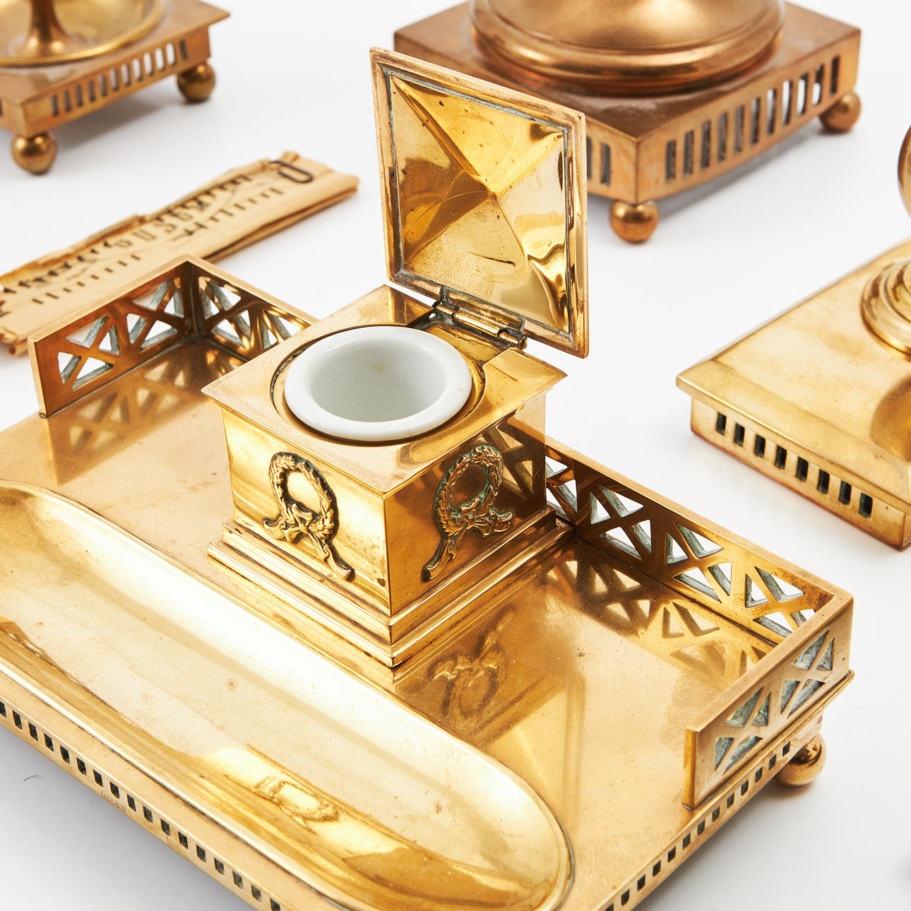 Tintenständer, Natronpapierhalter, Schreibwarenpresse, Taschenuhrenständer, Schreibwarenmesser, Streichholzschachtelhalter und Kerzenhalter