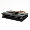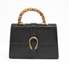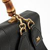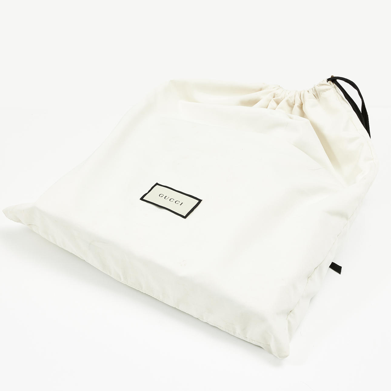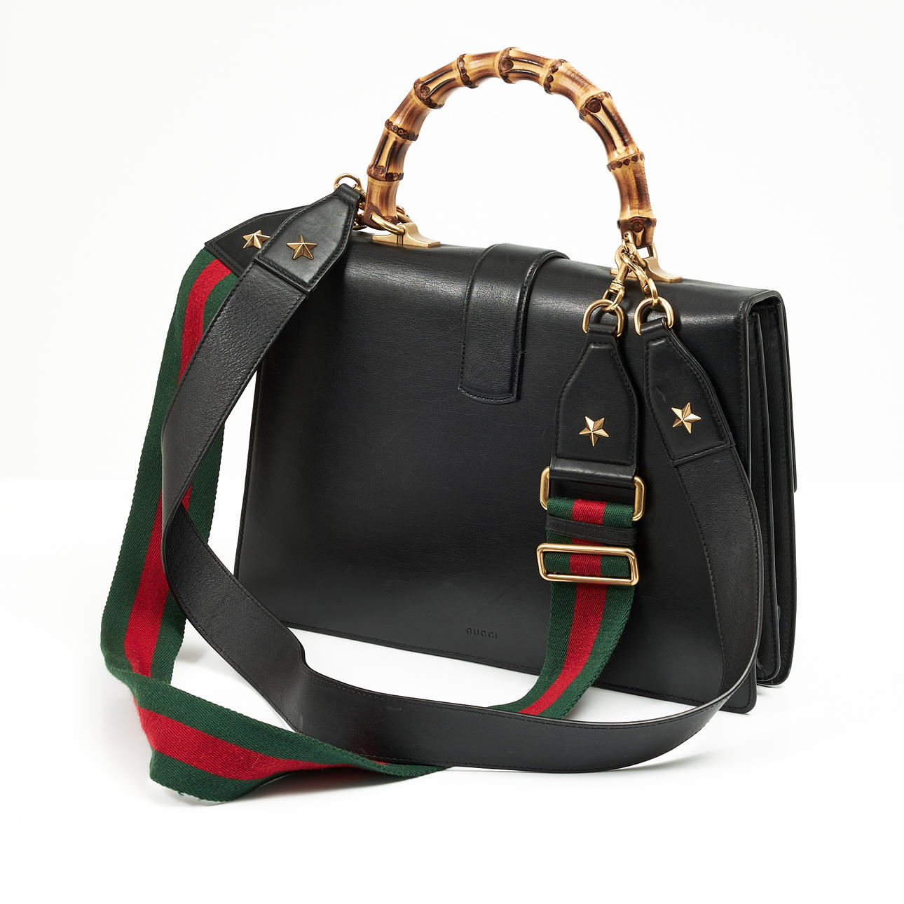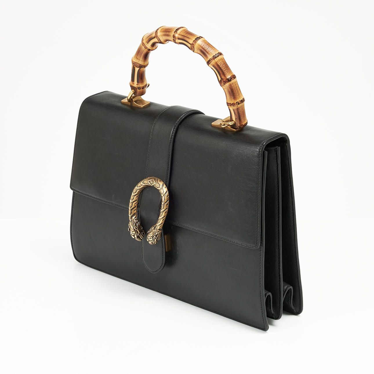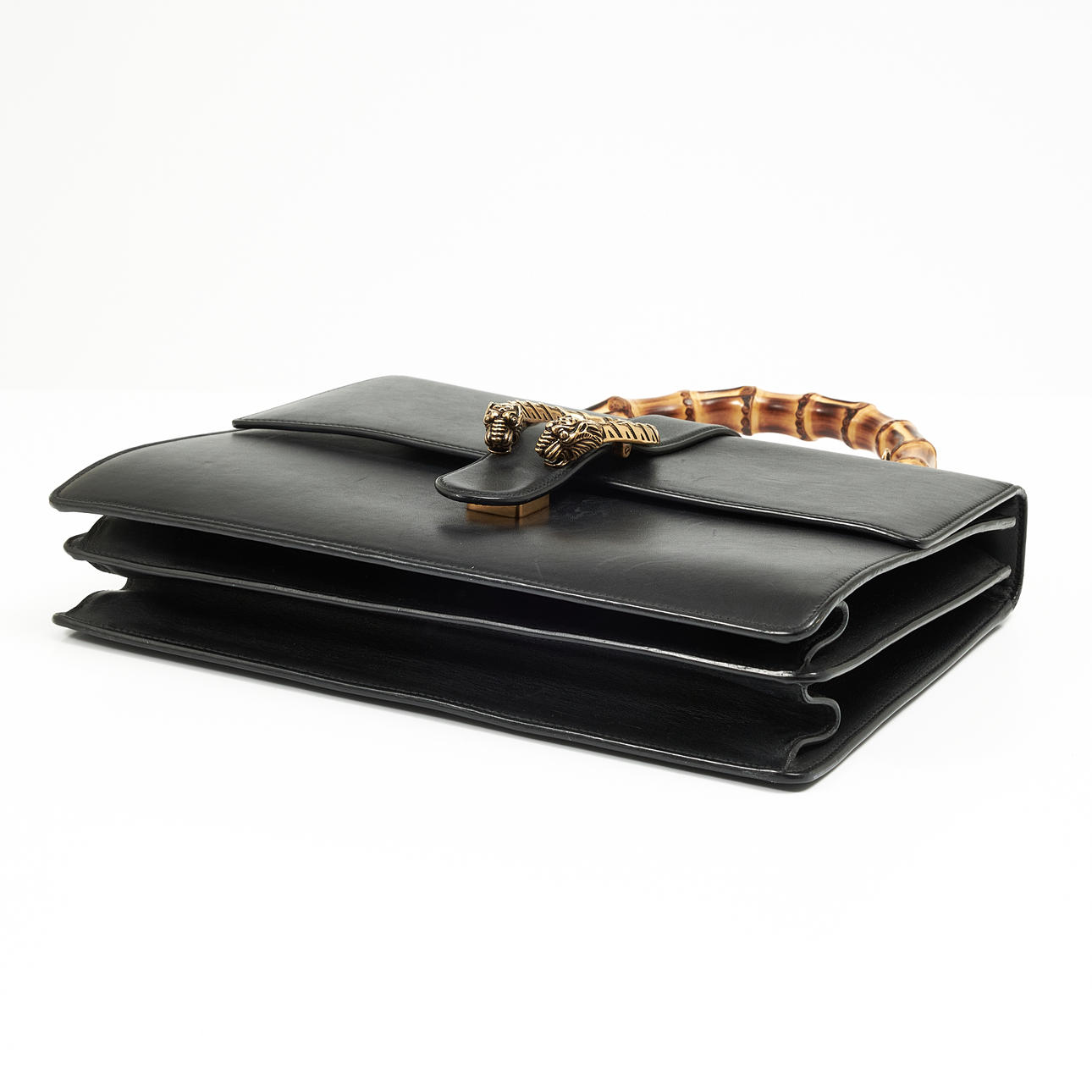 Schwarzes Leder mit Griff aus Bambusimitat an der Oberseite, zwei abnehmbaren Schultergurten und Guccis charakteristischer Tigerkopfschnalle. Innen drei größere Fächer, eines mit Reißverschluss und drei kleinere, die mit beigem Canvas ausgekleidet sind. Etikett mit der Aufschrift „GUCCI made in italy“ und mit Seriennummer. 34 x 24 x 6 cm