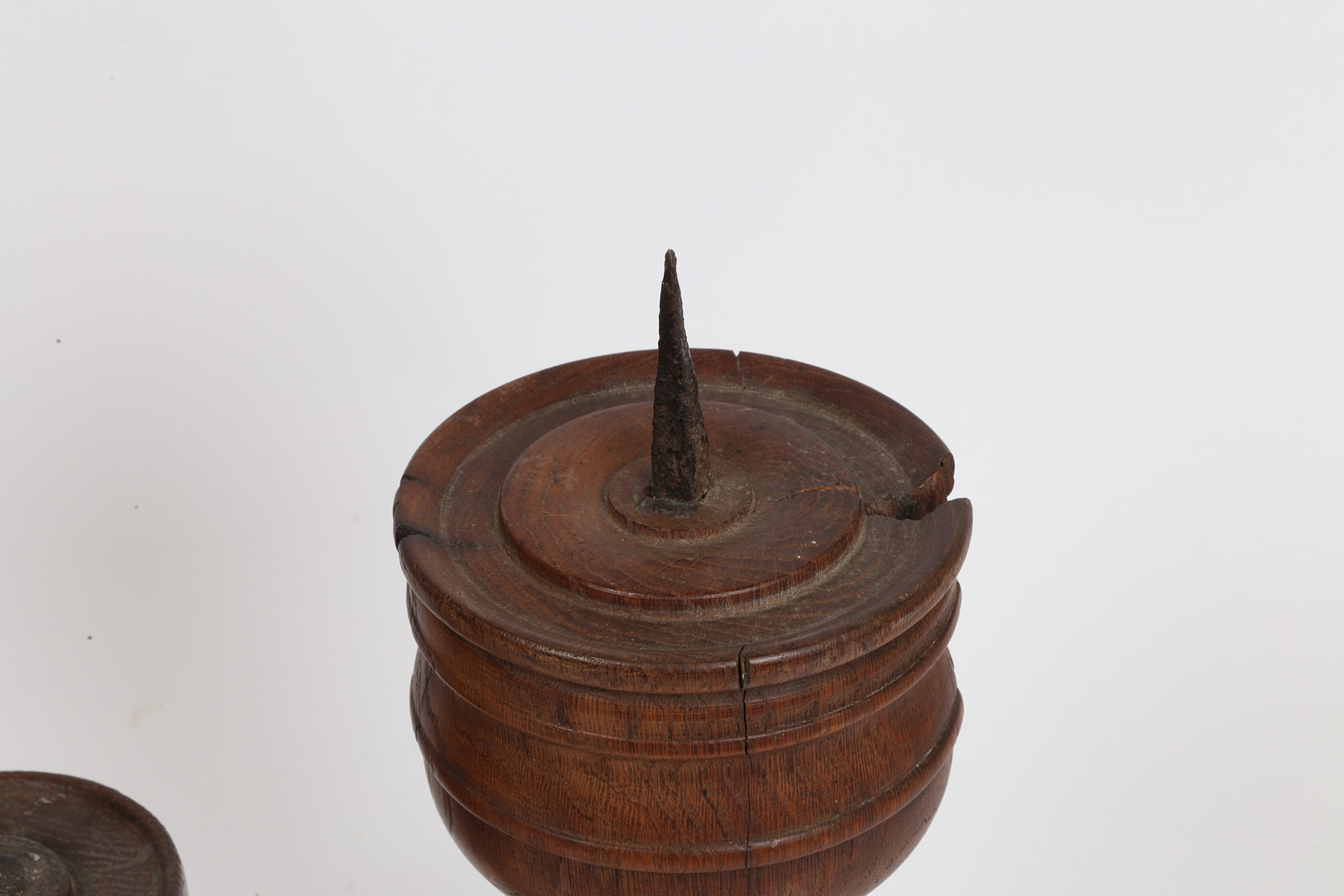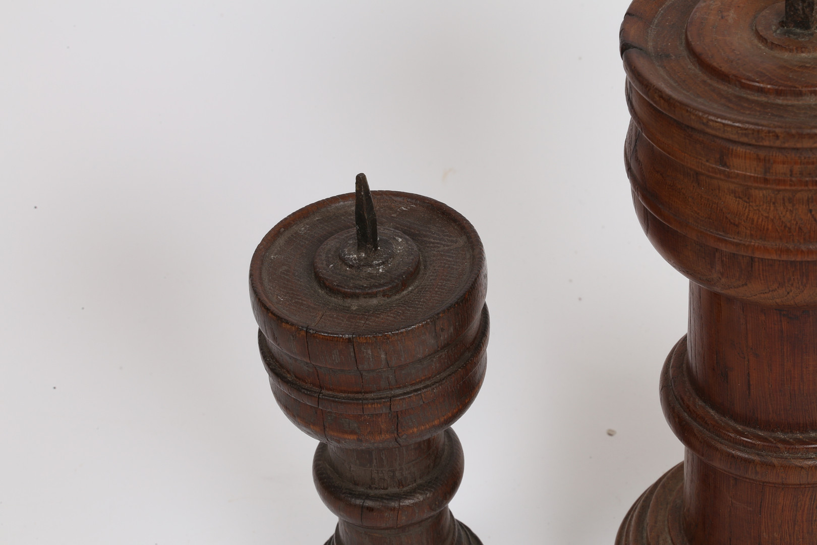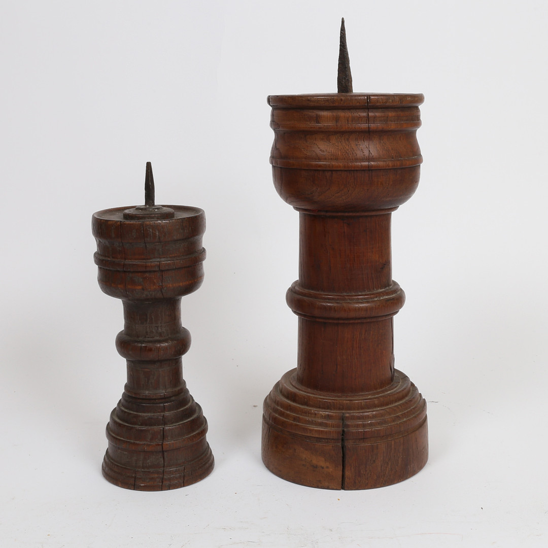 3939925. ZWEI GEDRECHSELTE HÖLZERNE PRICKET-LEUCHTER.