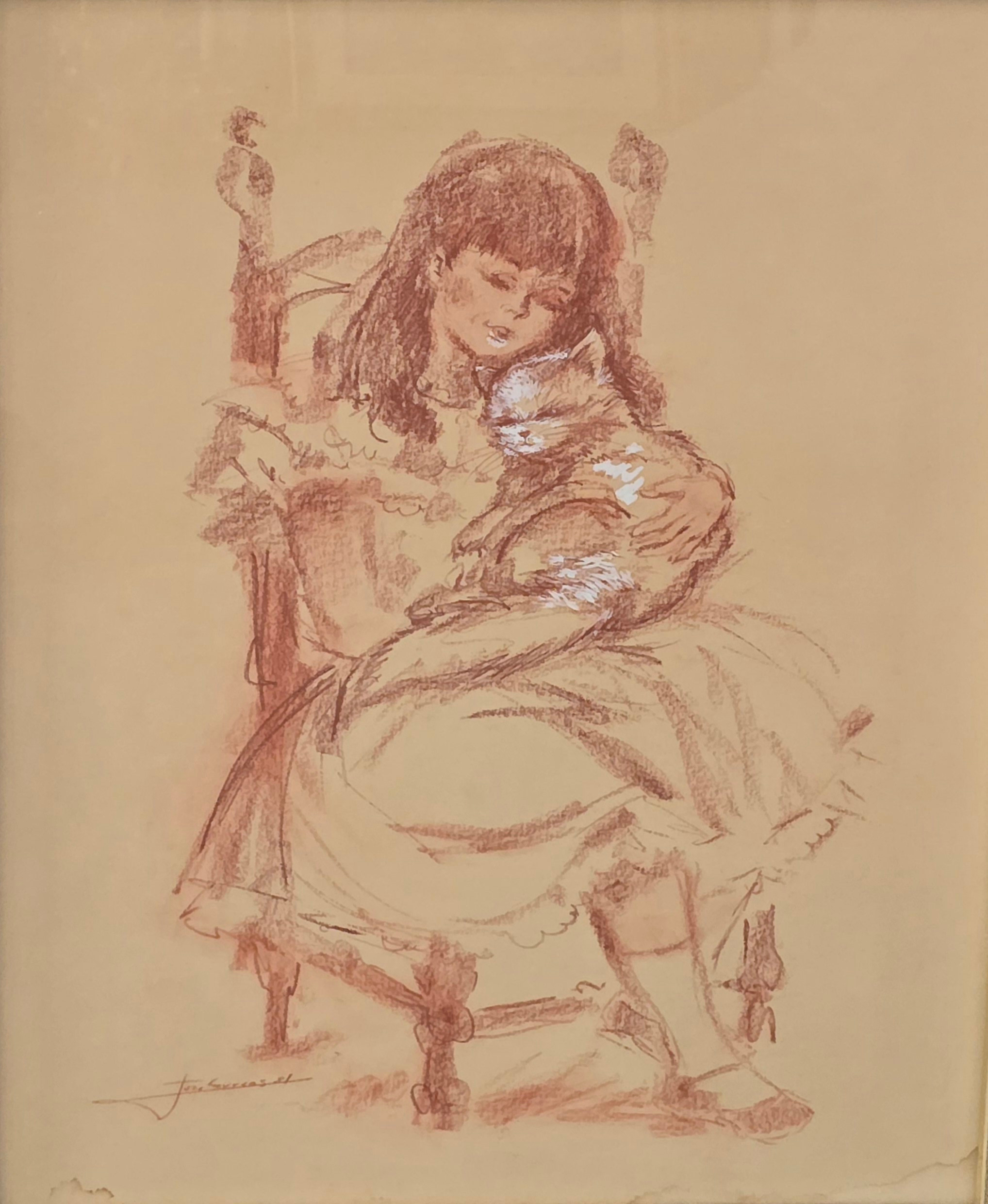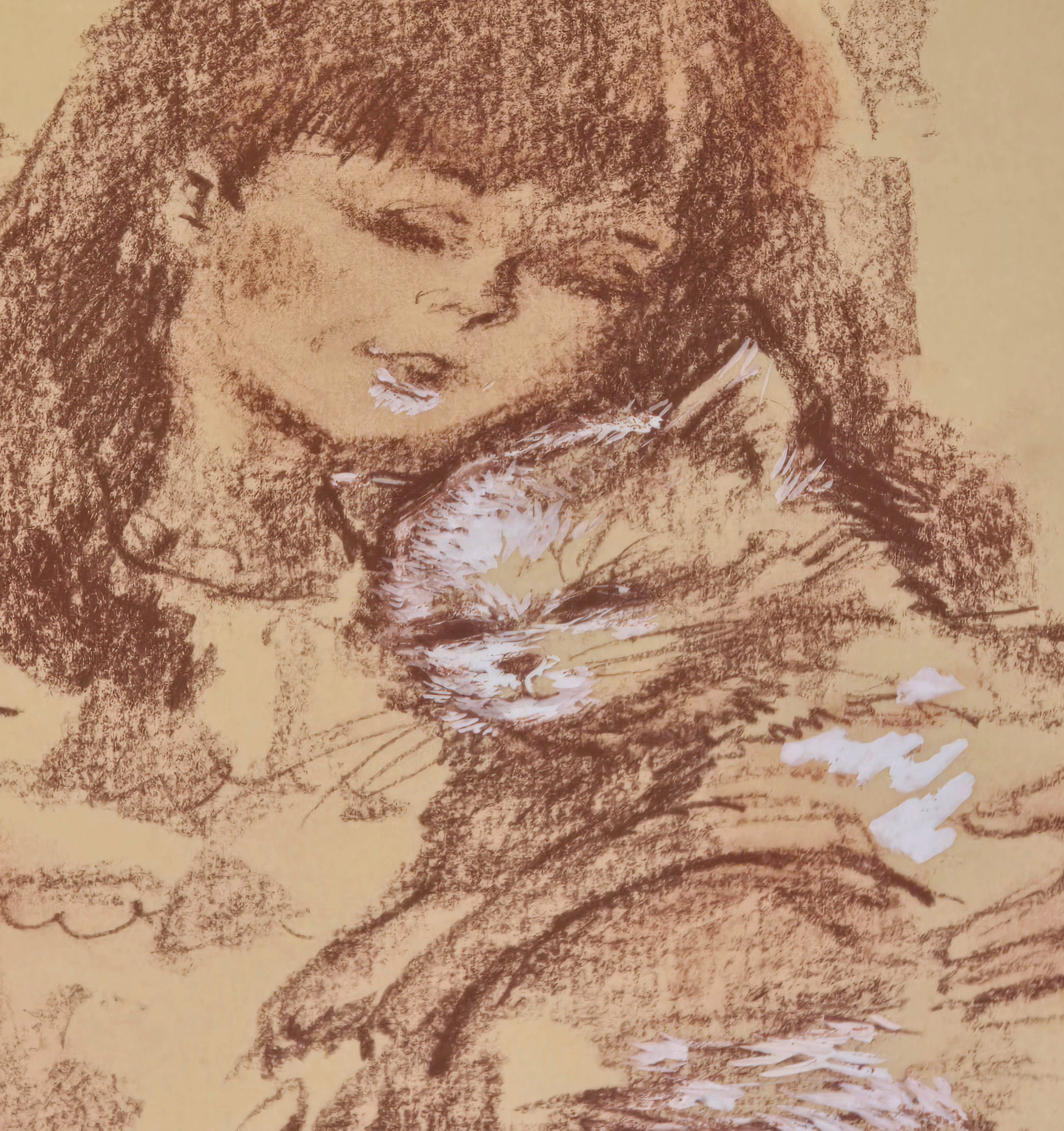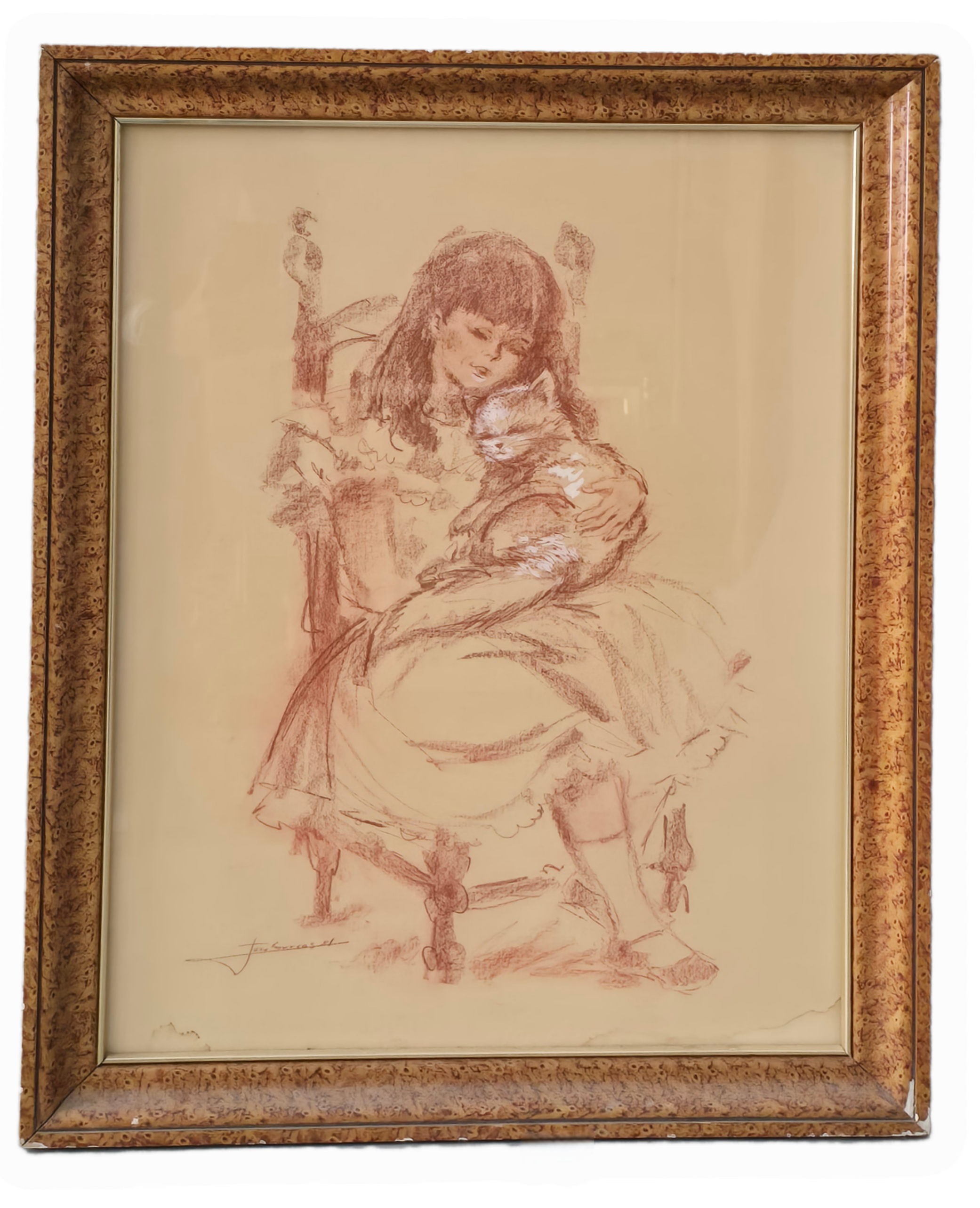 3945899. JOSÉ CORREAS. KLARE ZEICHNUNG. MÄDCHEN MIT EINER KATZE.