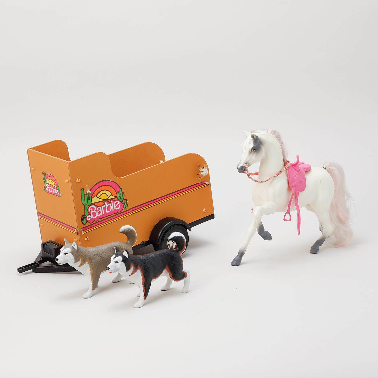 Unter anderem Kleidung, Fahrrad, Campingbus, Auto mit Pferdekutsche, Pferd und zwei Hunde. Originalverpackung ist verfügbar.