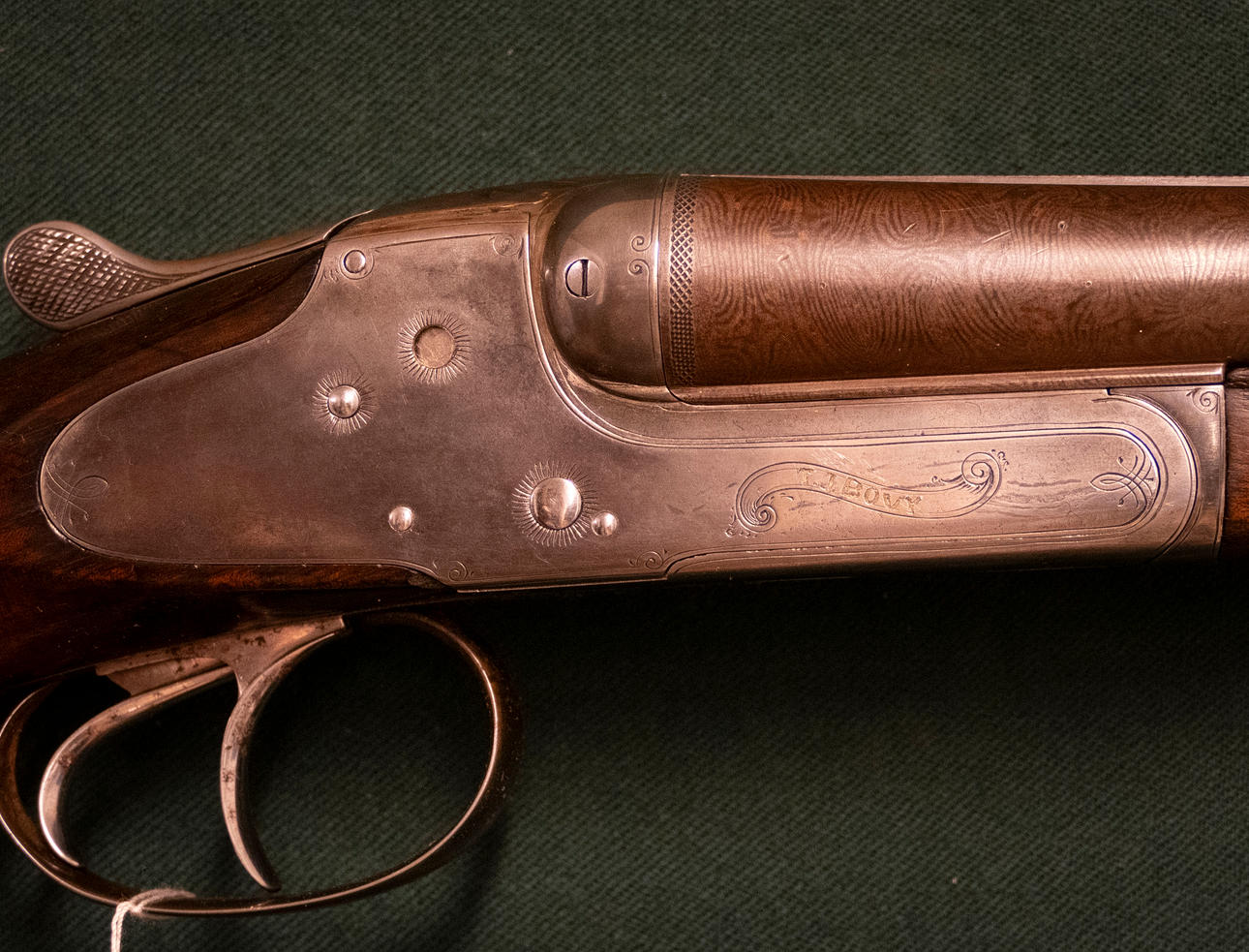 Shotgun Belgian SVs Hammerless. Mach T, J Bovy. Kaliber 16/65. Zusätzliche Nr. 413. Länge des Auslaufs 76 cm, mit Gamasche. Erweiterter Spawn mit Puppenkopf. Doppelauslöser mit Sicherung am Kolbenhals. Abnehmbare Seitenschlösser mit Fenstern. Gerade englische Flasche.
