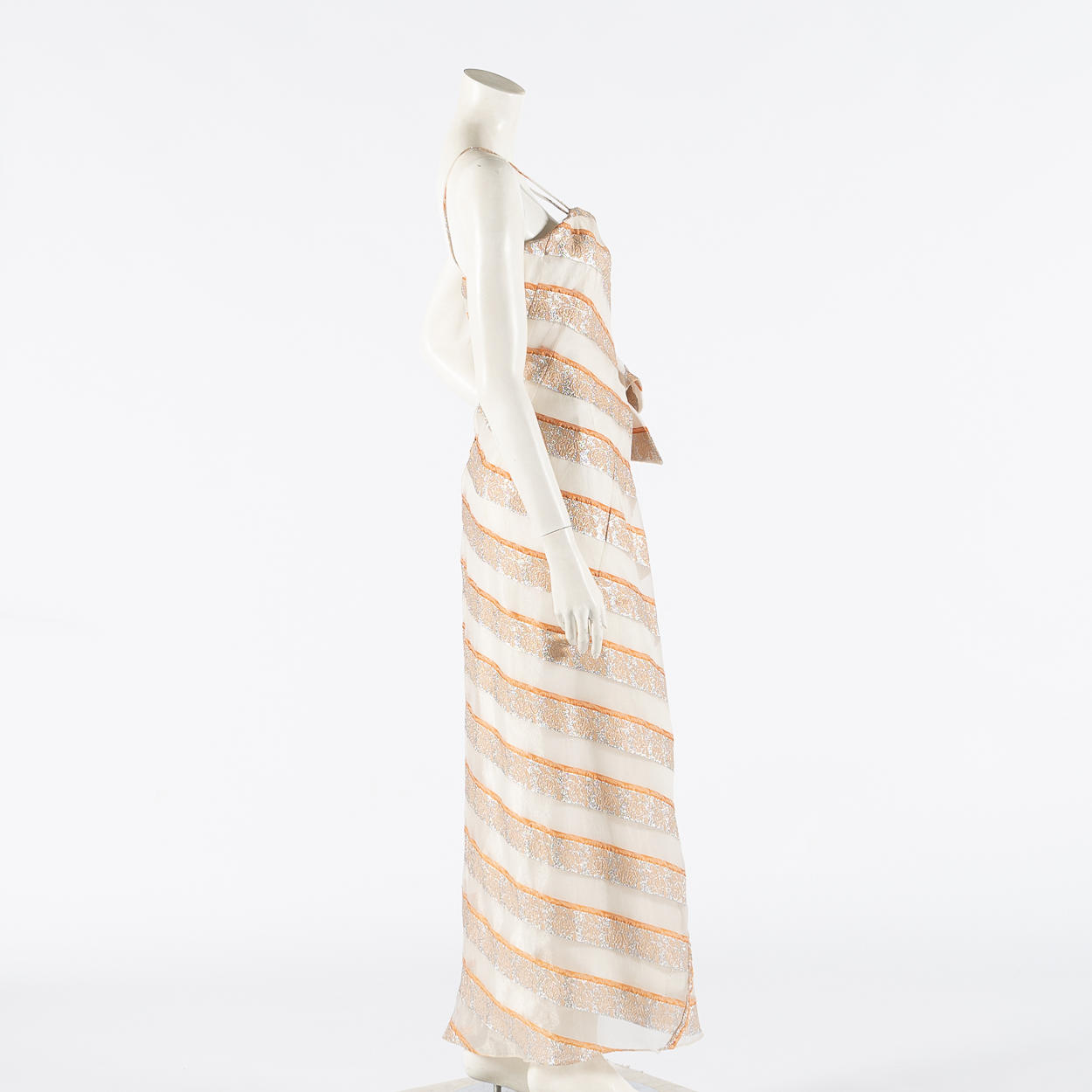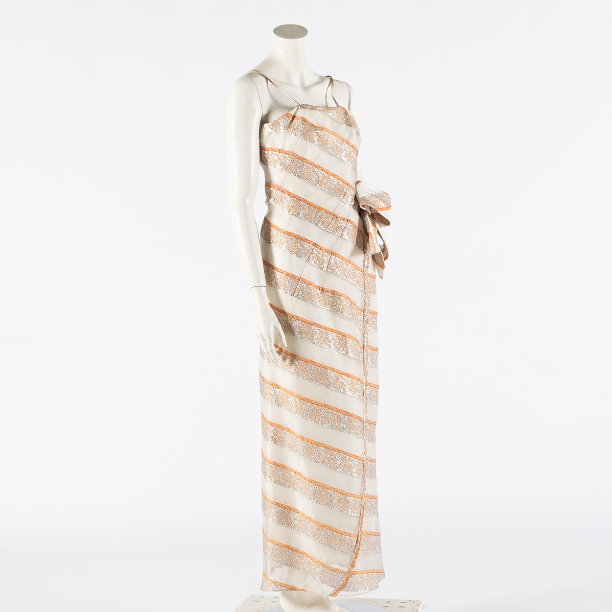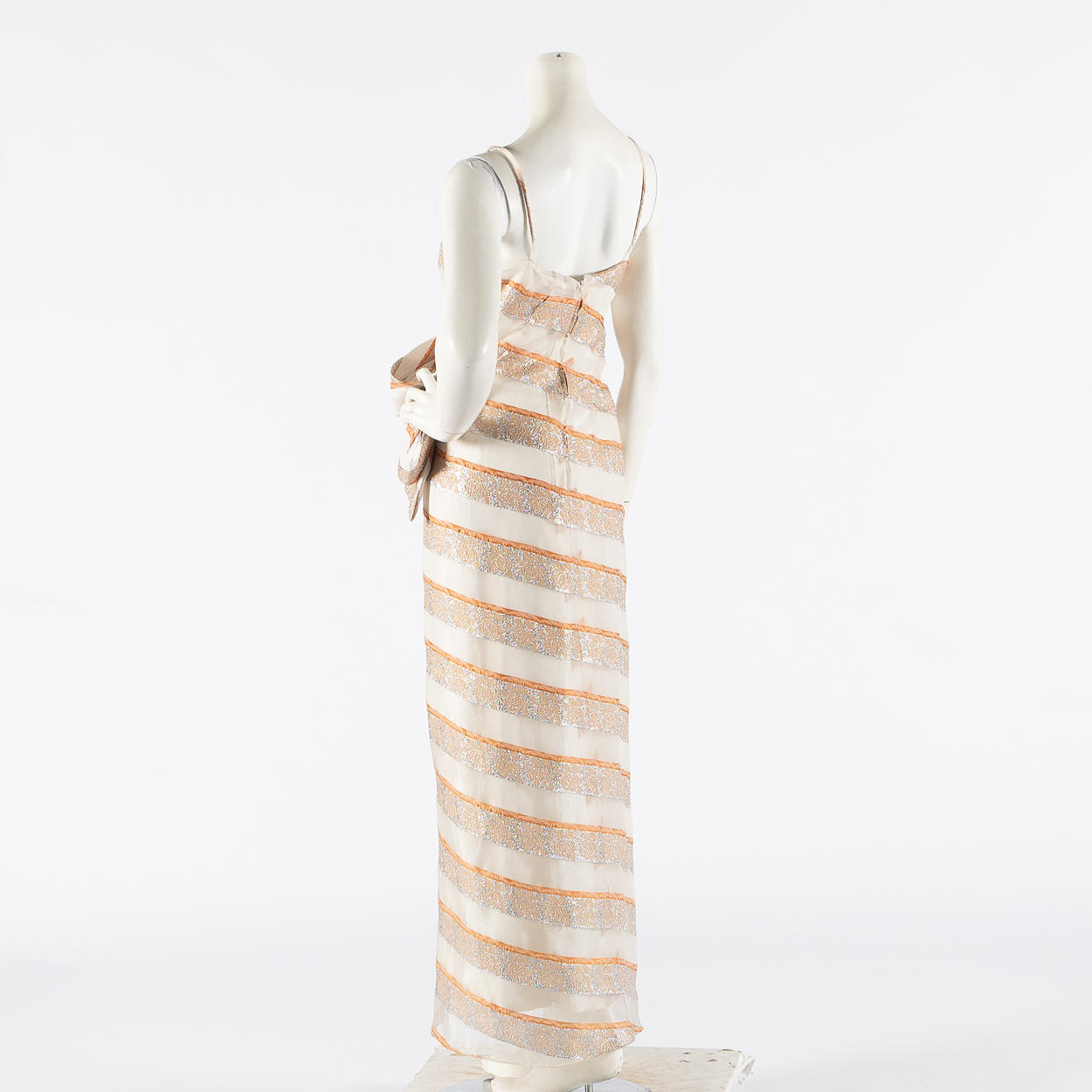 Körpernah geschnittenes Abendkleid aus Organzabrokat mit Applikation in Form einer Schleife. Reißverschluss auf der Rückseite. Schmale Schultergurte. Genähte Schienen im Leben. Gefüttert. Beschriftet. Geschätzte Größe etwa 36/38. Brustumfang ca. 85, Taille 70, Po 98 cm