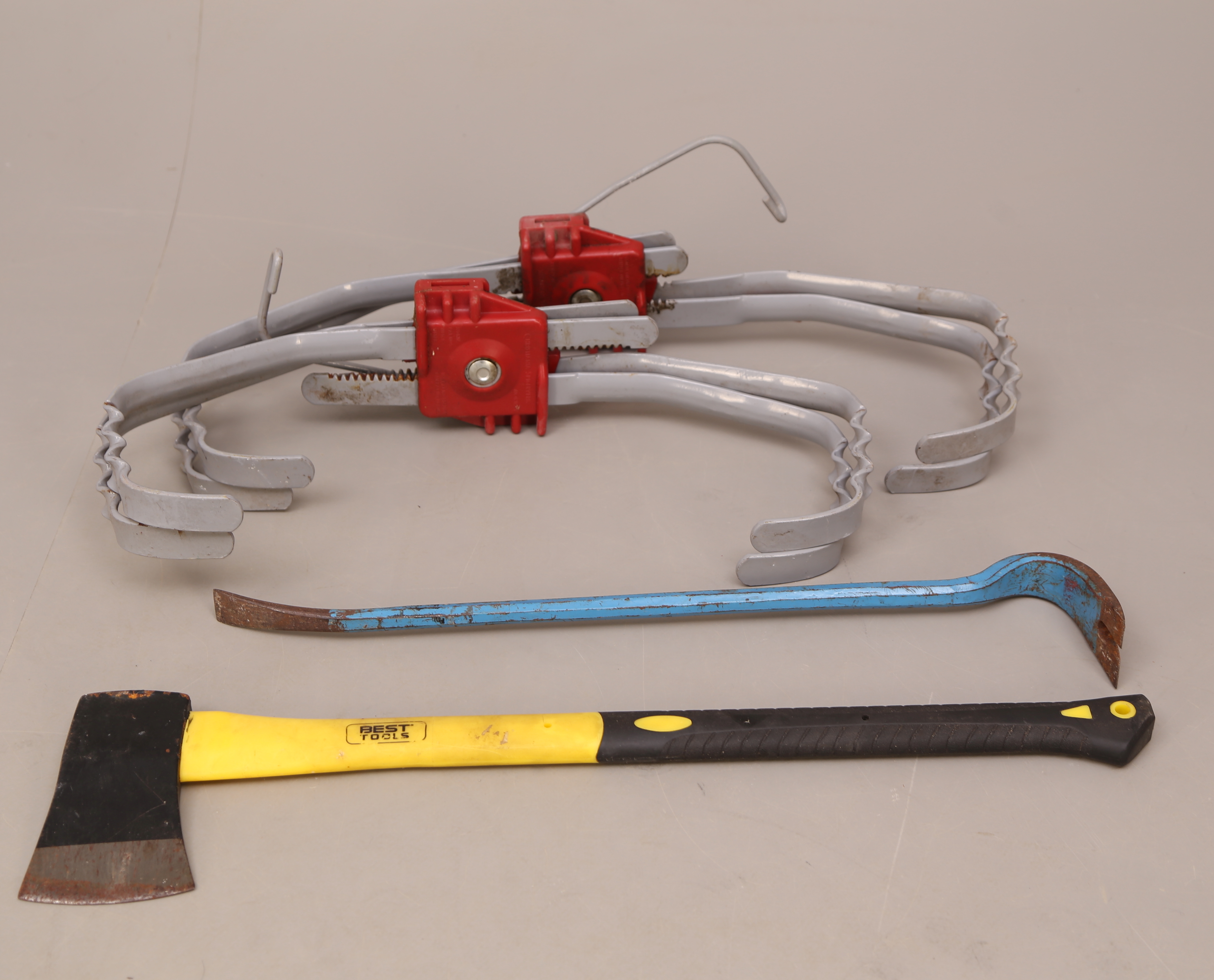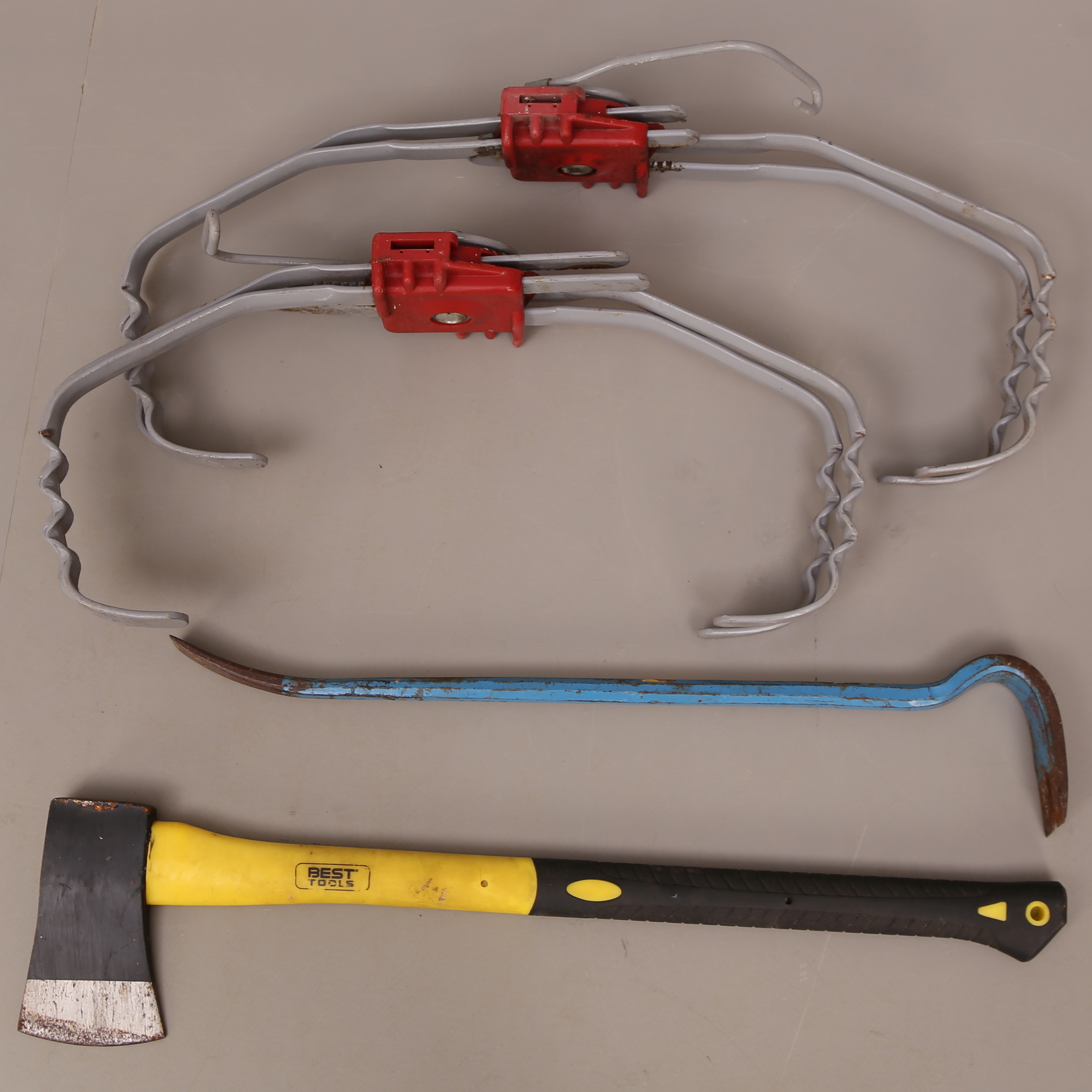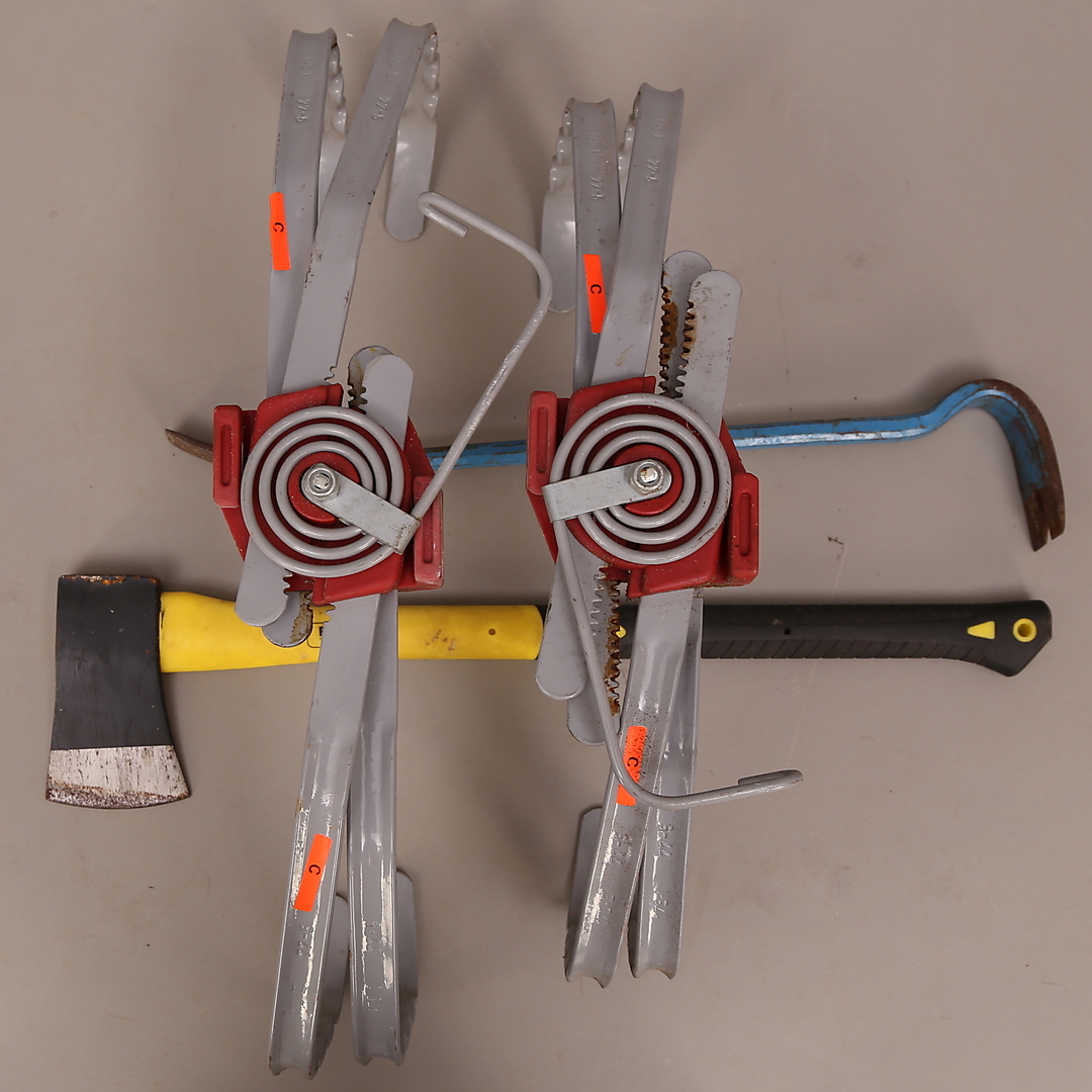 396309. SCHNEEEISEN, ein Paar + ZIEGELEISEN + AXT.