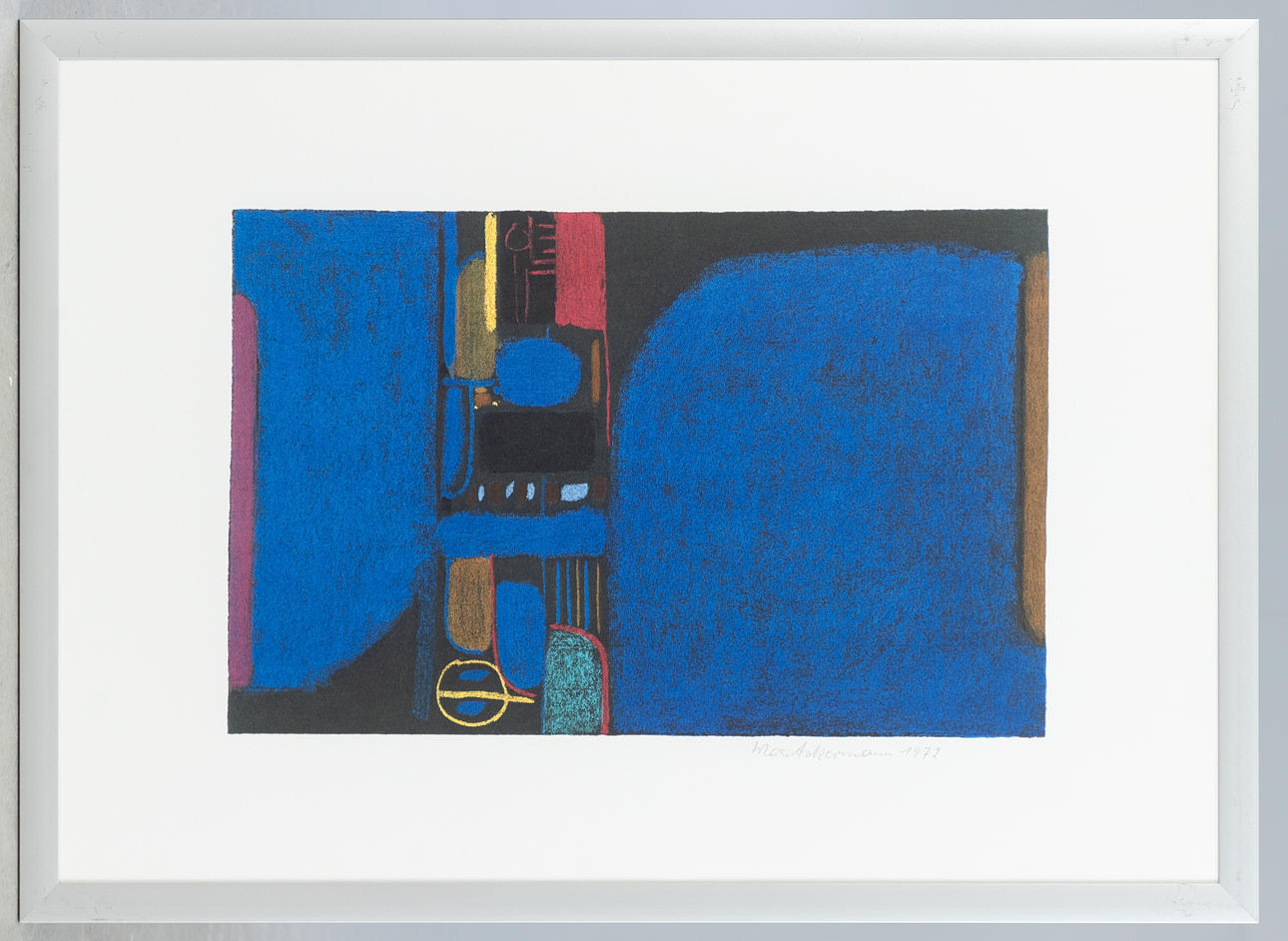 Max Ackermann (1887-1975), Überbrückte Kontinente V, Farbserigraphie, 1972, signiert und datiert, ohne Nummerierung (wohl als Jahresgabe für den Kunstverein), ca. 31 x 48 cm, hinter Glas gerahmt, mit Rahmen ca. 53,5 x 73 cm.