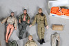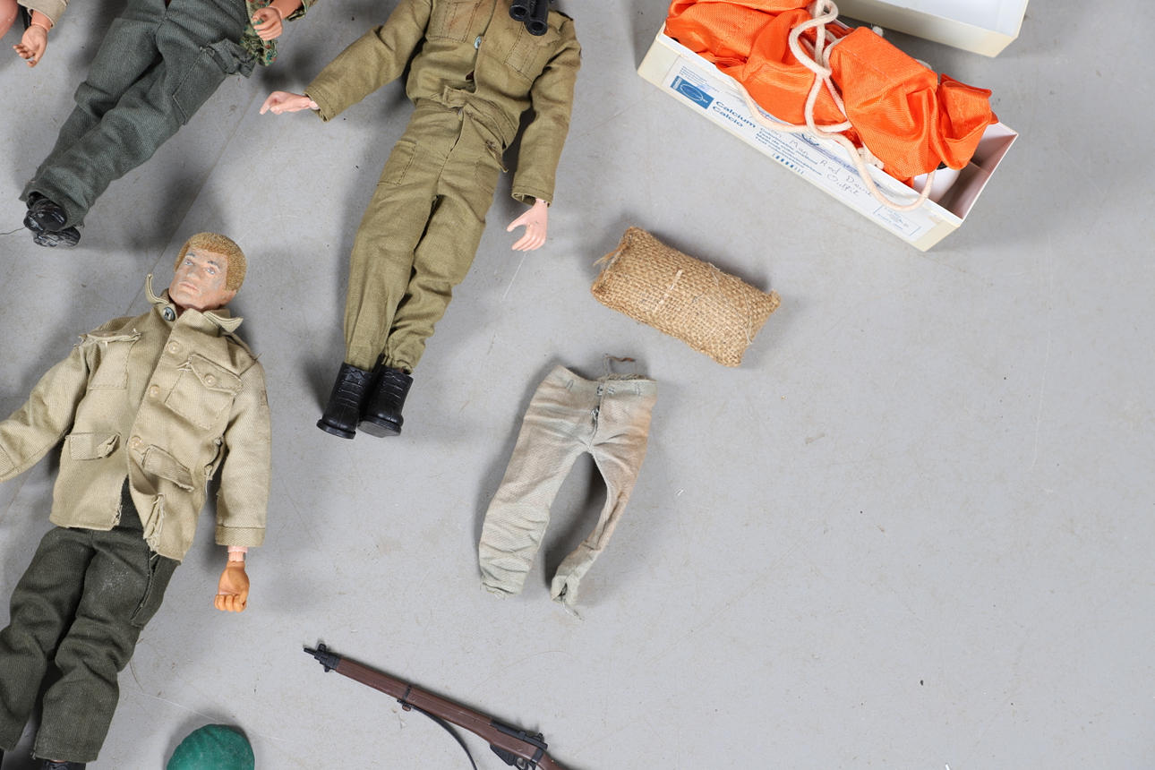 Vier Action-Man-Figuren und eine große Menge an Zubehör und Ausrüstung, darunter Tauchausrüstung, Fallschirm, Militärausrüstung usw.