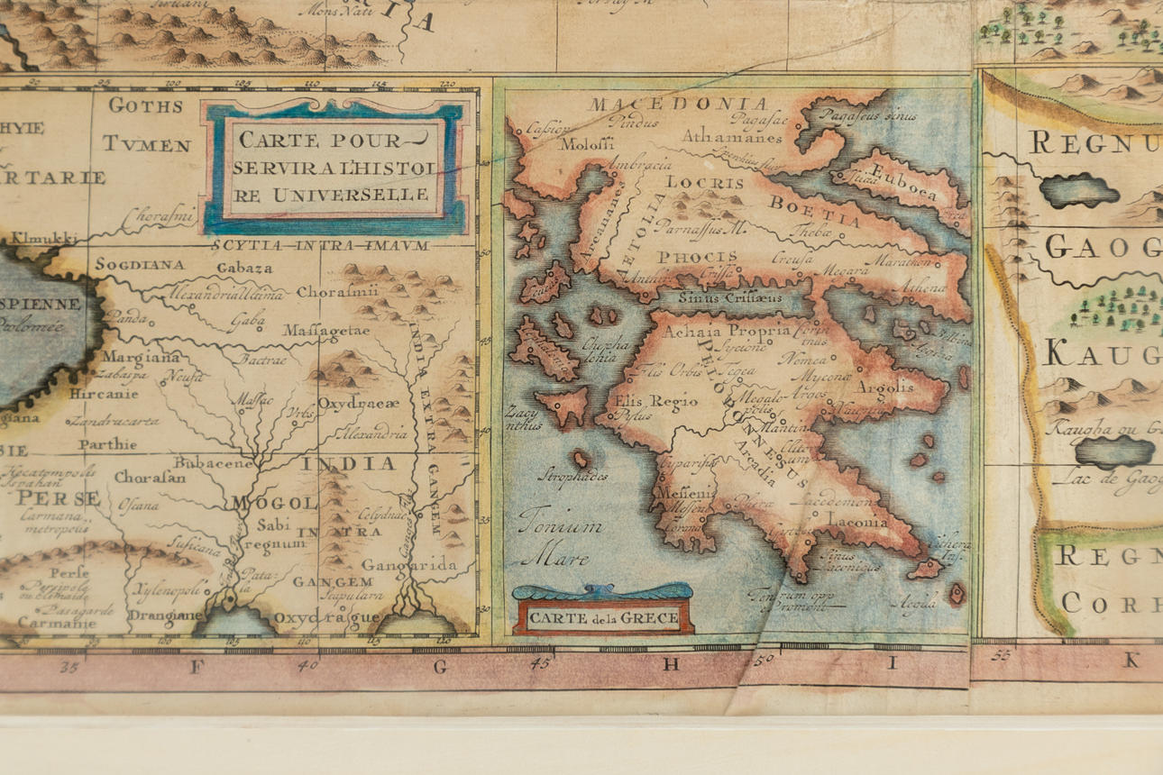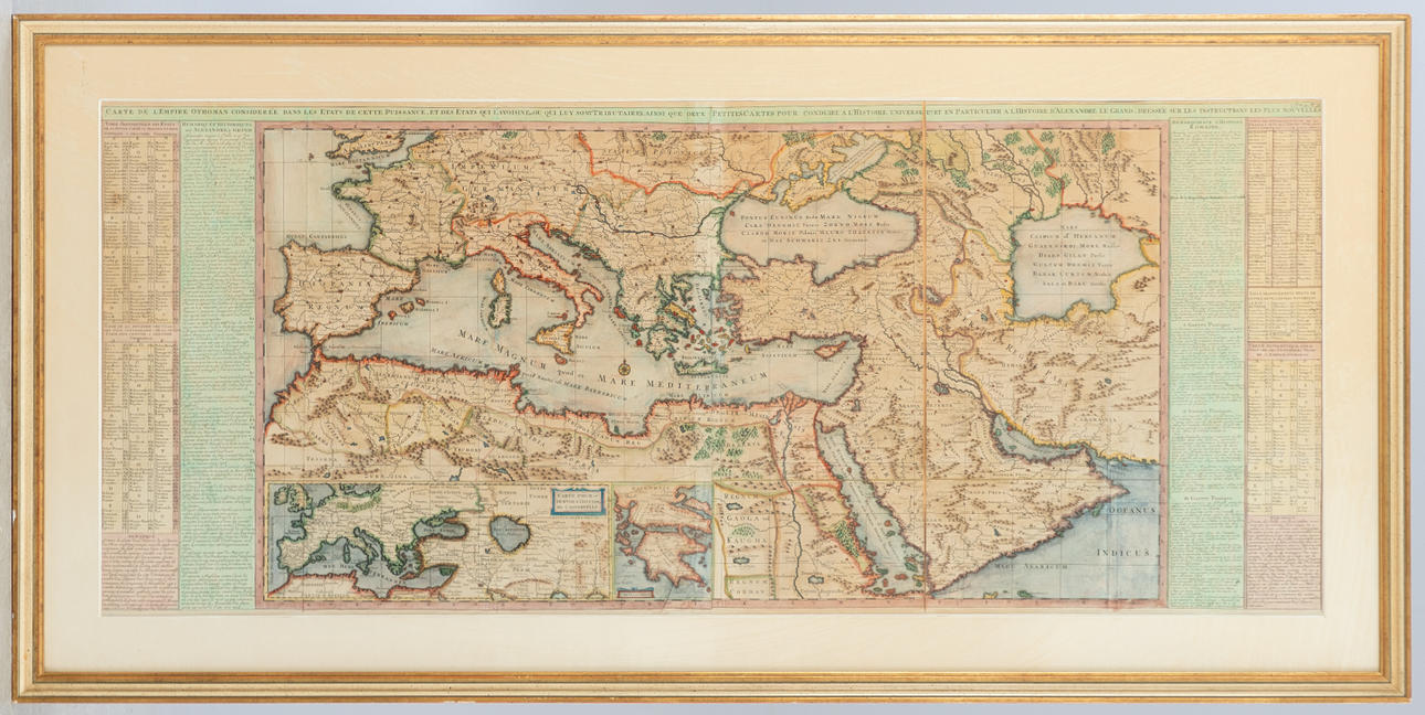 Henri Chatelain (1684-1743), Carte de l'Empire Othoman Consideree dans les Etats de Cette Puissance, et des Etats qui L'avoisine ou qui luy sont Tributaries ainsi que deux Petites Cartes pour conduire a l'Histoire universel, et a l'Histoire d'Alexandre le Grand dressées sur les instructions les plus nouvelles, Kupferstich, koloriert, 18. Jahrhundert, umfangreiche Legenden und Anmerkungen zu beiden Seiten der Karte, gesamt ca. 51 x 120 cm, hinter Passepartout und Glas gerahmt, mit Rahmen ca. 68 x 138 cm.