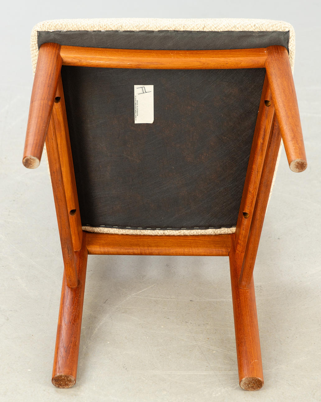 6 Teak Esszimmerstühle von Shou Andersen. Hohe Rückenlehne, Sitzfläche gepolstert und mit hellem Wollstoff bezogen. Mit Etikett bezeichnet.