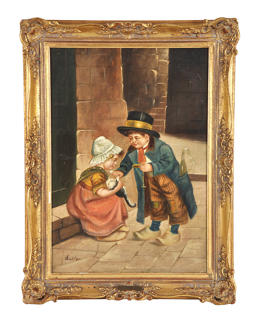 398914. GENREGEMÄLDE. Der Tierdoktor. Bub und Mädchen bei der Katzenrettung.