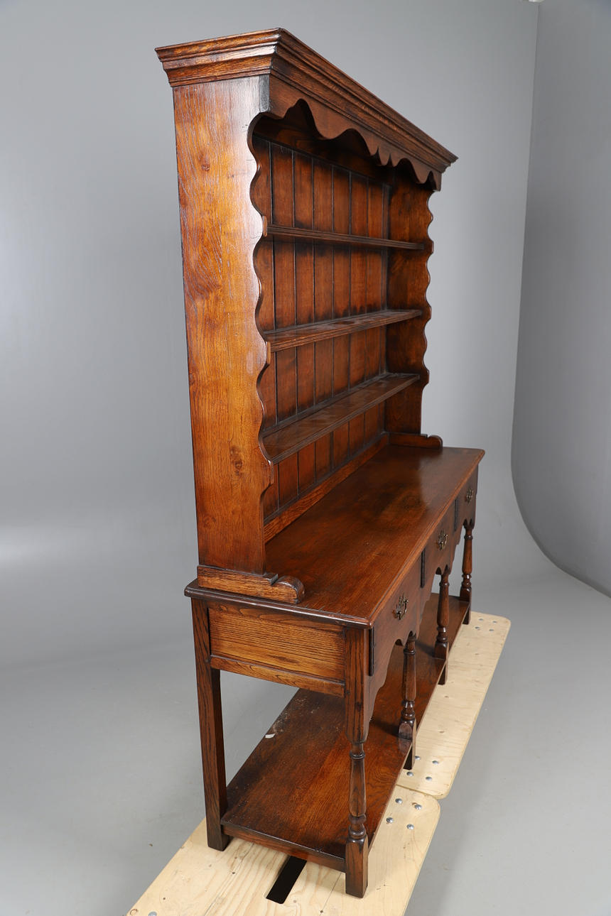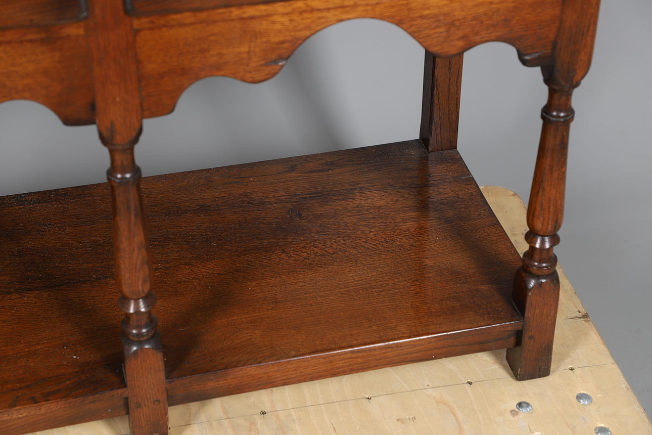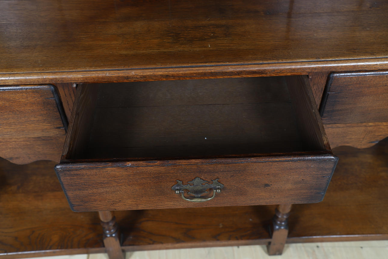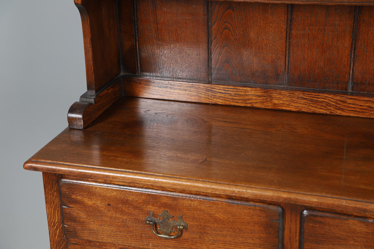 Eine große Kommode aus Eichenholz, der obere Teil mit drei Regalen und einer getäfelten Rückseite, der untere Teil mit drei Schublade, einer geformten Schürze und gedrehten Stützen. 190 cm hoch, 155 cm breit an der breitesten Stelle.