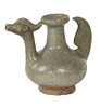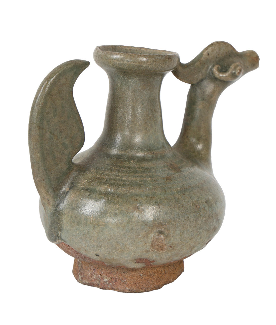 15./16. Jahrhundert, Steinzeug in Form einer Hamsa mit Seladonglasur und eingeritztem Ringdekor, schmaler ausgestellter Hals, 9 cm hoch.