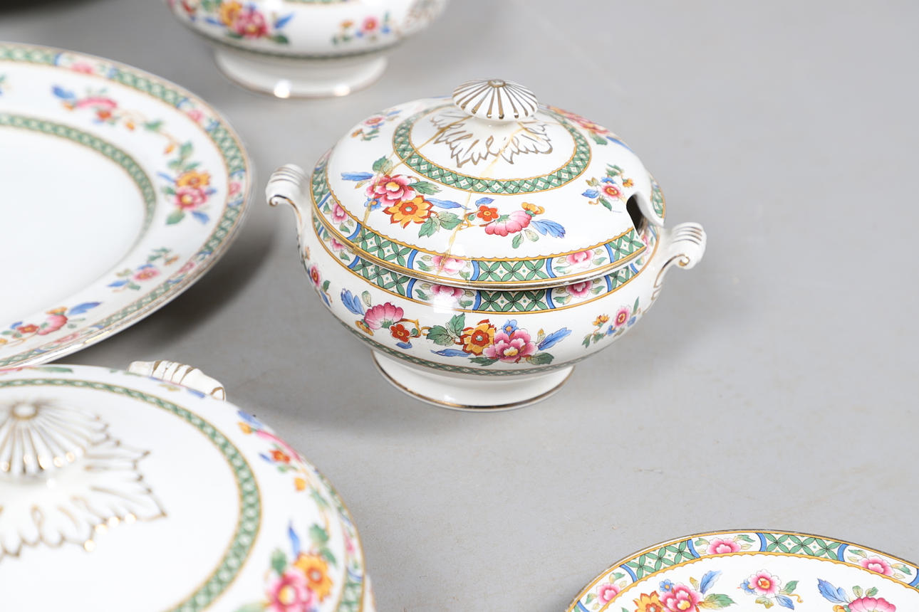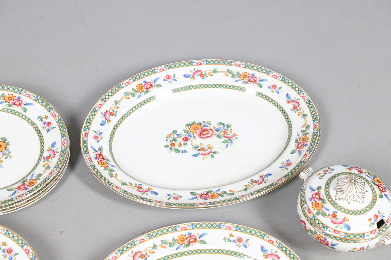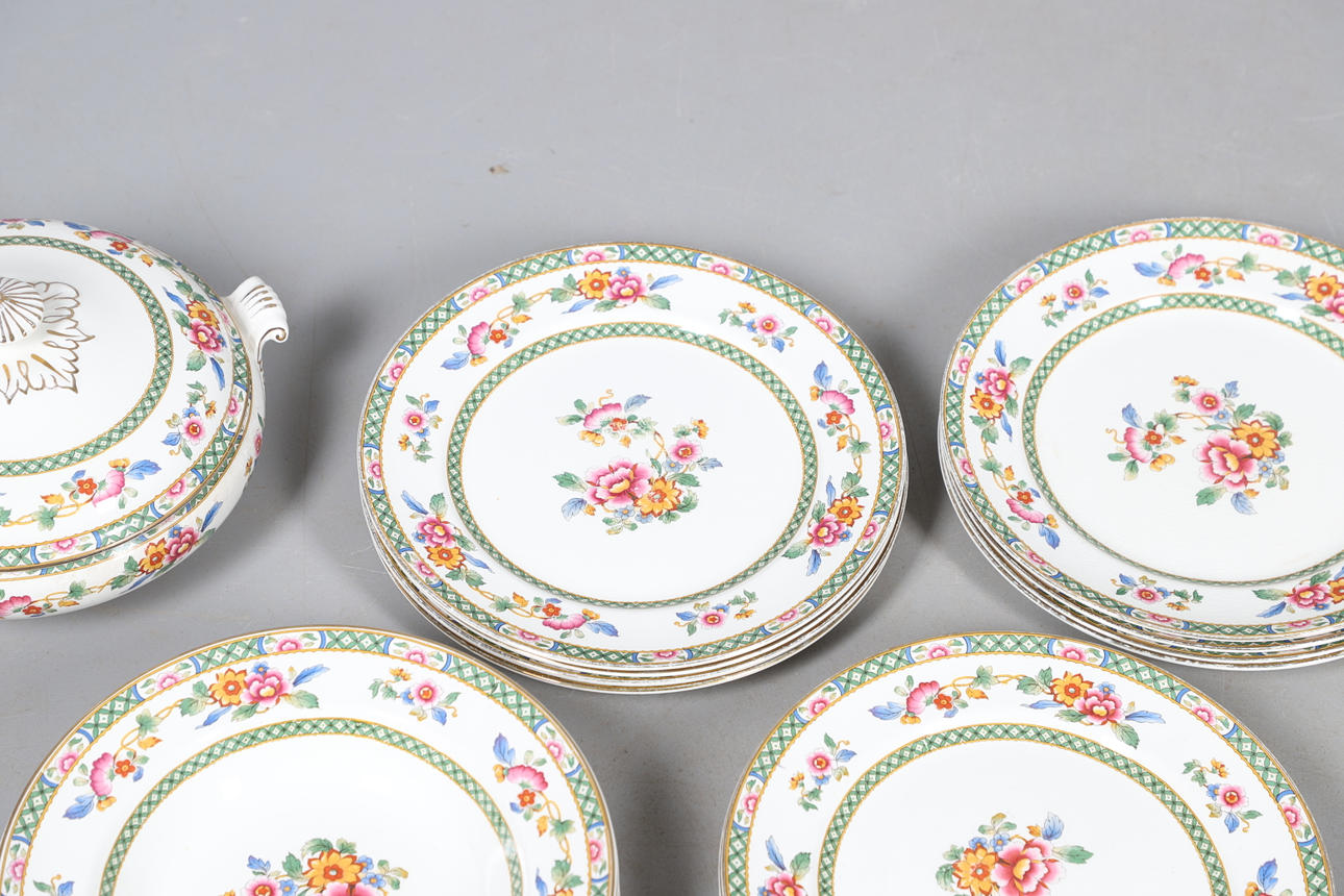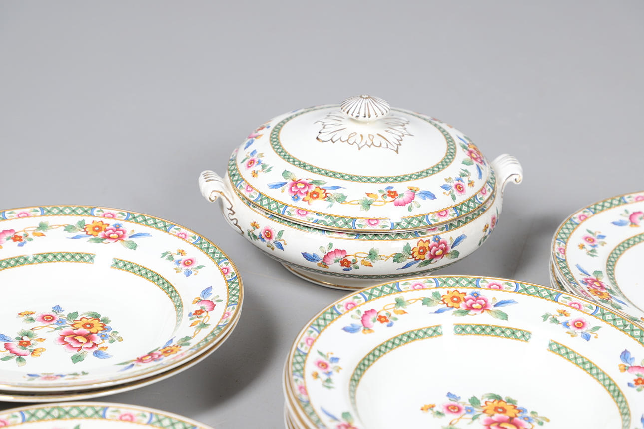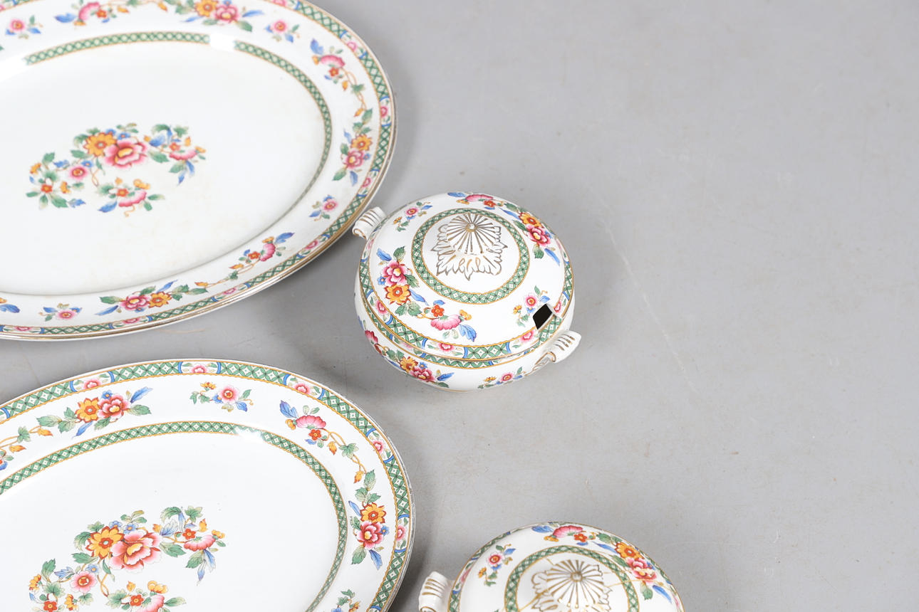 Dazu gehören Schalen, abgestufte Teller und vier Terrinen mit Deckel (zwei große und zwei kleine), alle im gleichen Blumenmuster. Gedruckte Herstellermarken auf den Sockeln, Bridgwood, im Einzelhandel von T. Goode & Co, London. Insgesamt 56 Stück, siehe Online-Bilder.