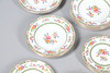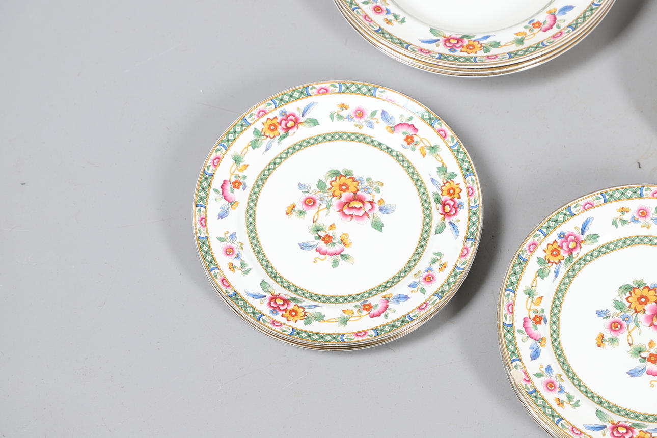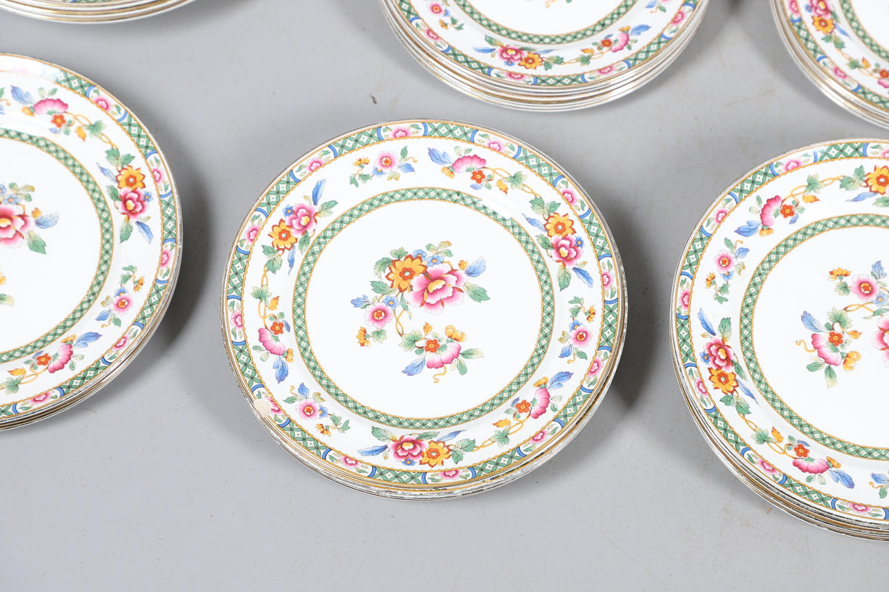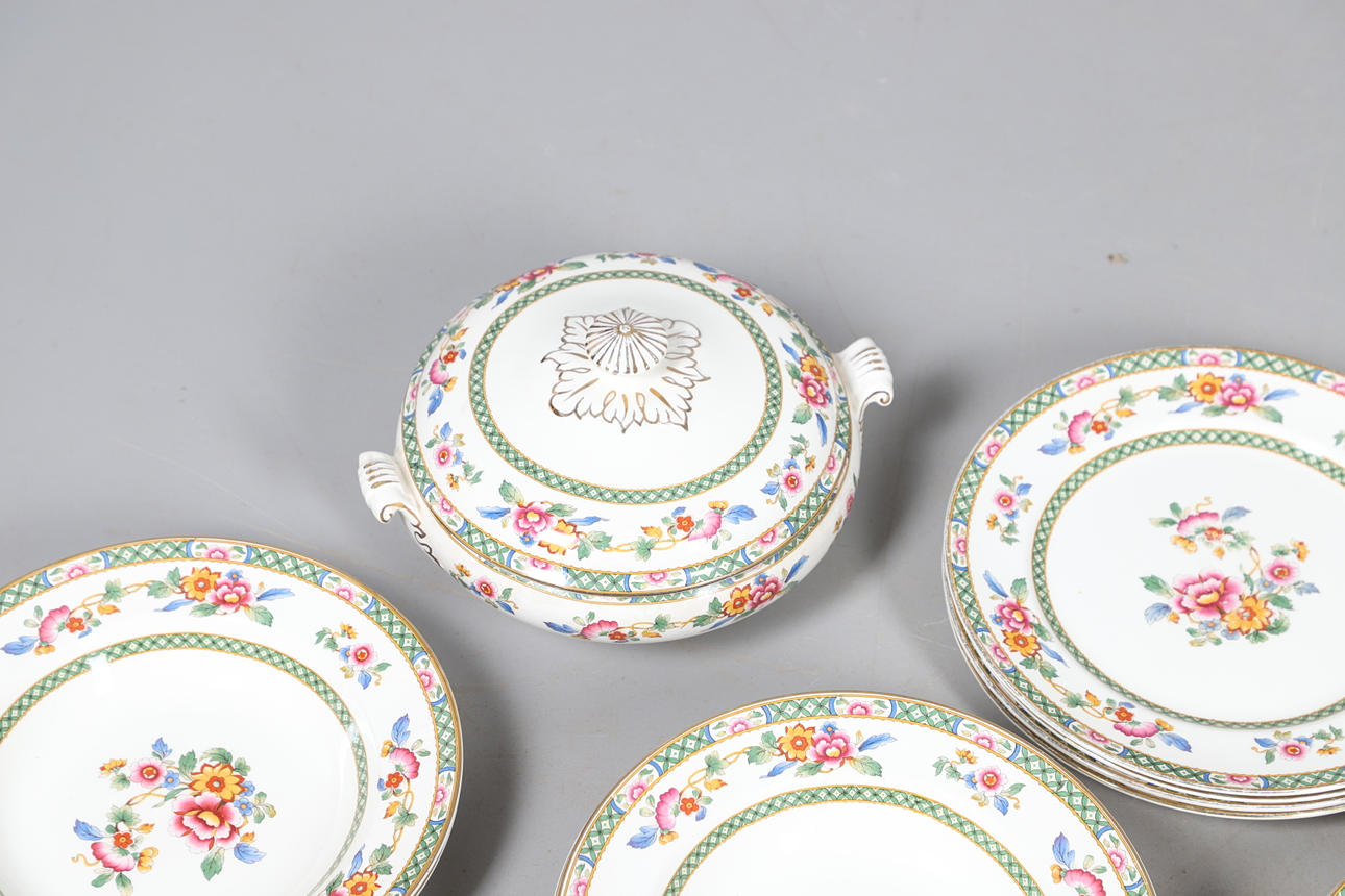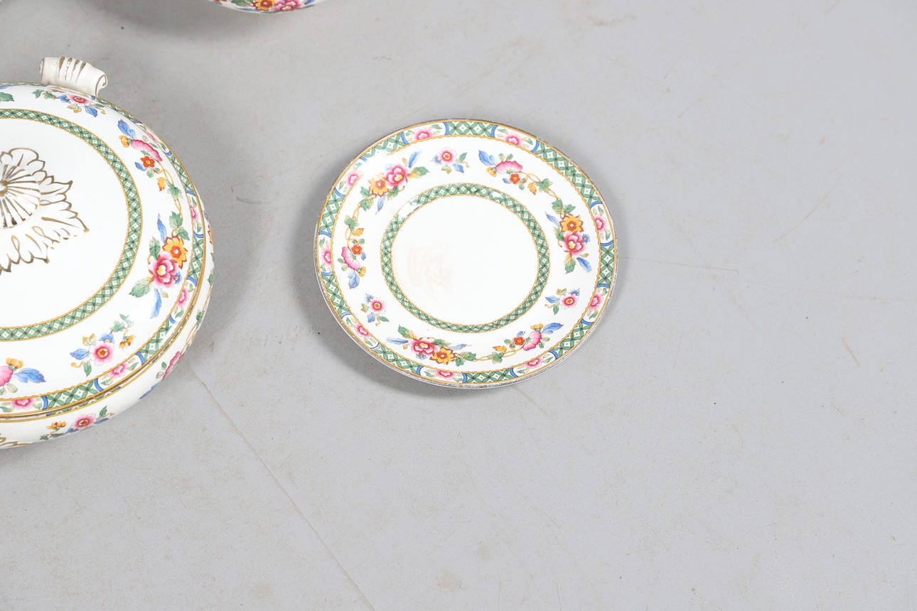 Dazu gehören Schalen, abgestufte Teller und vier Terrinen mit Deckel (zwei große und zwei kleine), alle im gleichen Blumenmuster. Gedruckte Herstellermarken auf den Sockeln, Bridgwood, im Einzelhandel von T. Goode & Co, London. Insgesamt 56 Stück, siehe Online-Bilder.