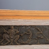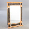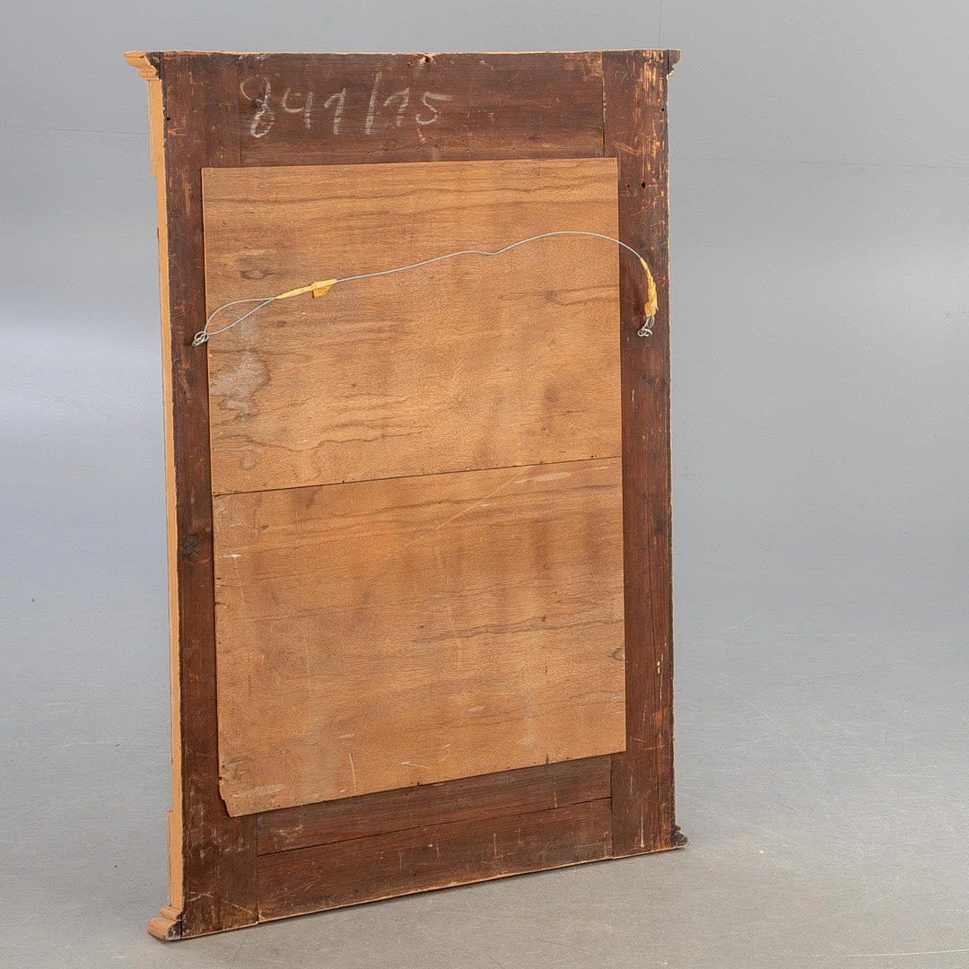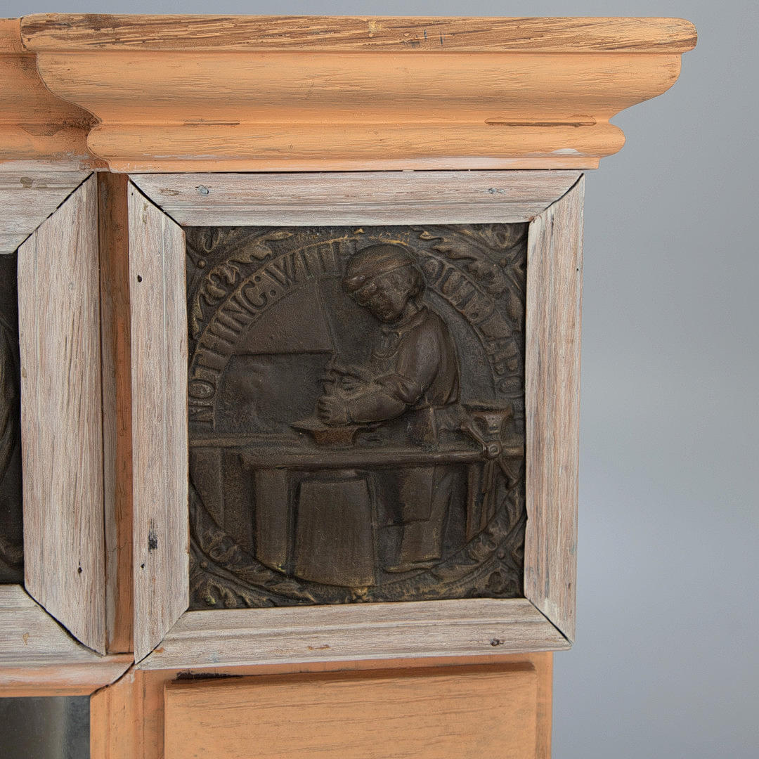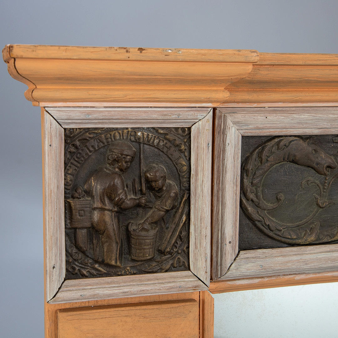 Holz, gelb-beige und grau-weiß gefasst. Rechteckiger Rahmen mit getrepptem Giebel. Seiten mit vertieften Füllungen aus Blech mit hochgedrückten, figurativen Darstellungen. HxB: ca. 118 x 83 cm.