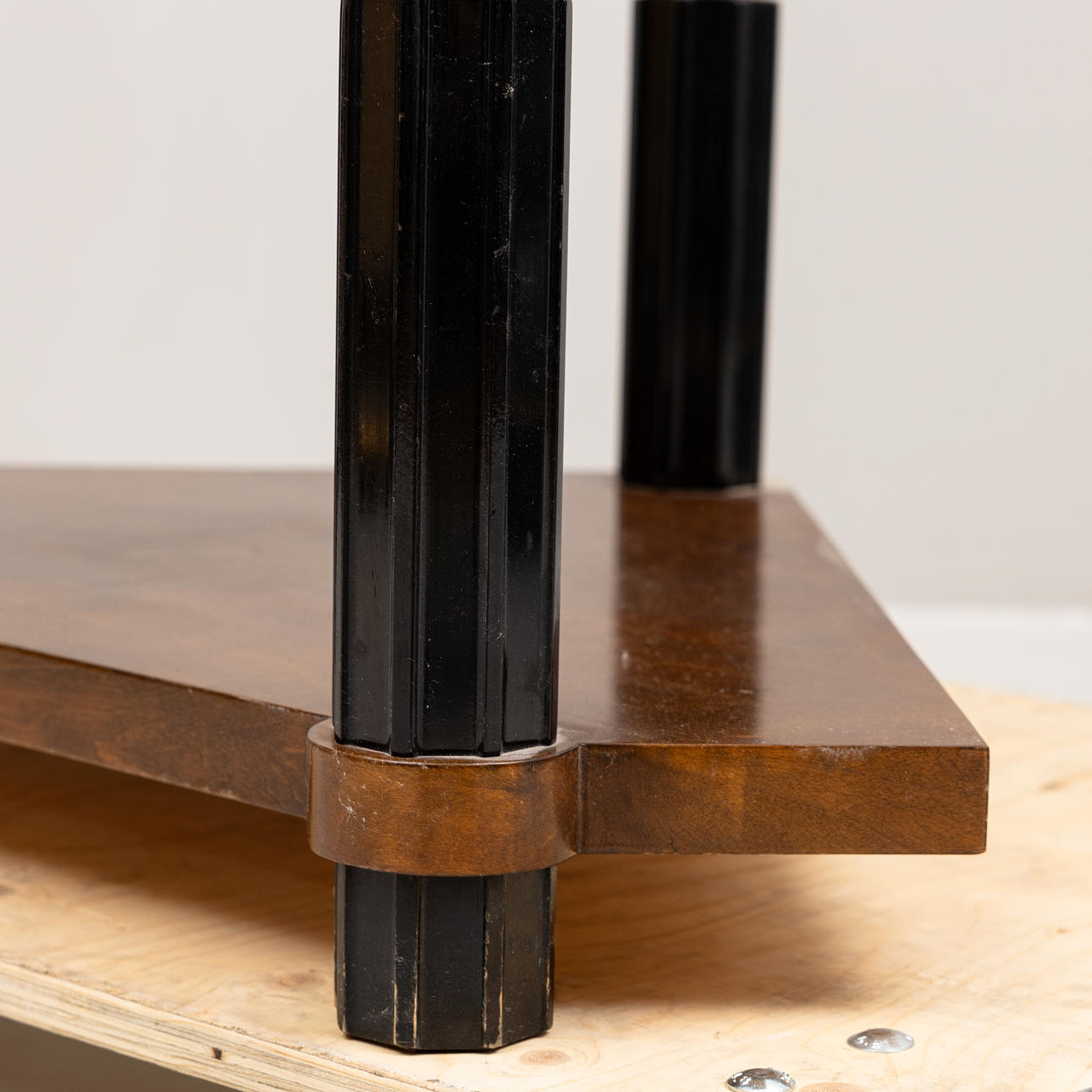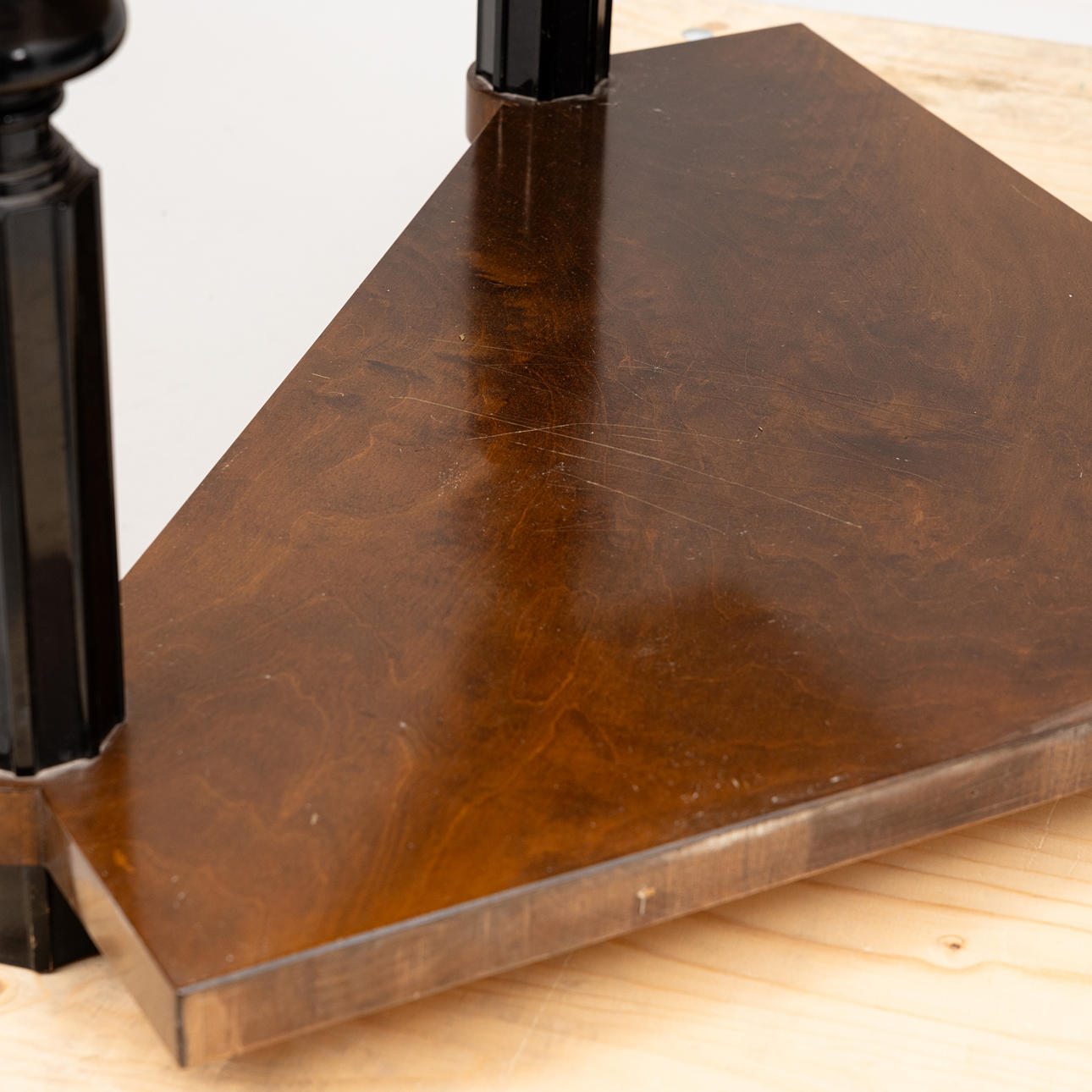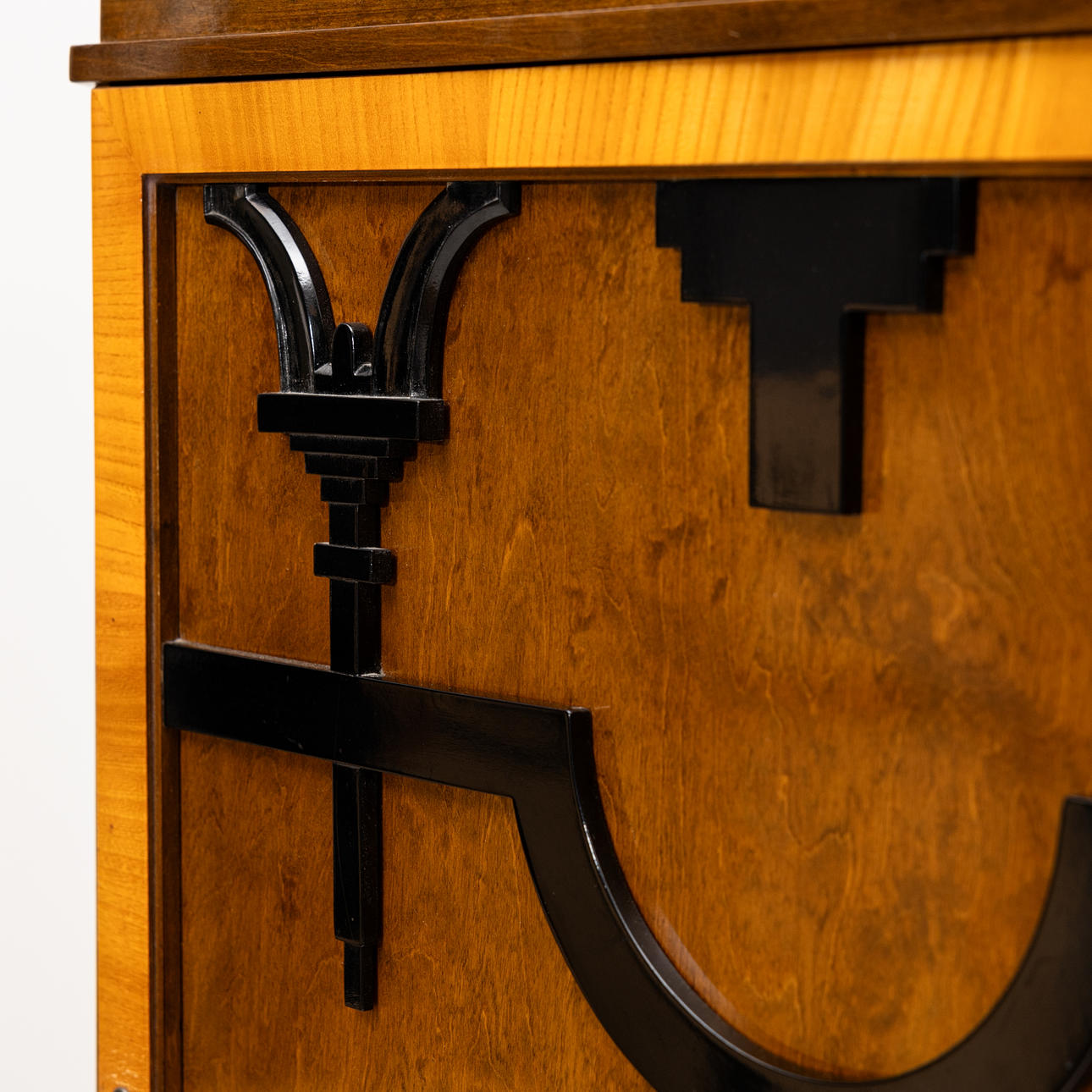 Furniert mit feuriger Birke und Makassar und geschwärzten Reliefdetails an der Schranktür, im Inneren des Schranks, Klappklappe, drei elegante Beine mit gedrechseltem Dekor und Kannelyr. Breite 90, Tiefe 57, Höhe 144 cm.