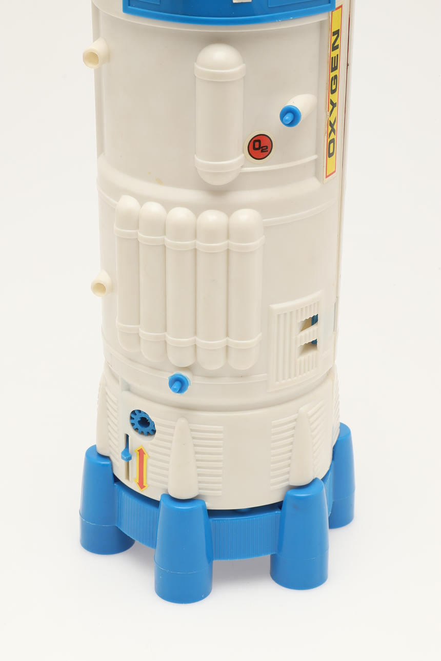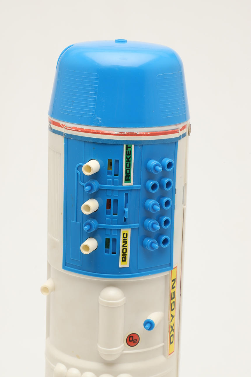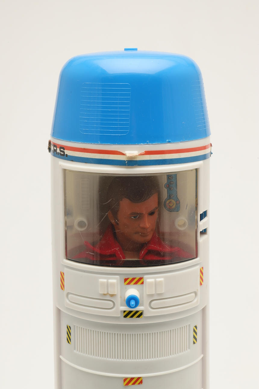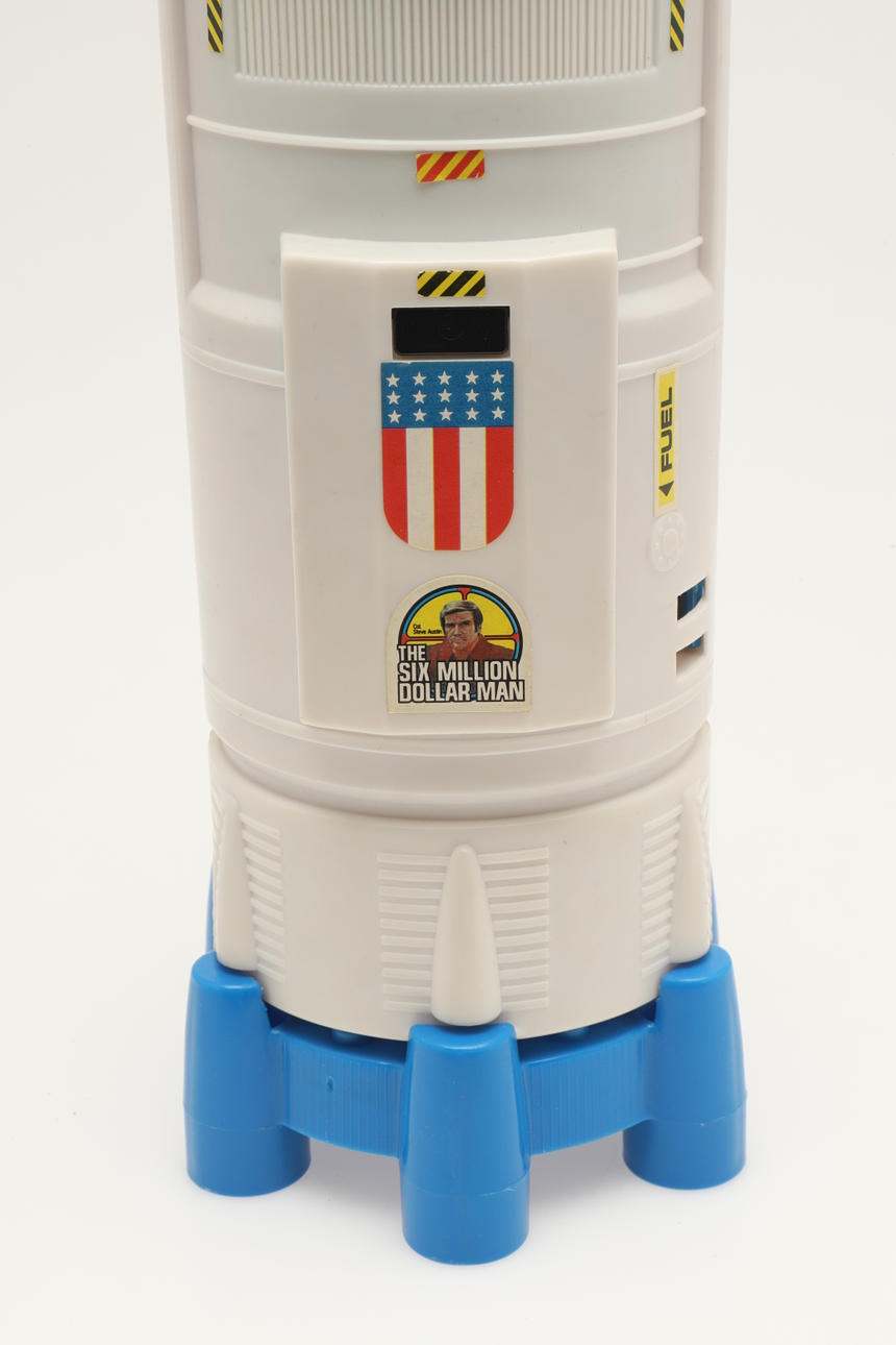 Eine alte Figur von Steve Austin aus den 1970er Jahren in der Six Million Man-Rakete. Keine Box, 45 cm hoch.