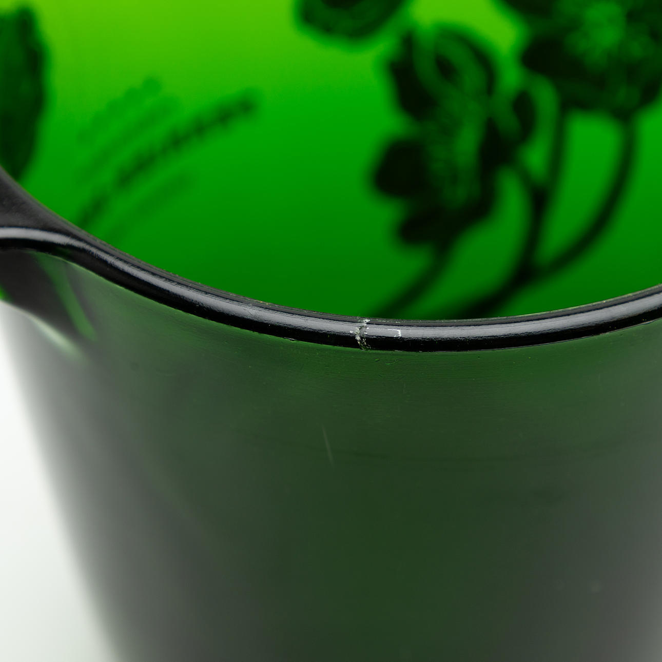 Grünes Glas mit handbemalten und emaillierten mehrfarbigen und goldfarbenen Blumen.