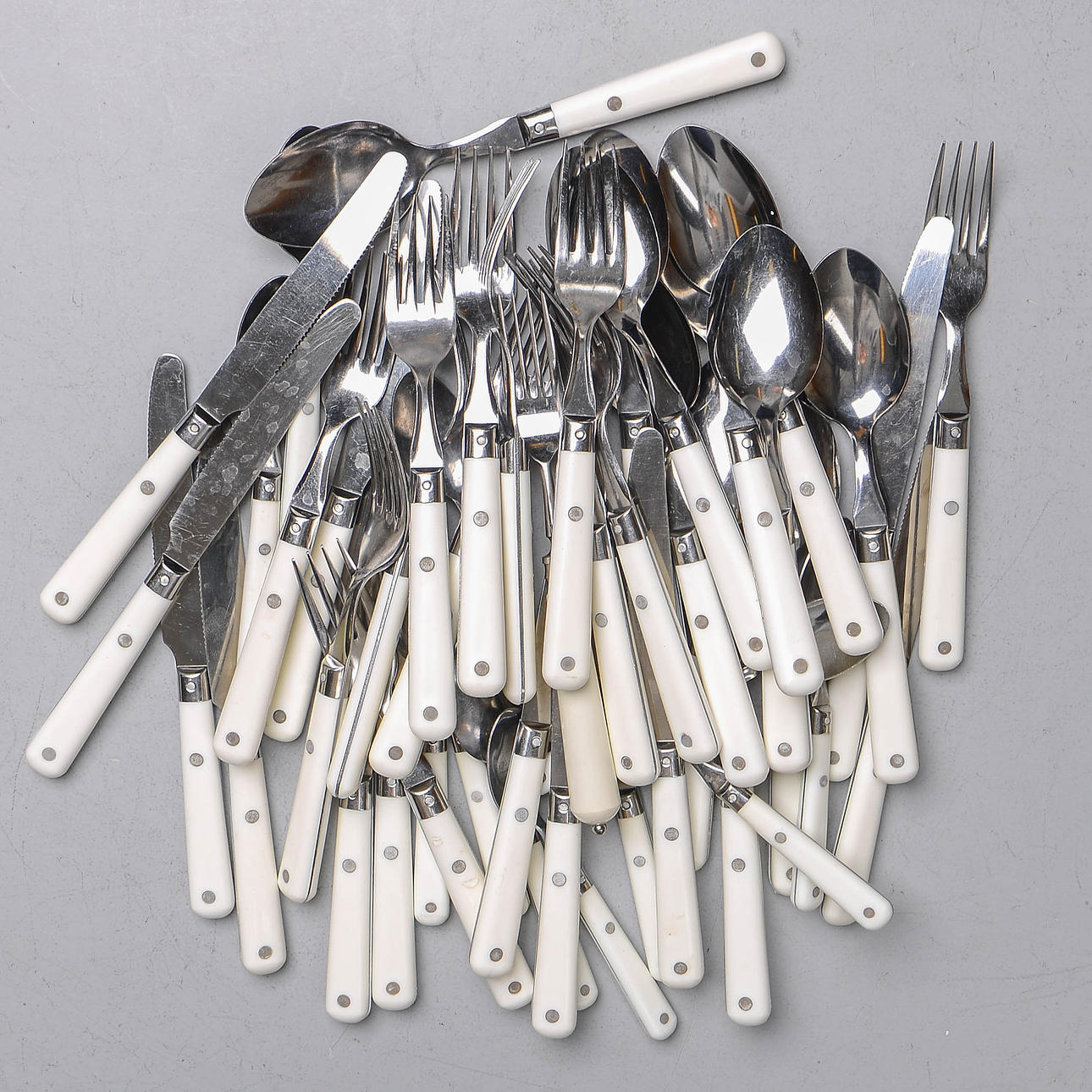 Edelstahl und Kunststoff 12 Messer, 12 Gabeln, 11 Löffel, 11 Teelöffel.