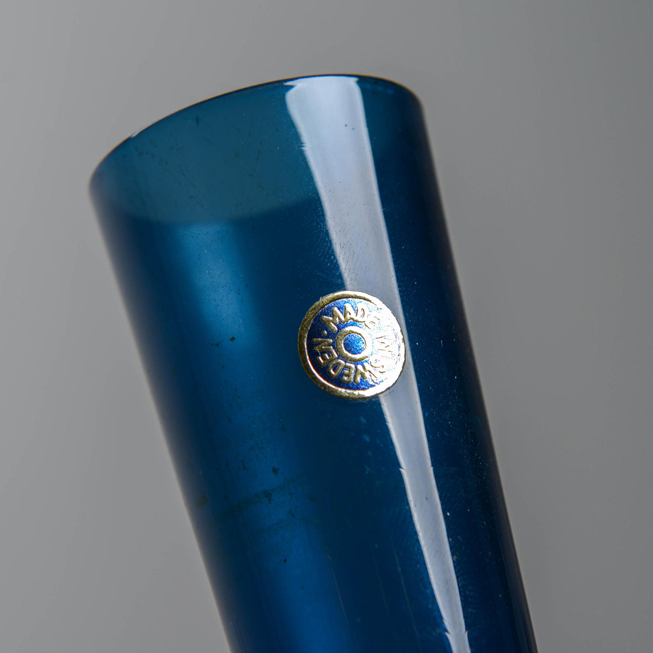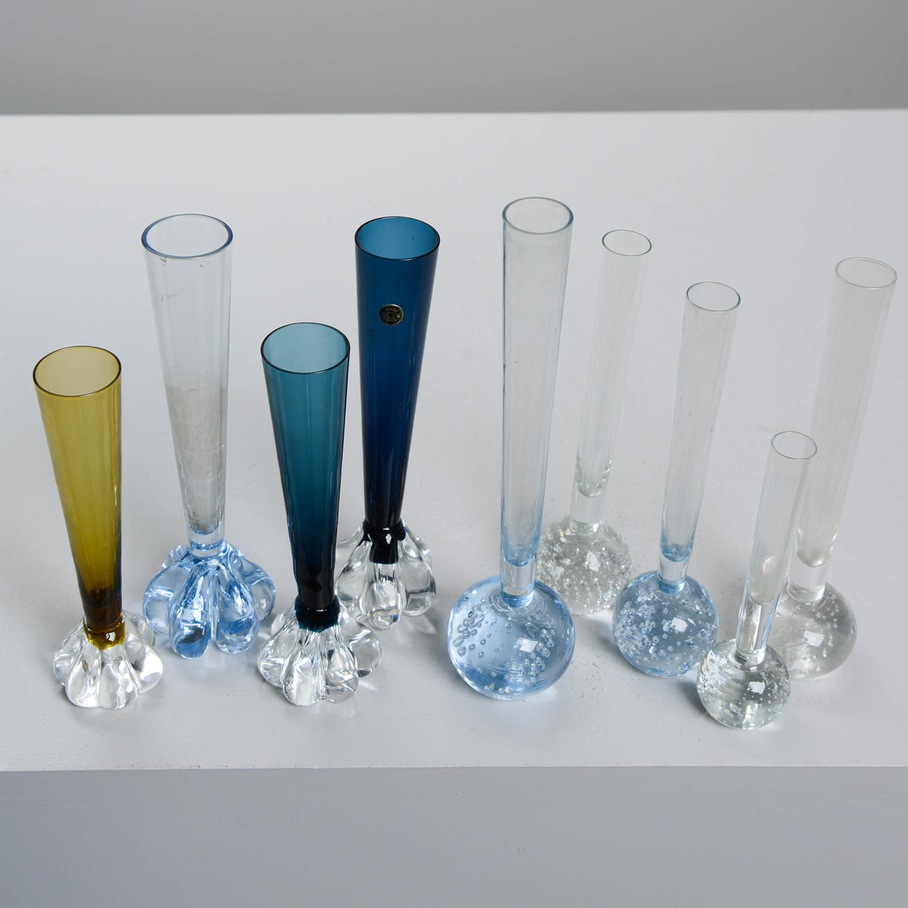 Schmale Vasen aus Glas, teilweise Buntglasmasse. Vasen von Kosta mit Dekoration von Luftblasen in den Füßen. Einzelnes Etikett markiert.