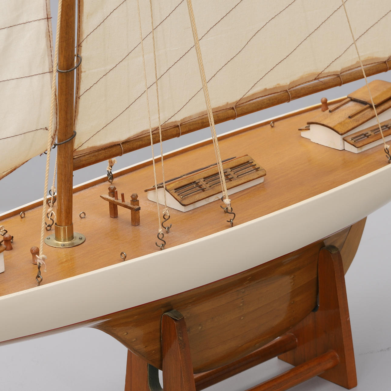 Segelboot auf Stand. Rahmen aus Holz, teilweise weiß lackiert. Länge ca. 118, Breite ca. 18, Höhe mit Ständer ca. 118 cm.